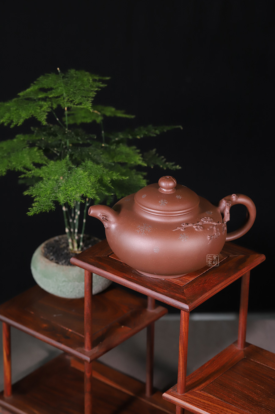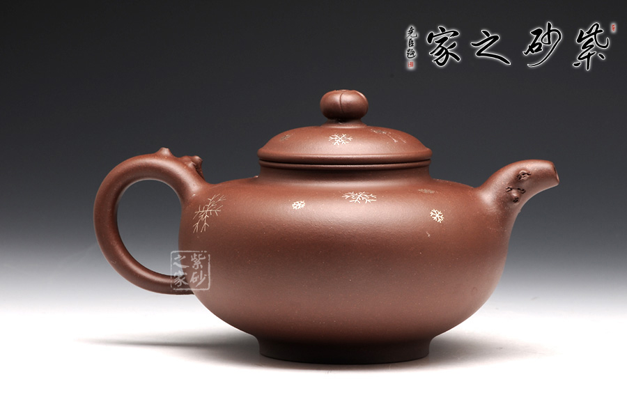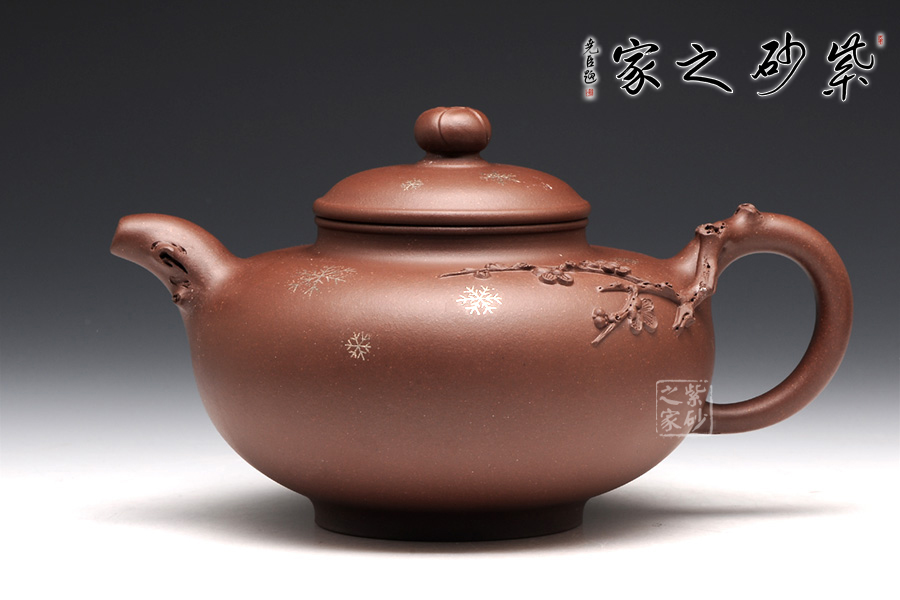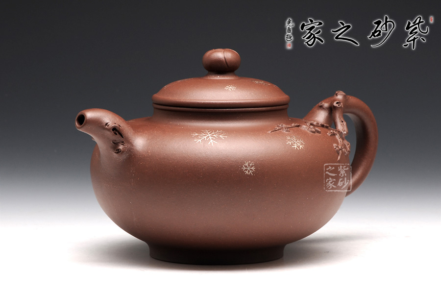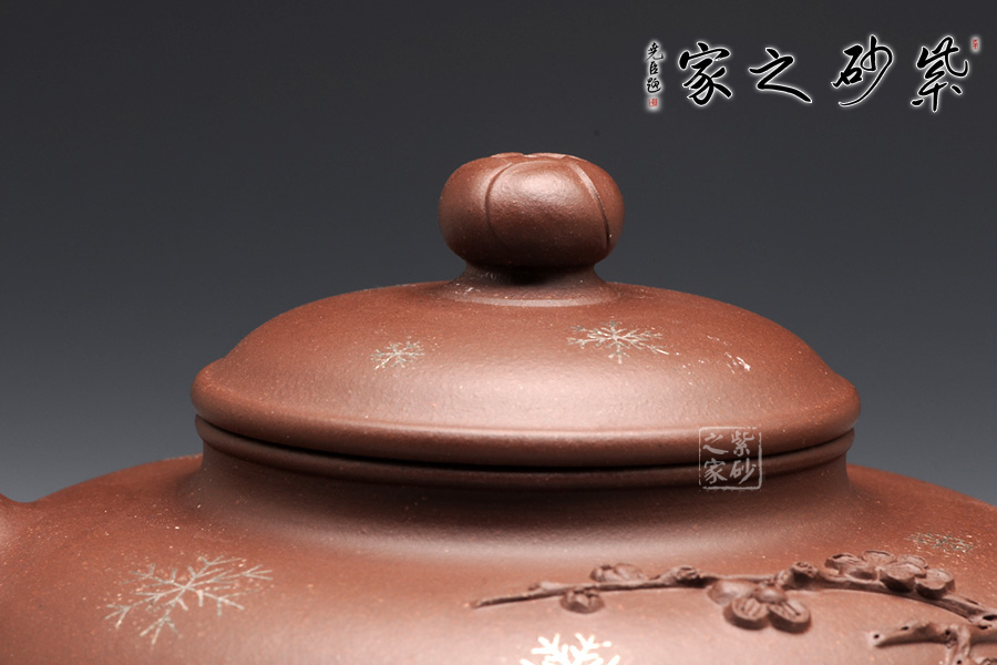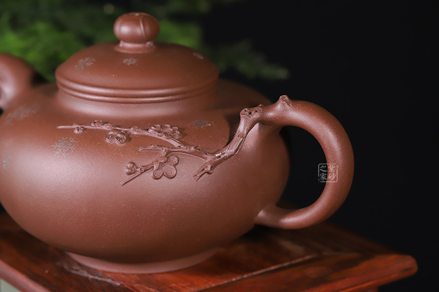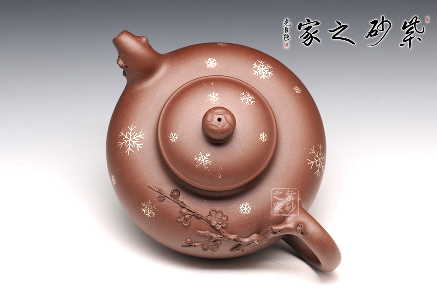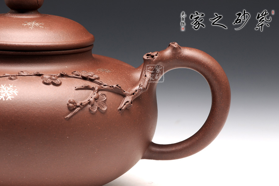 壺整體扁圓謙和,大肚乃容。壺蓋與壺身子母線壓合,諧美;壺頸的續(xù)出,更顯得一絲委婉。壺鈕圓珠如含苞待放的臘梅,清雅淡然。整壺以冬天傲然的臘梅作為設(shè)計(jì)元素,在壺把和壺嘴皆為古藤老枝的驅(qū)趕,塑造生動(dòng),更顯真意。在壺把與壺身連接之處,徐徐緩生而出的梅枝給人帶來(lái)一種暗香。壺身周?chē)c(diǎn)點(diǎn)雪花,更為細(xì)膩的表達(dá)了意境,可謂值得體味,不容錯(cuò)過(guò)