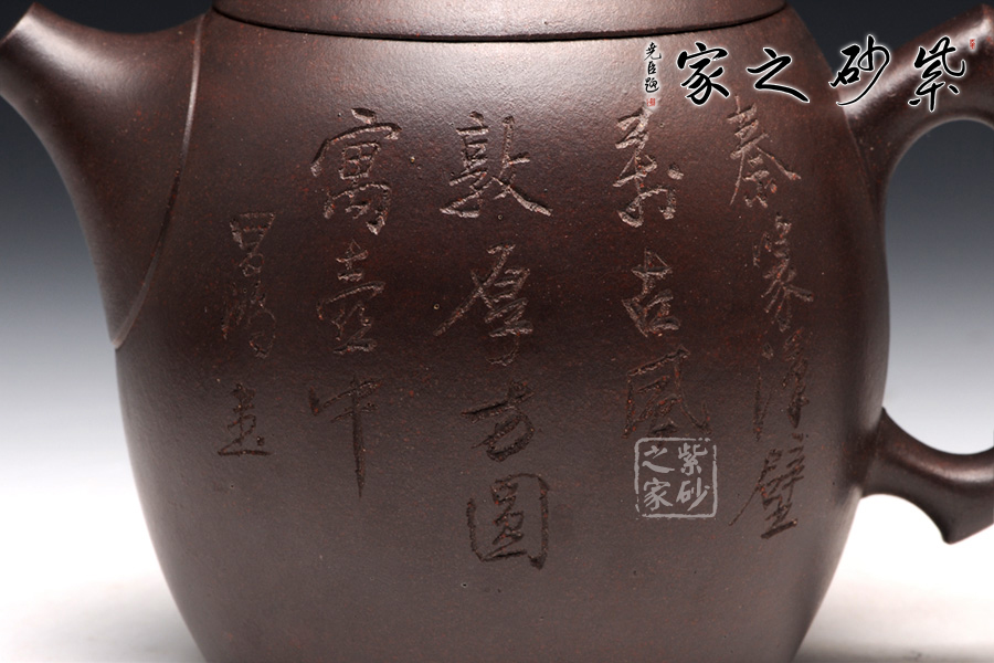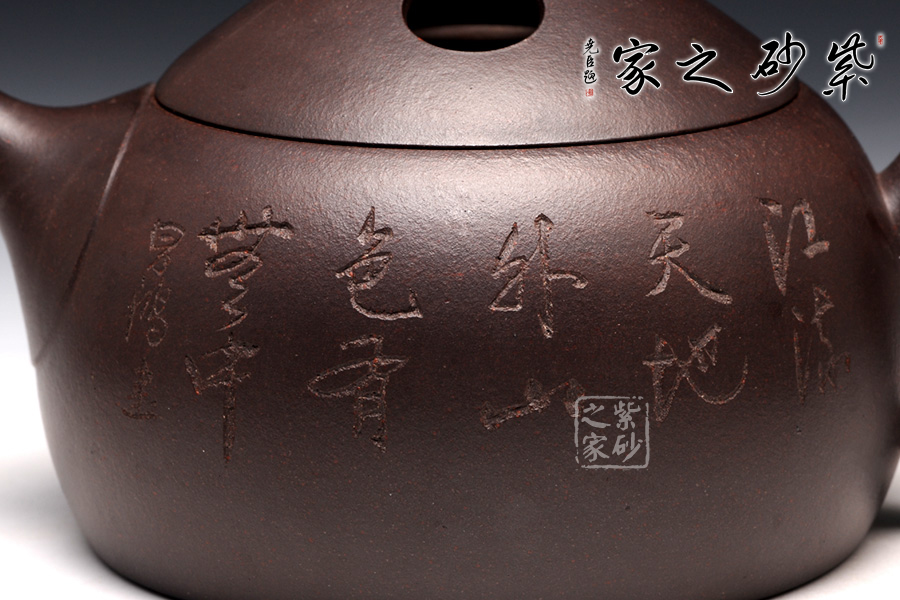 A面: 裝飾: 詩(shī)詞 裝飾者:李昌鴻 裝飾內(nèi)容: 高款刻繪:“秦磚漢瓦蘊(yùn)古風(fēng),方圓敦厚寓壺中?!? 矮款刻繪:“流江天地外,山色有無(wú)中”