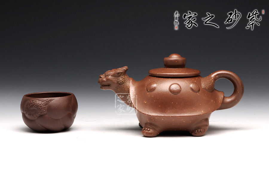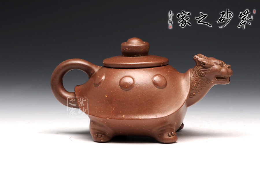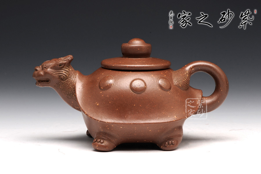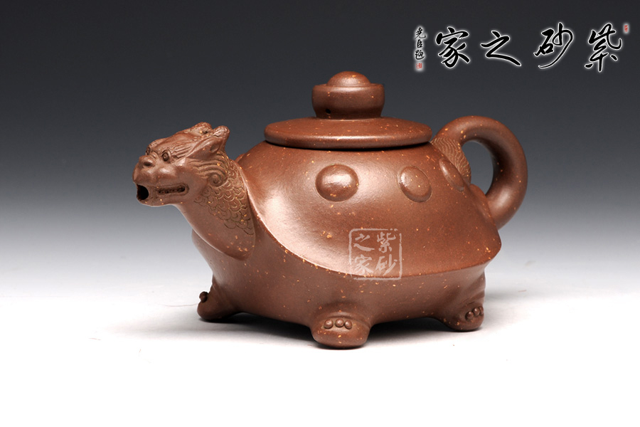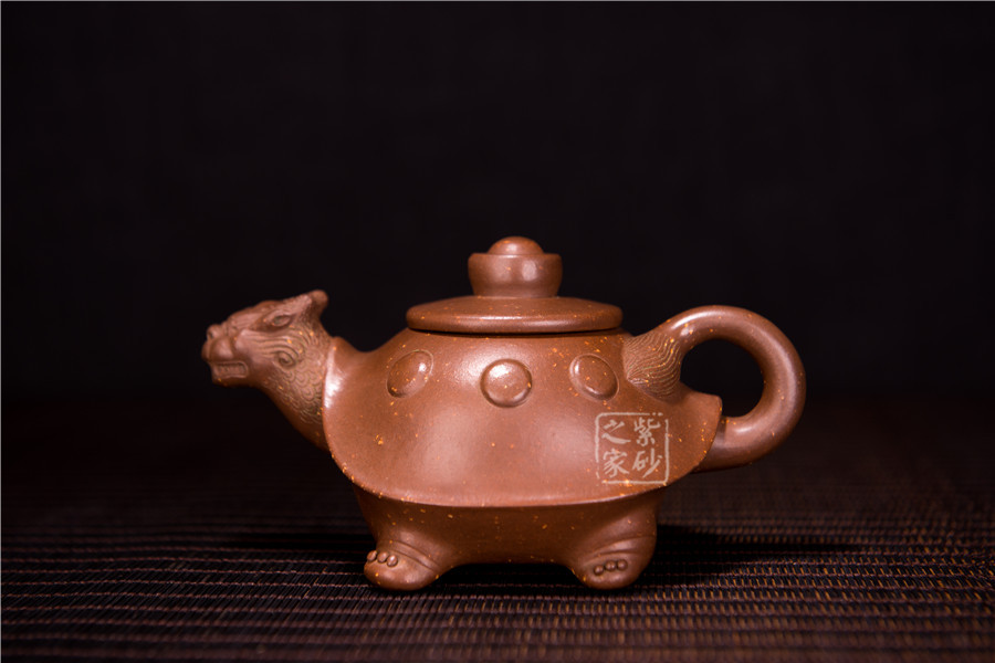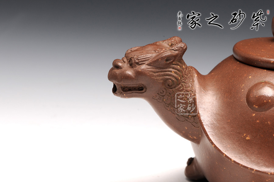 壺型就是一只龜龍,腹部扁圓且上下分明,前后線條粗細漸變,甚得其型。壺嘴就是龍首,昂然挺立,眉眼分明,氣勢不凡。壺把是尾巴,粗細漸變且上翹連到壺身,美觀自然。壺蓋平蓋押韻,壺鈕為一元寶,富貴吉祥承載美好愿景。底部是四足而立,穩(wěn)重踏實,更加仿真。