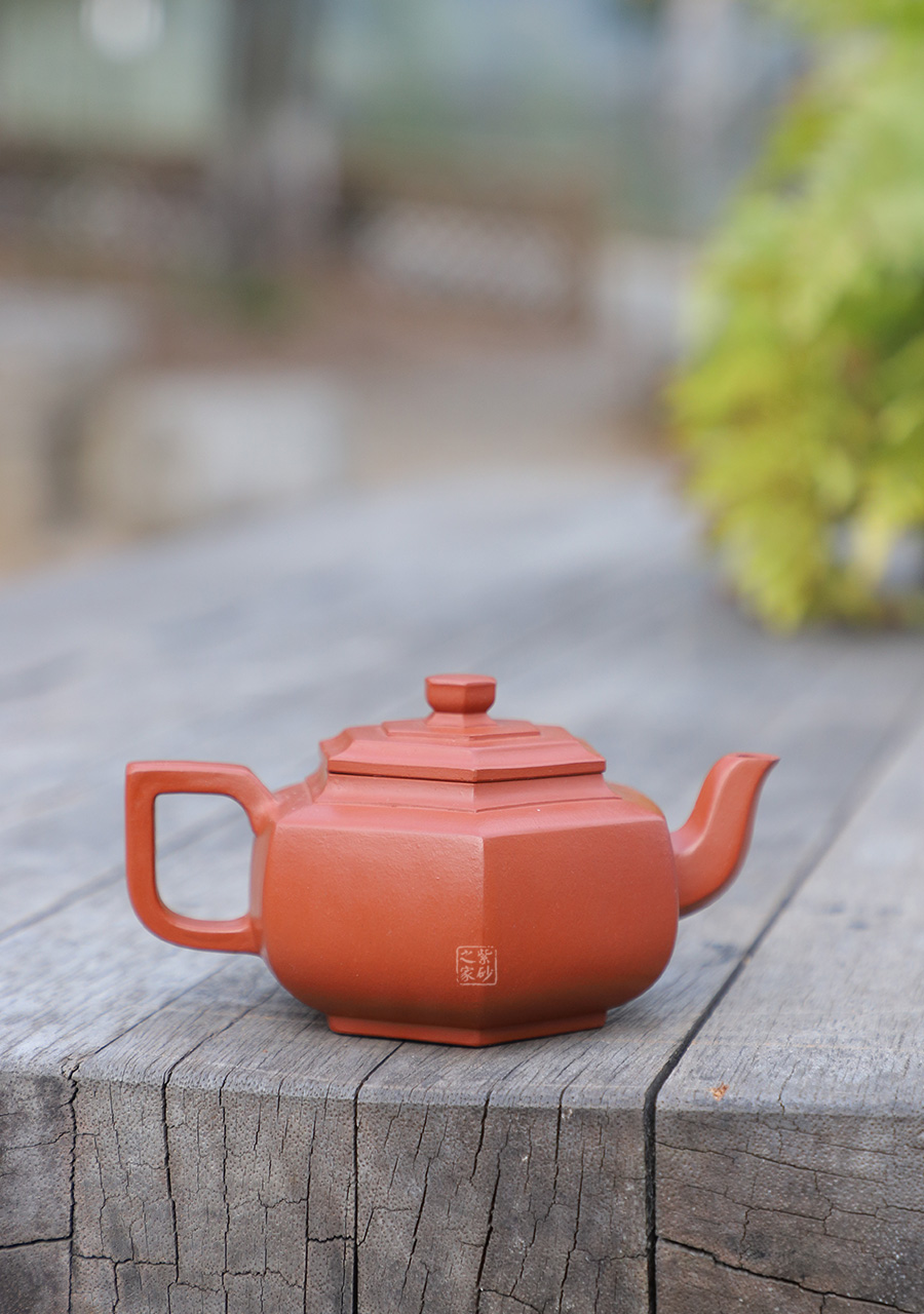 朱泥是原礦呈金黃色或淺黃綠色的紅泥,明代稱“石黃泥”,清代稱“朱泥”。原礦深埋于宜興丁山鎮(zhèn)趙莊山嫩泥礦層的底部,外觀呈咖啡黑色,煉制成泥后稱“朱泥”。用熱水沖淋朱泥壺,立展嬌艷的鮮紅色,氤氳中有紫光游移,泡養(yǎng)包漿后紅色沉穩(wěn)。