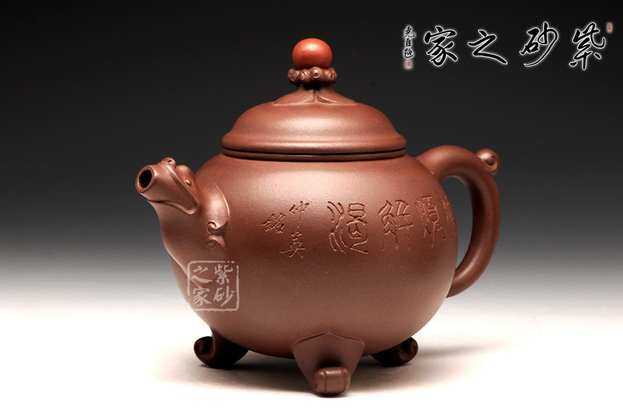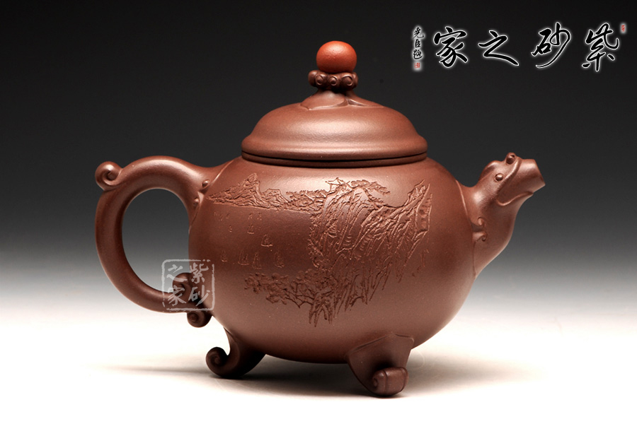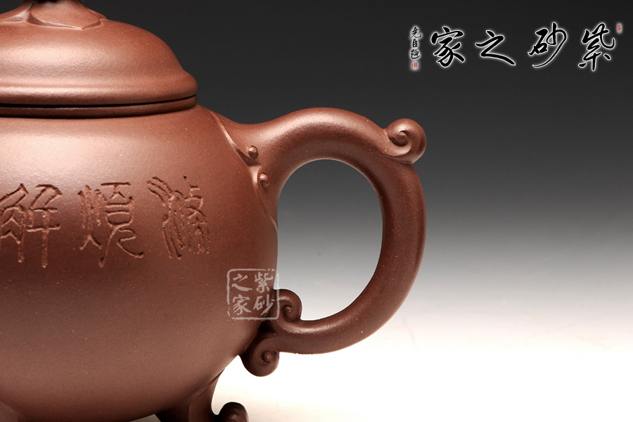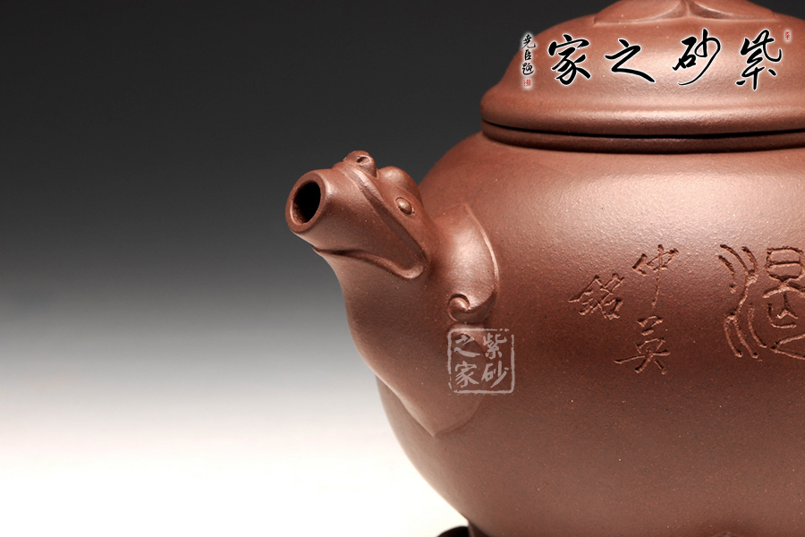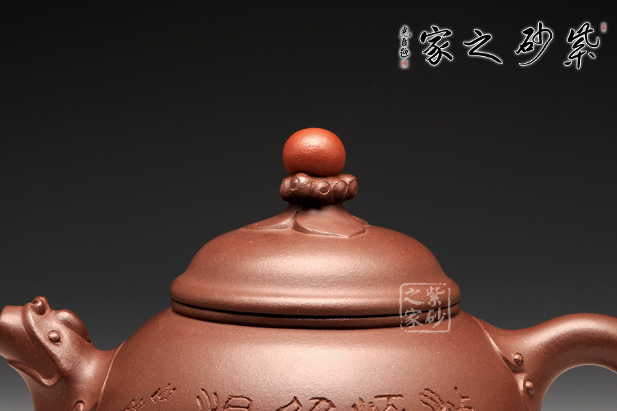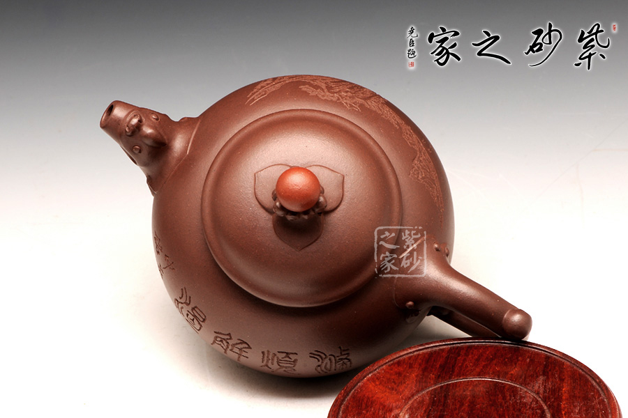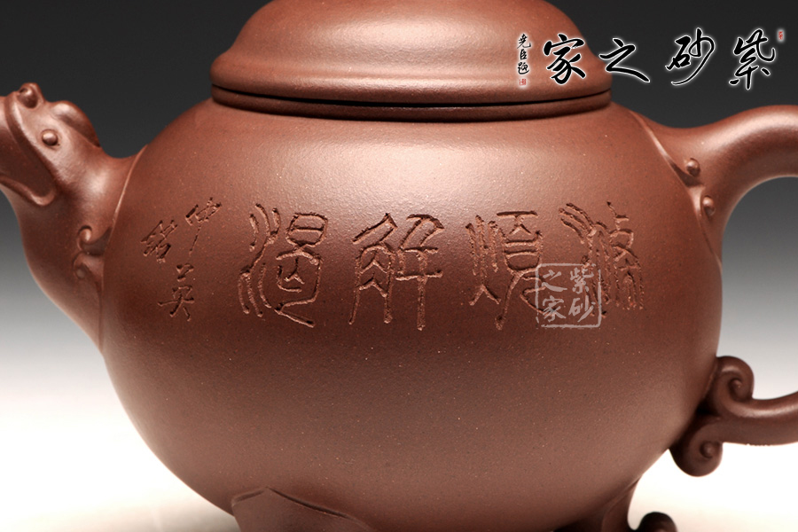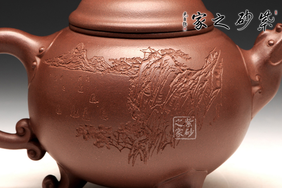 咸子情借香爐的古韻造型成就此壺,壺身圓潤(rùn)如珠,線(xiàn)條流暢,壓蓋式,子母線(xiàn)嚴(yán)絲合縫,緊密貼合,氣密性良好,蓋面高聳光亮如鏡,祥云托起的紅珠壺鈕是此壺的點(diǎn)睛之處,與主題契合,工藝精致傳神,適于拿捏,不拘一格更是錦上添花,壺嘴、壺把呈雙龍?jiān)煨停瑲鈩?shì)雄壯威嚴(yán),壺底足部精巧典雅,古韻橫生。壺身裝飾刻繪由咸子情的父親——任淦庭傳人、濟(jì)公壺創(chuàng)始人、研究員級(jí)高工咸仲英(冰心)操刀,刻繪內(nèi)容為“茶熟壺溫”四字,字體蒼勁古樸,端正大氣;壺身背面篆刻的是一幅風(fēng)景畫(huà),古韻悠然。