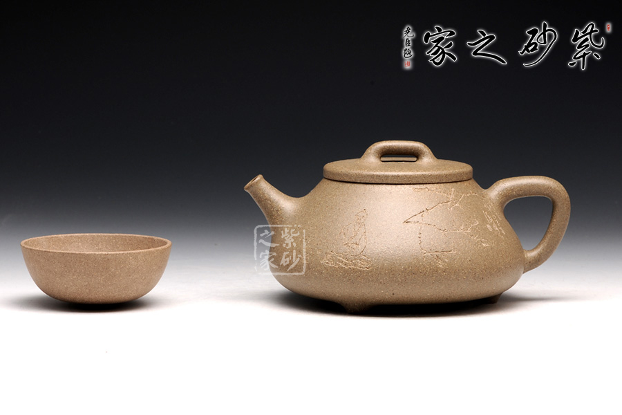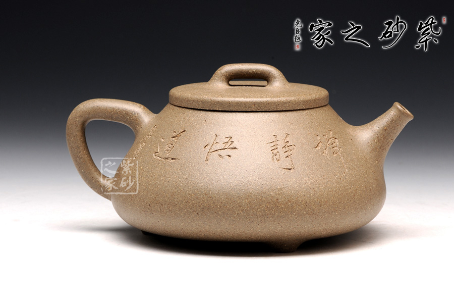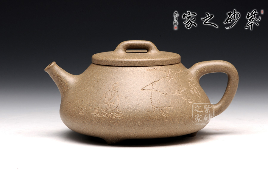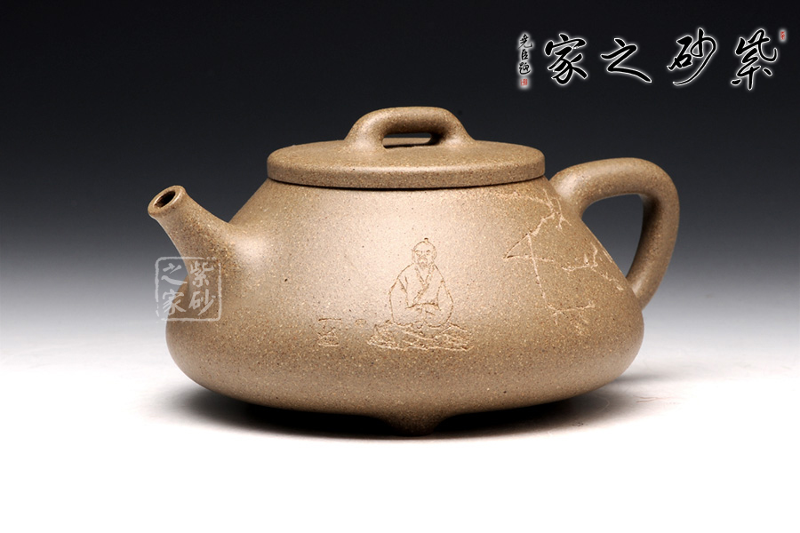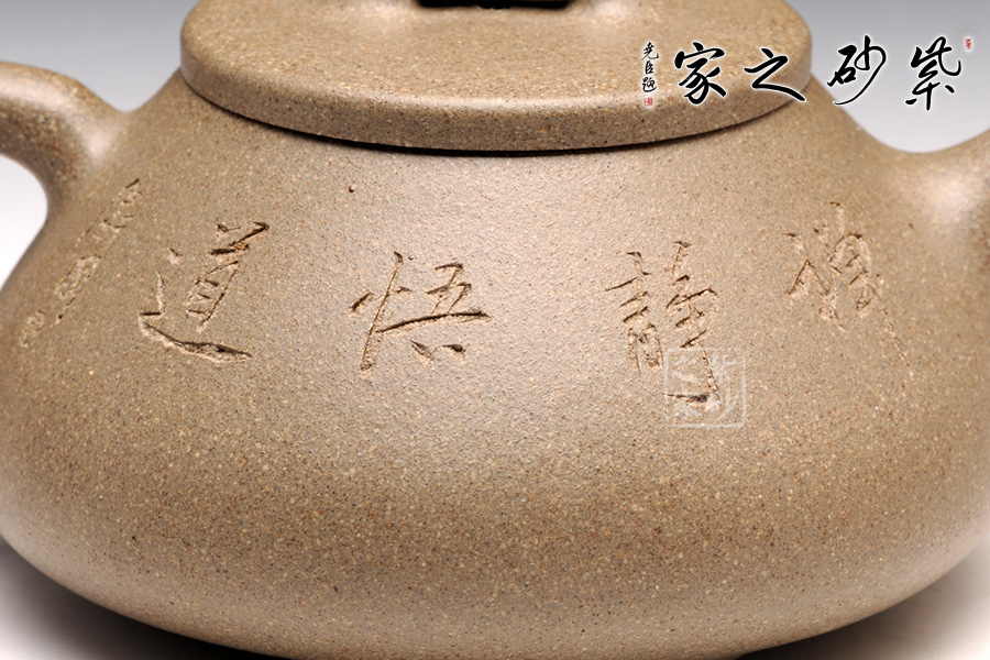此款石瓢壺造型簡練,敦厚調(diào)和,壺身圓潤,線條柔和, 壺嘴為修長的直流嘴,暗接手法與壺身相連,倒三角壺把同樣采用暗接手法與壺身相連,而壺嘴與壺身兩者遙相對望,相對稱。壺鈕為橋型平鈕,銜與壺口平蓋之上。愛壺者如果再仔細看,可看出整個壺型呈由兩個等腰三角形結(jié)合而成,首先壺身是大三角,而壺把內(nèi)是小三角,相當穩(wěn)重的三角形再加上三乳足鼎立,整個器型便更加穩(wěn)實。