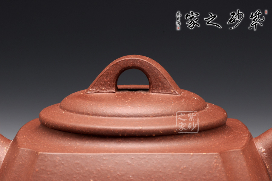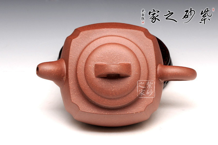 四方抽角不但有方形的神韻所在,也有圓的氣韻所在,所謂“方非一式,圓不相一”,方與圓的藝術(shù)在盧寧剛的老師手里表現(xiàn)得淋離盡致,將兩者完美的融合,壺身線條有圓潤的弧線特點也有方器線條干凈利落,明快挺秀之感,要做到如此效果對紫砂藝人的要求也是極高的。