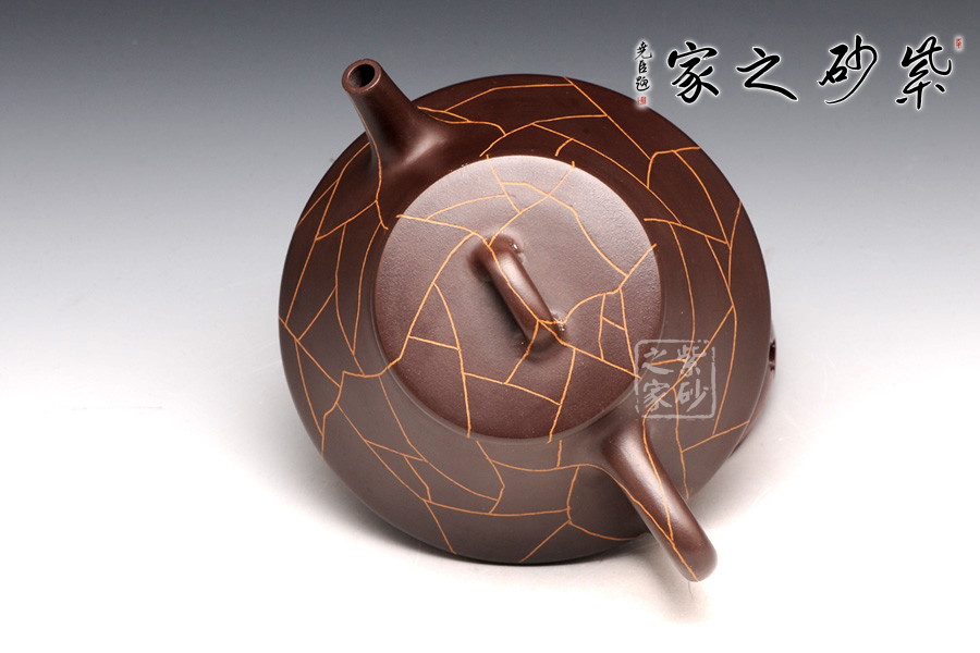 壺橋形壺鈕,中間略顯平整,整款壺更加穩(wěn)重。壺身較矮,梯形狀的壺身,線條緩和均勻至壺底。從整體來看,此壺的的流把均顯細膩,直流嘴挺峭而出,與壺把的三角形相應和。同時,也與壺鈕的形態(tài)形成對應。冰紋裝飾讓此壺美感增強,紋理獨到讓人神思無限,該壺值得珍藏和把玩。
