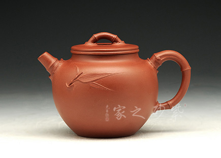 其竹造型作品蒼勁有力、硬朗俊秀。凡貼竹葉,往往信手為之,故每個(gè)壺上的竹葉之角度、動(dòng)勢、造型極少相同。又制桃葉之壺,取名“桃韻”,清靈可愛。壺上的桃形裝飾源于雕塑功底,每把壺上亦各個(gè)不同,甚少重復(fù)。