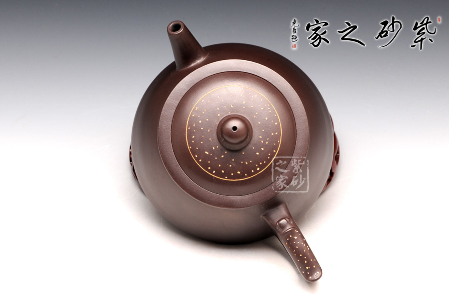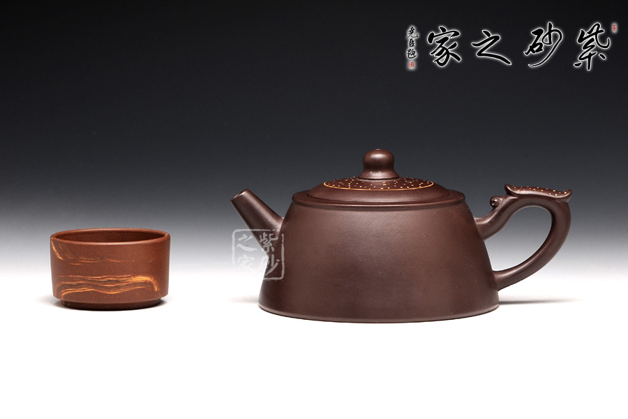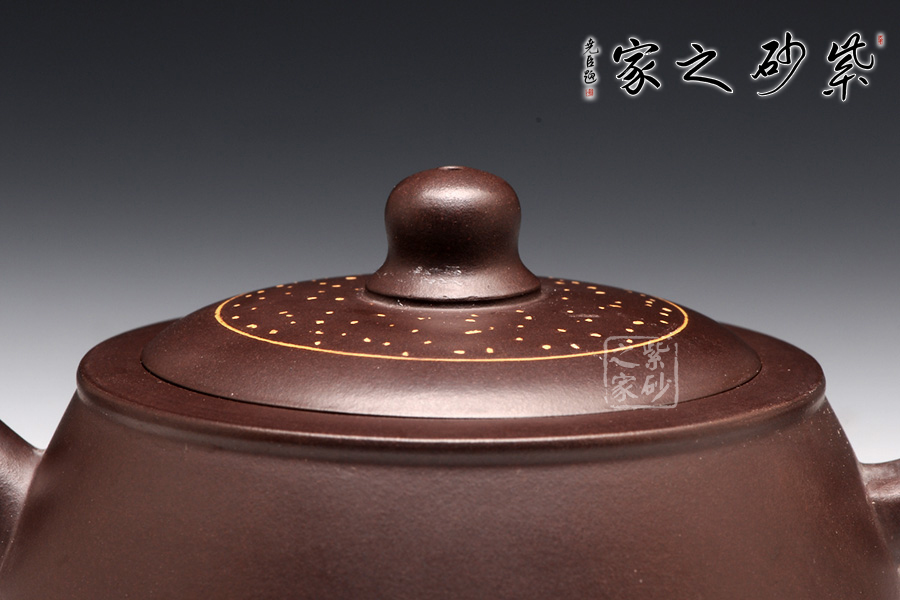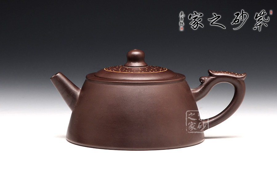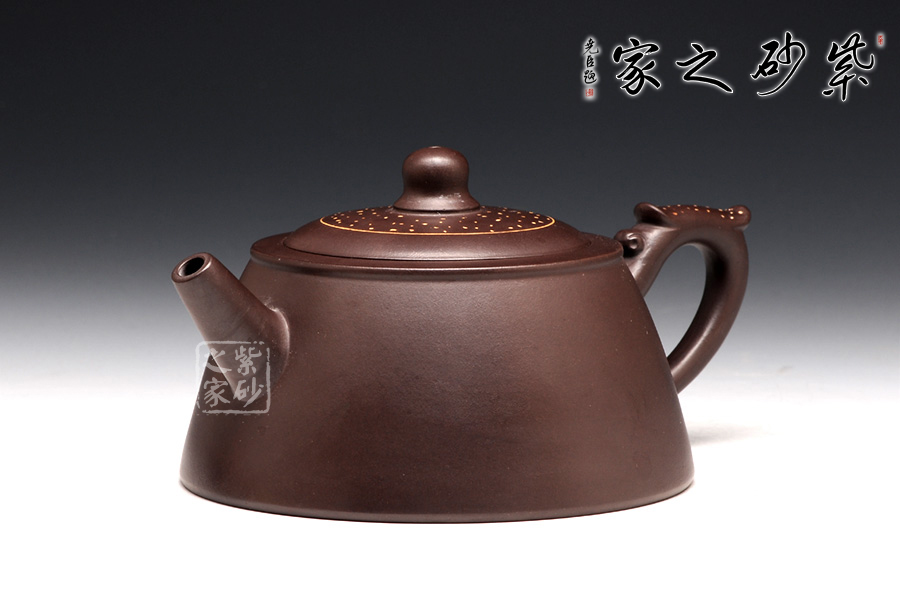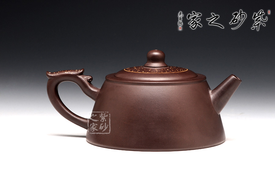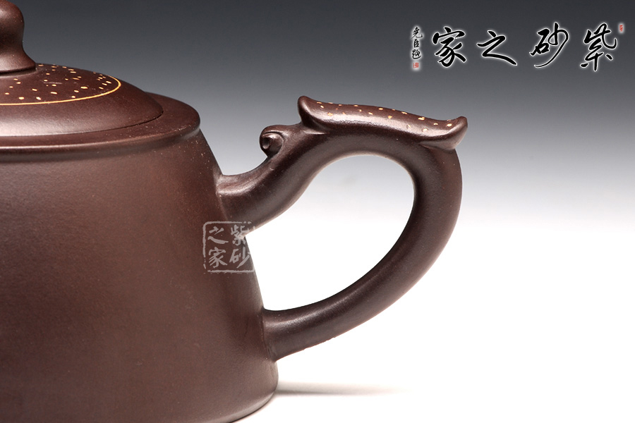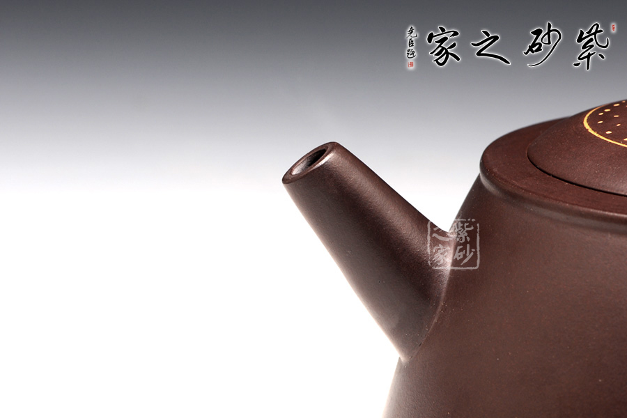這款作品簡約大氣,穩(wěn)健厚重,造型經(jīng)典且寓意吉祥,深受壺友的喜愛;作品造型新穎,上寬下窄的壺身多了一份剛毅與清雅之美,素雅的壺身將紫砂獨特的氣質(zhì)巧妙表現(xiàn);嵌蓋設(shè)計使得氣密性極佳,蓋面十分飽滿,圓圓的壺鈕十分精巧,觸手生溫;明接直錐嘴出水迅猛爽利,壺把的造型極為特別,如環(huán)龍之形,透著威嚴和霸氣,把體上端如龍角,鋪砂工藝金光閃閃,加上原礦紫泥沉郁、華貴的氣質(zhì),令人傾心。