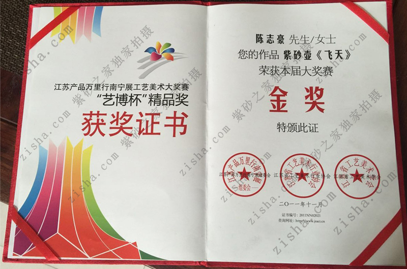陳志豪:1973年出身于江蘇宜興,高級工藝美術(shù)師。1992年進紫砂五廠培訓中心,從師研究員級高級工藝美術(shù)大師顧美群,長期從事造型設(shè)計與創(chuàng)作,對光器制作有獨特見解,形成了自己的風格。2002年6月《開片石瓢》榮獲蘇州博覽會銀獎,同年11月《凌韻壺》獲國家級工藝美術(shù)大師展銀獎,2004年9月《招財進寶》獲太湖博覽會工藝美術(shù)精品展金獎。作品多次刊登于有關(guān)專業(yè)書籍,在國內(nèi)各大城市壺展中有較高的評價,作品被多個國家地區(qū)收藏家收藏。2015年10月榮獲首屆“景舟杯”中級職稱組銅獎。