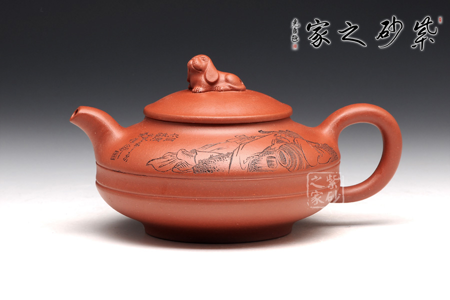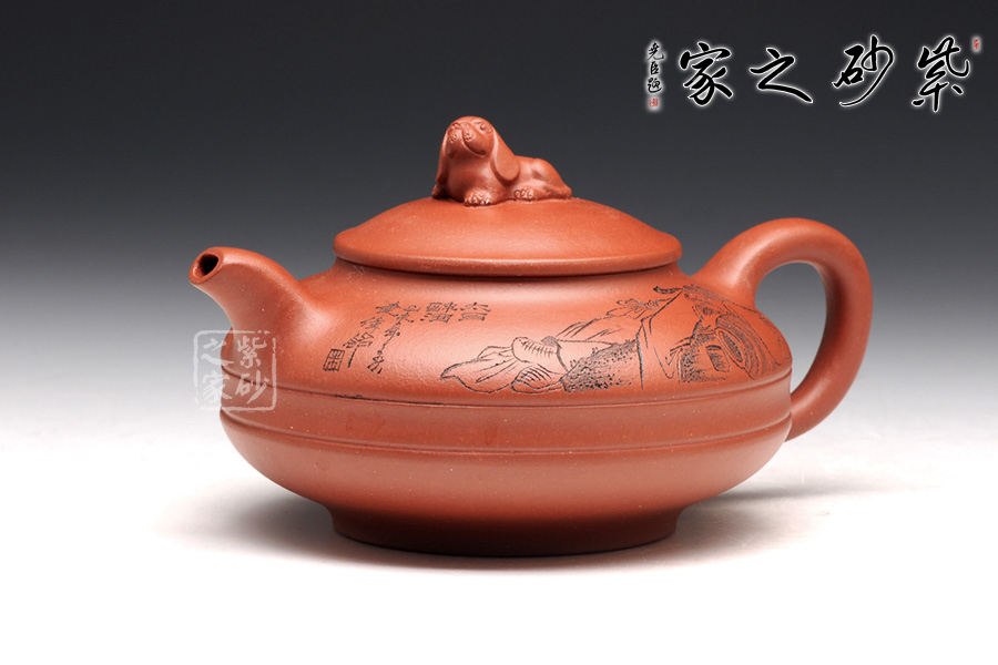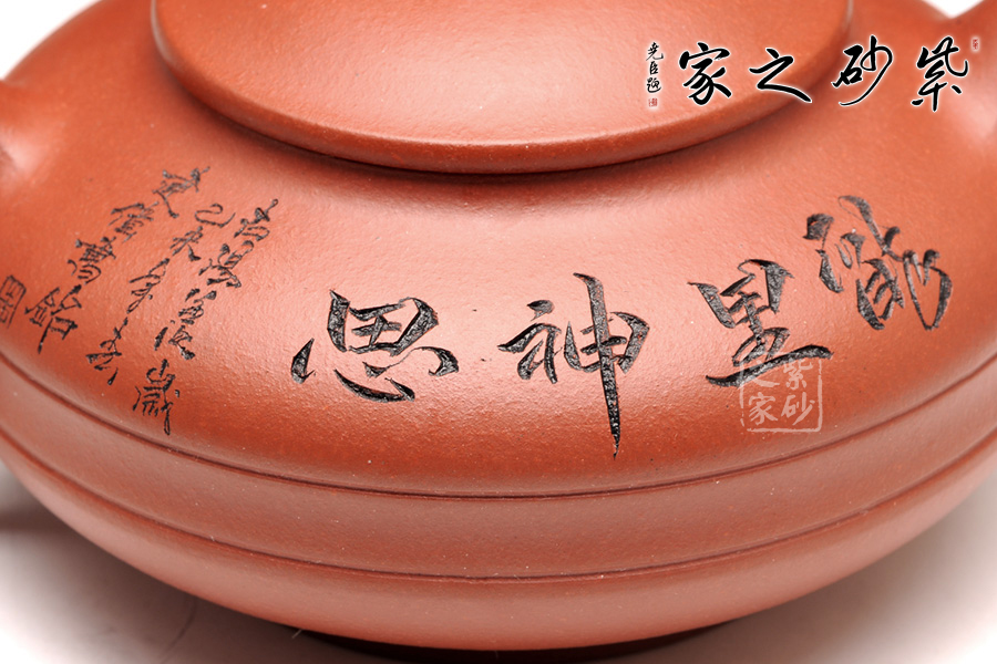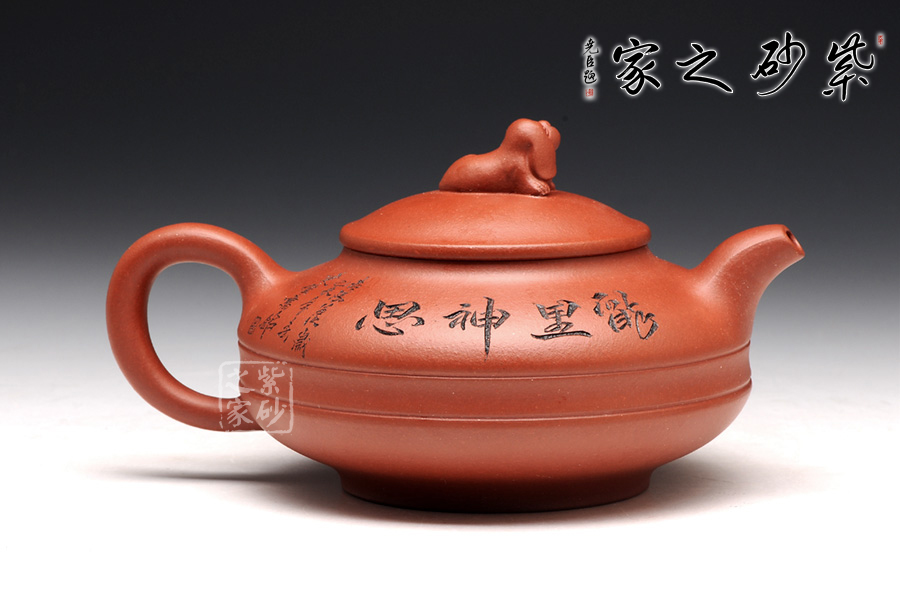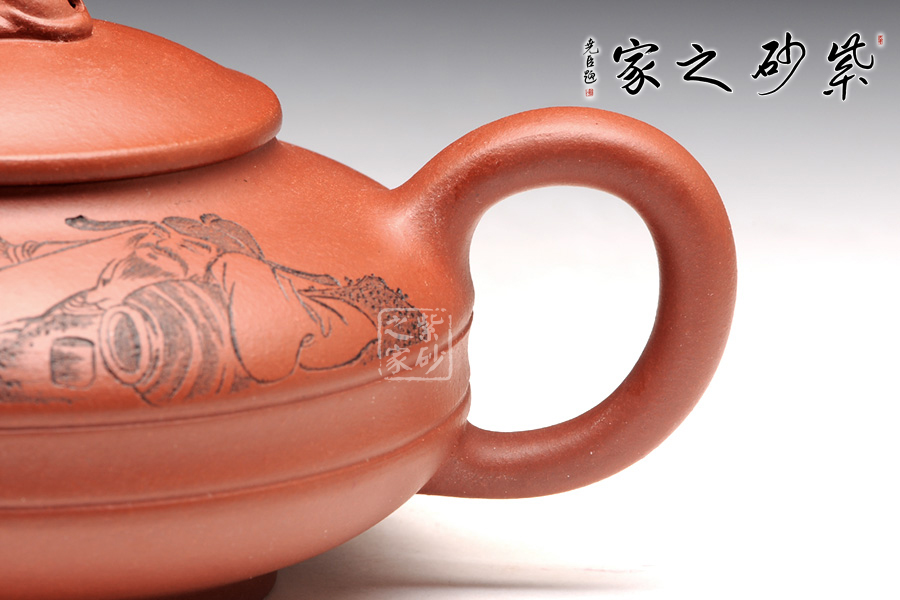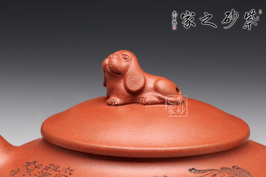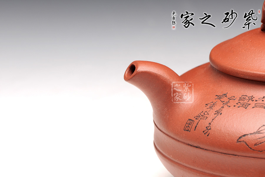 此壺以原礦清水泥制成,清潔雅思,非常清爽。扁圓的壺身敦厚雅致,略鼓的腹部更顯其大肚可容、氣度不凡;壓蓋設(shè)計(jì),上下吻合如一,可使通轉(zhuǎn)自如毫無澀礙;端把透露出完美圓滿之意,彎流胥出于壺肩,稍粗,可使茶湯更加暢順地流出。動(dòng)物壺鈕精致小巧,精雕細(xì)琢。細(xì)看該作品,其做工之細(xì)膩、功力之深厚實(shí)是毋庸贅言!