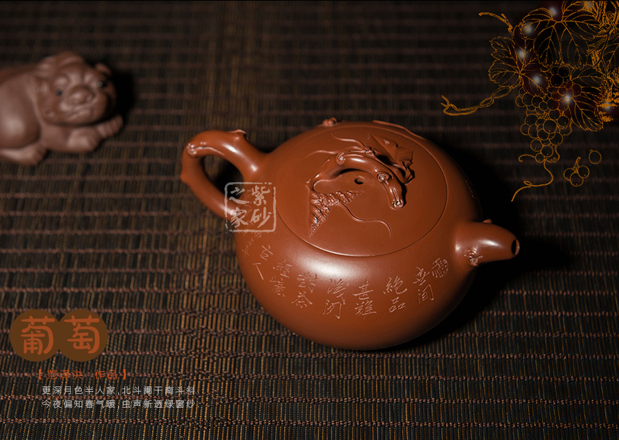 這是一款花貨造型壺,整個(gè)壺體形象生動(dòng),造形精致,形象逼真,工藝獨(dú)到,富有趣味,沉穩(wěn)的泥料與活潑好動(dòng)的動(dòng)物形成鮮明的對(duì)比,所謂動(dòng)靜皆宜。