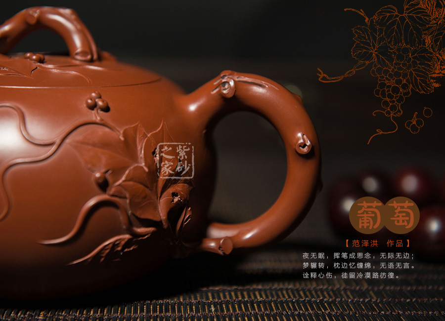 壺身正面葡萄藤裝飾為主,葉子自然舒展,極為的形象而逼真,仿佛真有一葡萄藤蔓延其上。整器為飽滿的圓器,嵌蓋設(shè)計(jì)與壺身渾然一體,壺鈕為虬曲的葡萄藤,周時(shí)讓人感覺此壺充滿大自然的氣息。