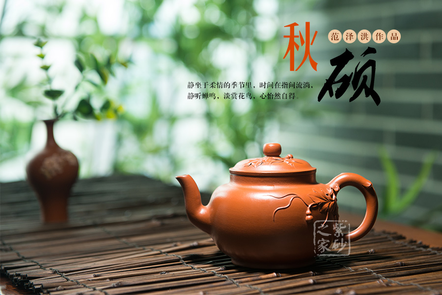 此壺名為“秋碩”,意為碩果累累的秋天是豐收的季節(jié)。此壺壺身圓而正,扁圓壓蓋設(shè)計(jì),靈動(dòng)而有生氣。壺把之處緩緩續(xù)出的嫩葉自然清新,和壺蓋之處的工藝相互輝映。整體色澤之古樸自不待言,器形之簡(jiǎn)單、線(xiàn)條之收斂何處不體現(xiàn)出一種淡然之態(tài),即便是需要承擔(dān)整個(gè)壺體之中的壺鈕、流香茶之源的壺嘴,處處都是自然而出,毫不張揚(yáng)。