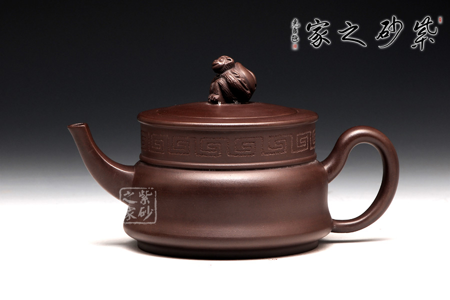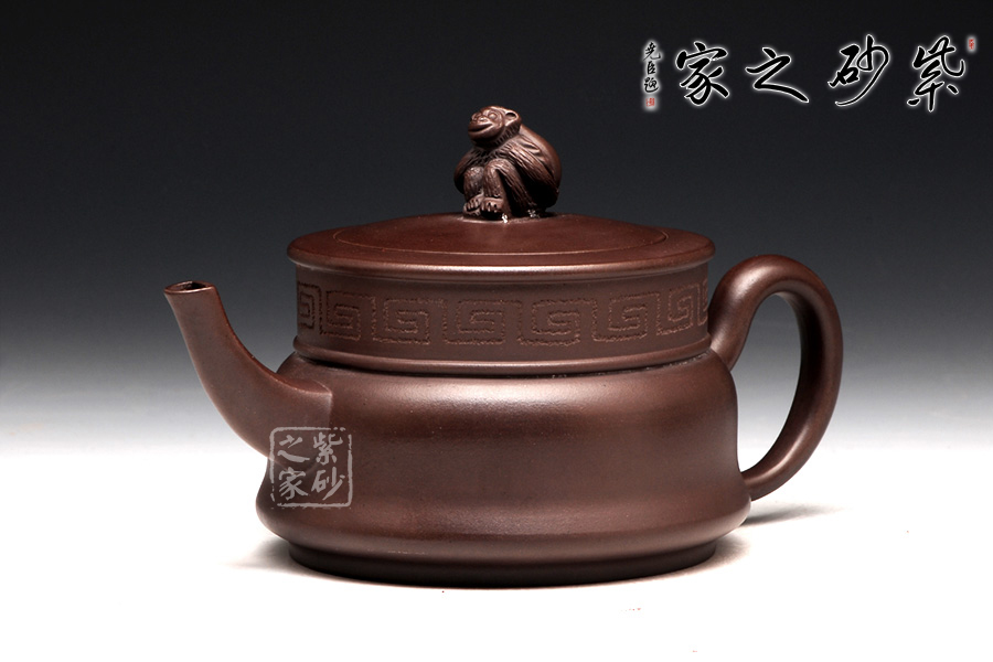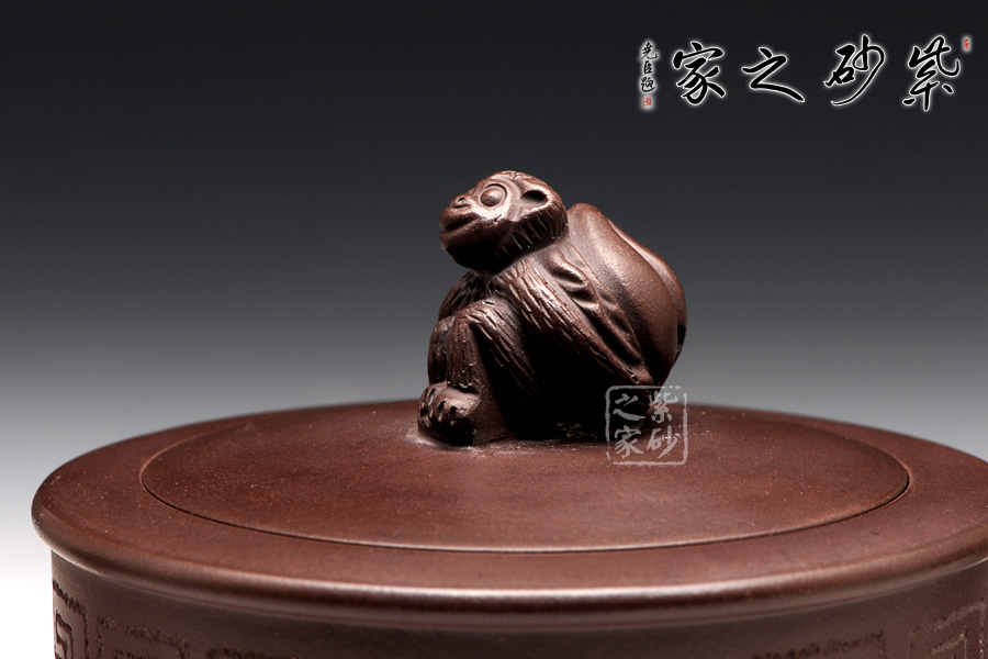 壺身用方圓結(jié)合來展示,圓柱體分為上下兩層,向中間的腰線部位收斂,底部平整而壓蓋光滑,云肩裝飾映襯在深色的外觀上,更見神秘內(nèi)斂。修長(zhǎng)的壺嘴大方伸出,橫向空間上氣勢(shì)恢宏。對(duì)應(yīng)的壺把則是耳形,巧妙地收縮,更顯其持重。壺鈕就是靈猴壽桃,桃子圓潤(rùn),小猴生動(dòng),足見作者之手筆精湛。