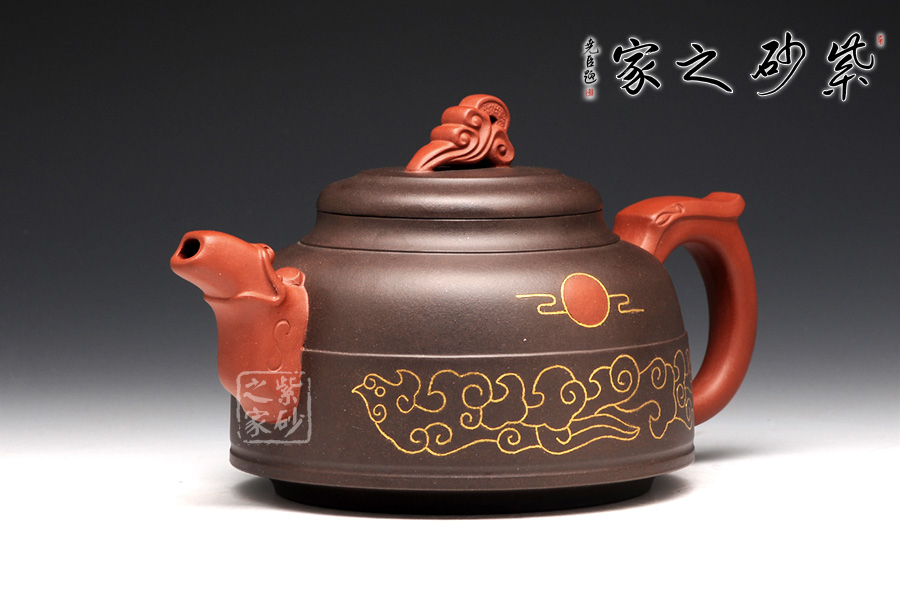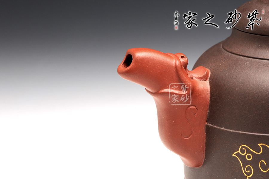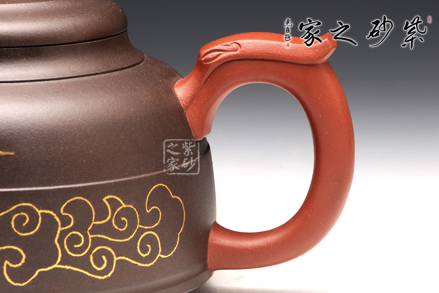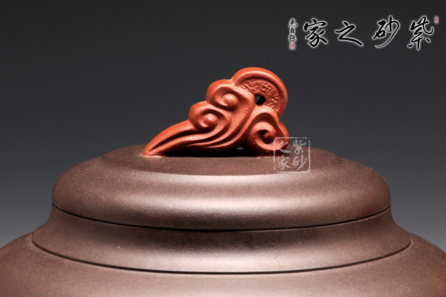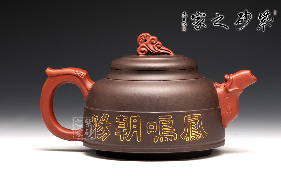雙色泥料使用,交相輝映下足見作者功力不凡。壺身造型圓潤挺拔,平滑直線和曲線過渡自然,四面工整細(xì)膩。壓蓋飽滿,蓋上圓潤而且蓋沿工整,讓人由衷贊嘆。壺鈕是一朵祥云,紅色泥料更顯華貴。壺嘴是鳳首,四方形態(tài)從口中流出,古樸悠遠(yuǎn)。壺把是鳳尾,簡潔有力,更見張力。