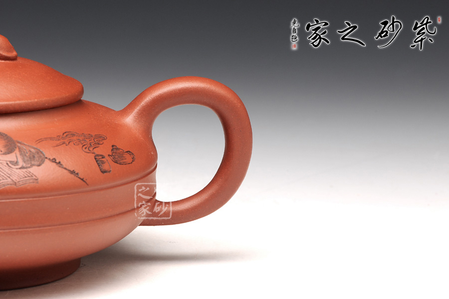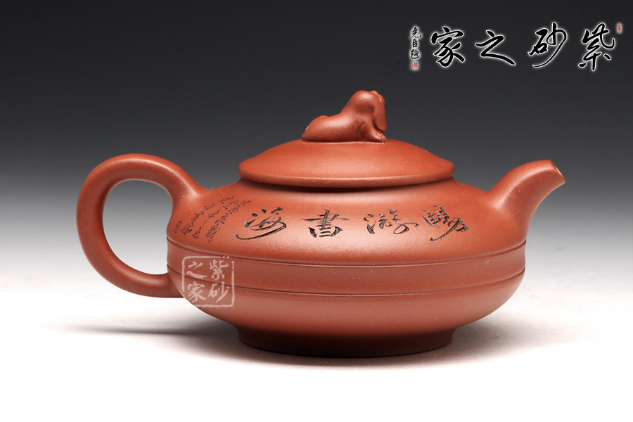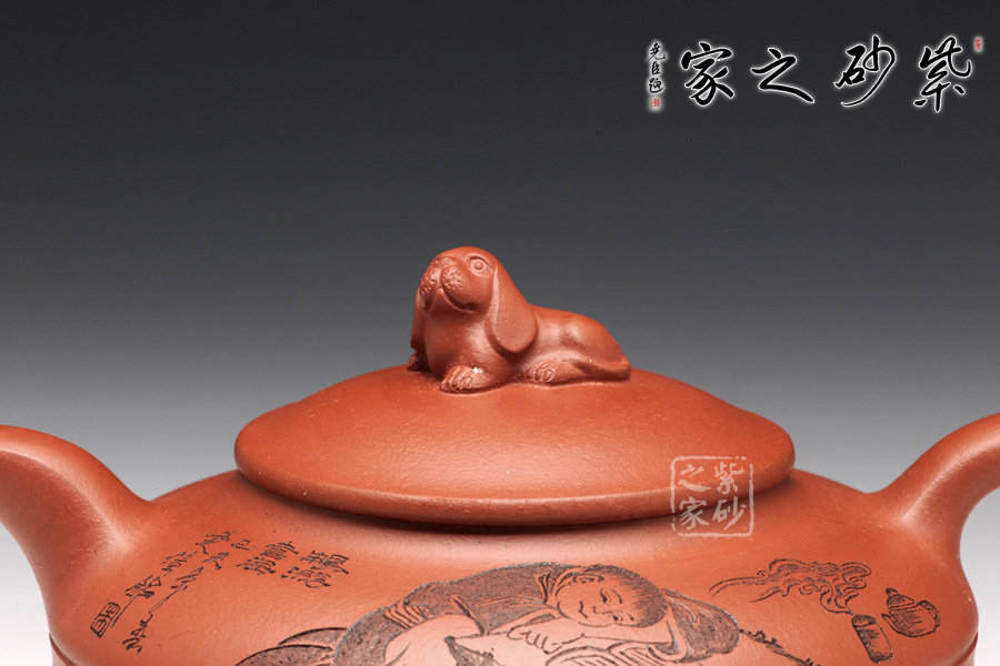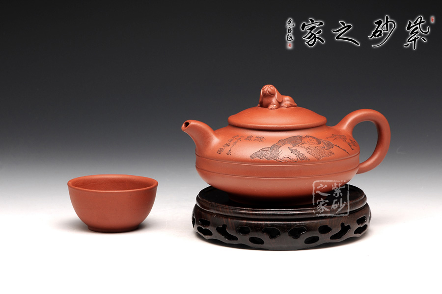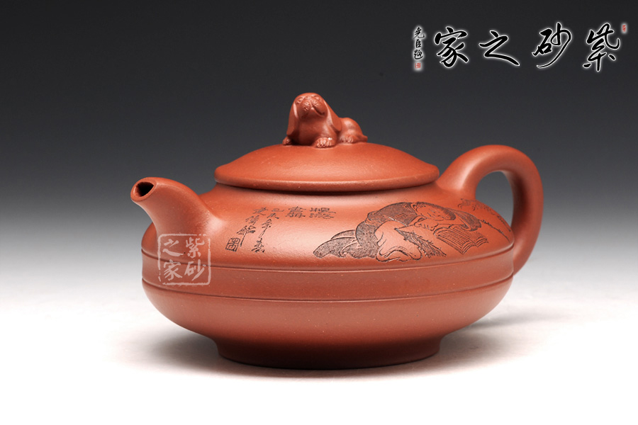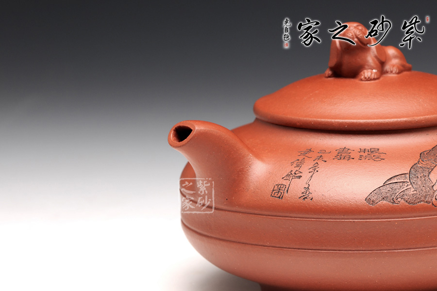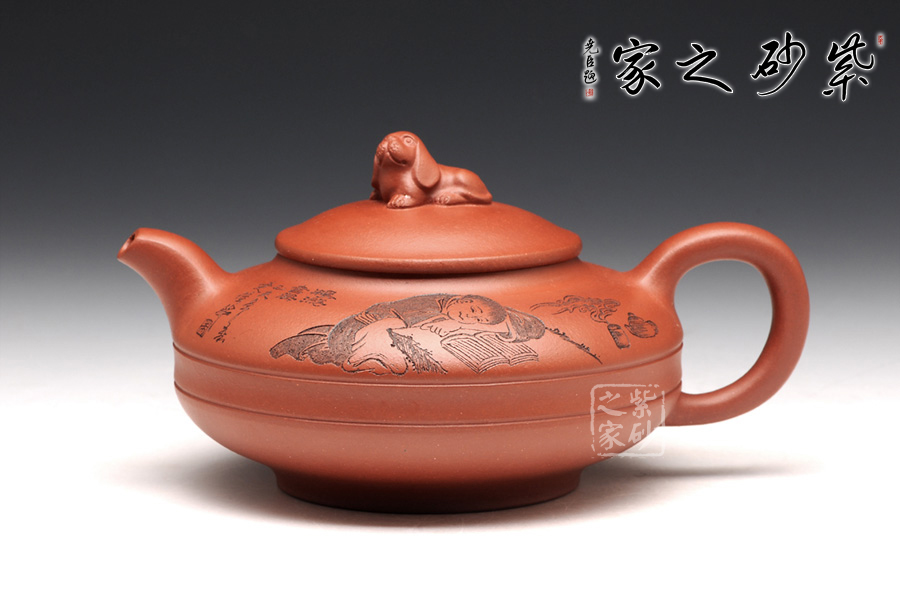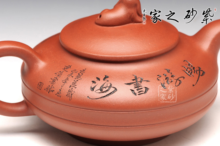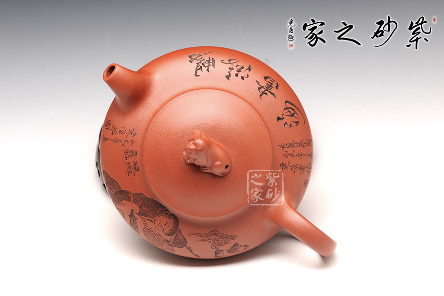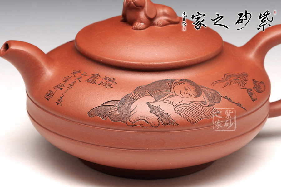 此壺壺身被腰線分為上下兩截,形似圓盤,身扁穩(wěn)健,壺嘴、壺把暗接巧妙,不著痕跡,壺蓋凸起,小狗造型的壺鈕十分生動(dòng),這份可愛與壺身上的女童刻繪相互呼應(yīng),而“暢游書海”四字更是刻得剛勁有力,大氣沉穩(wěn),讓我們都不禁想去女童夢中一探天地,夢是一世界,茶亦一世界,皆是高雅意境。
