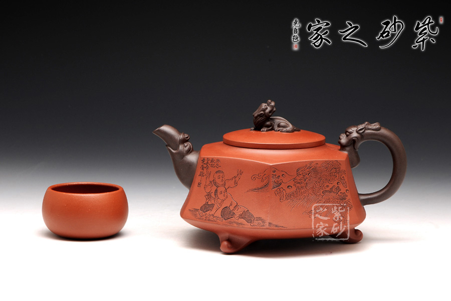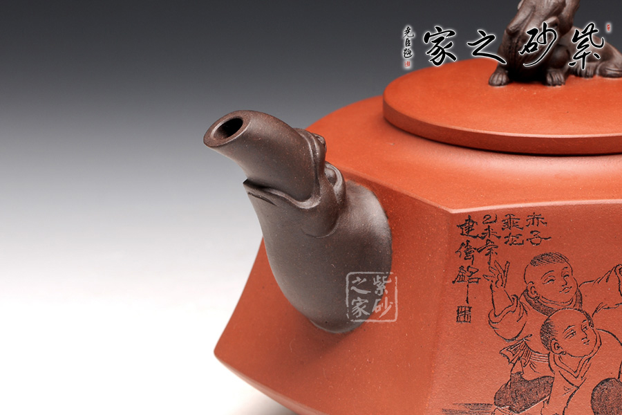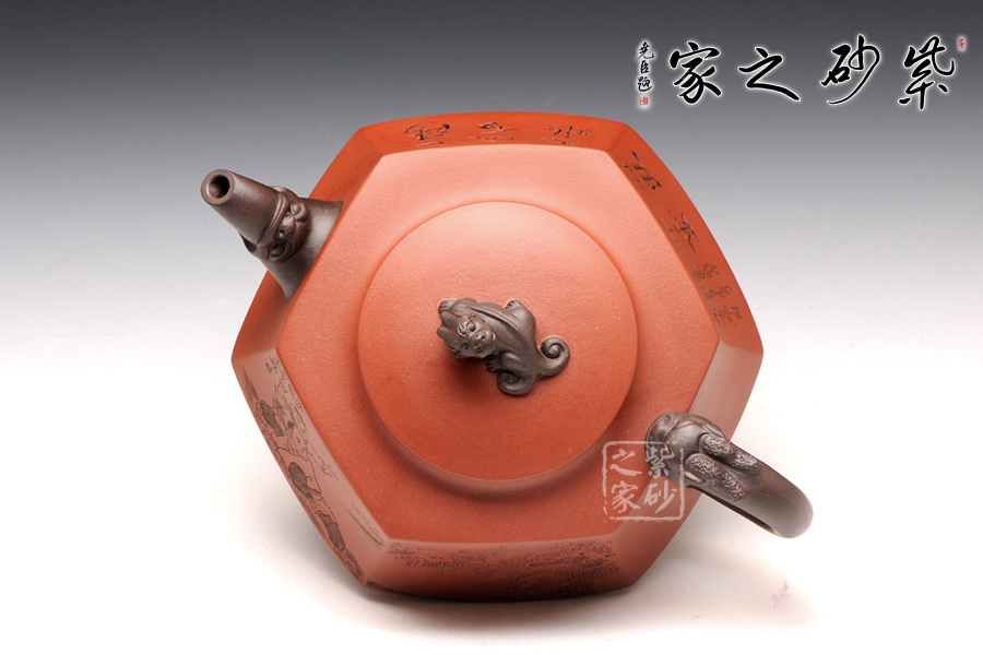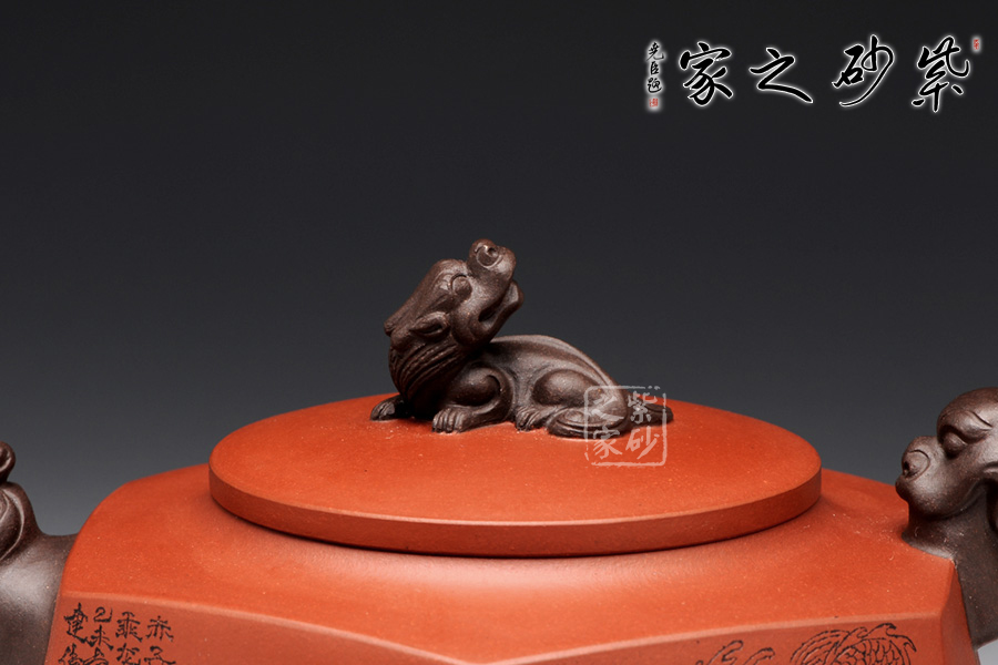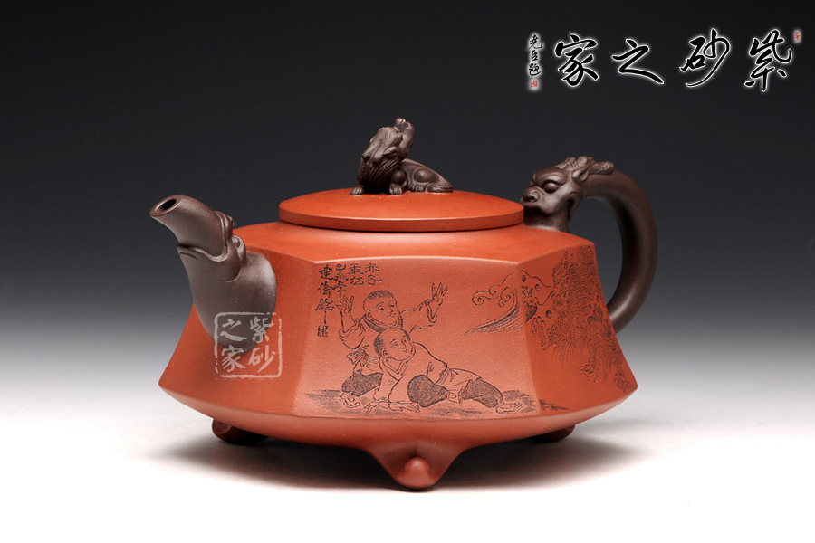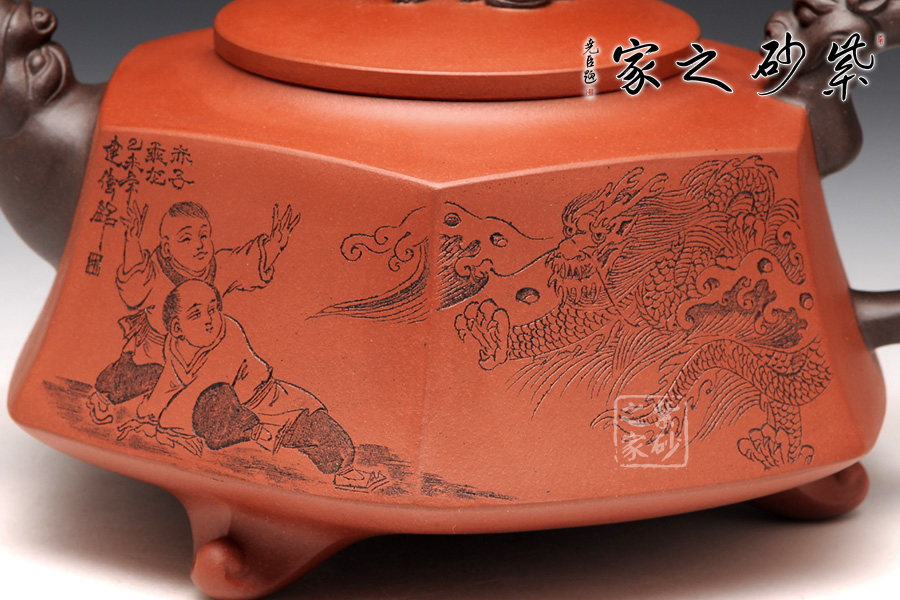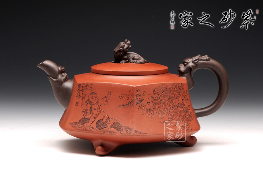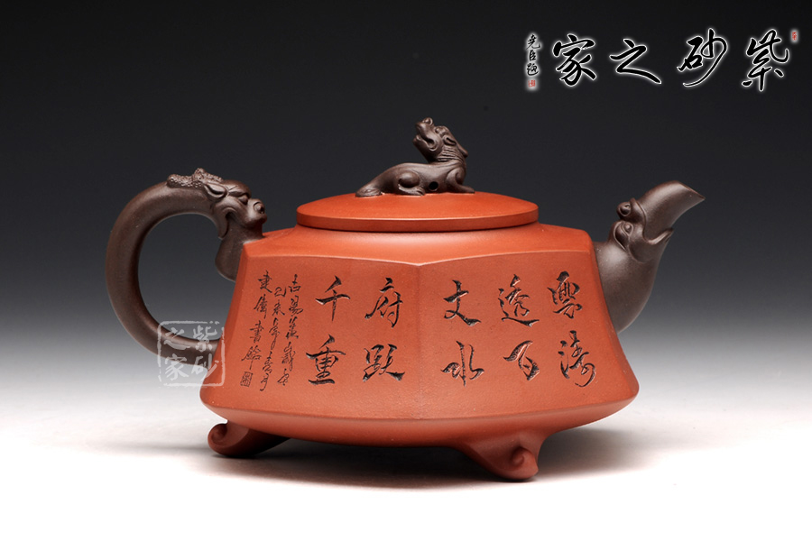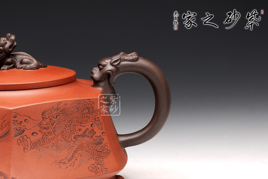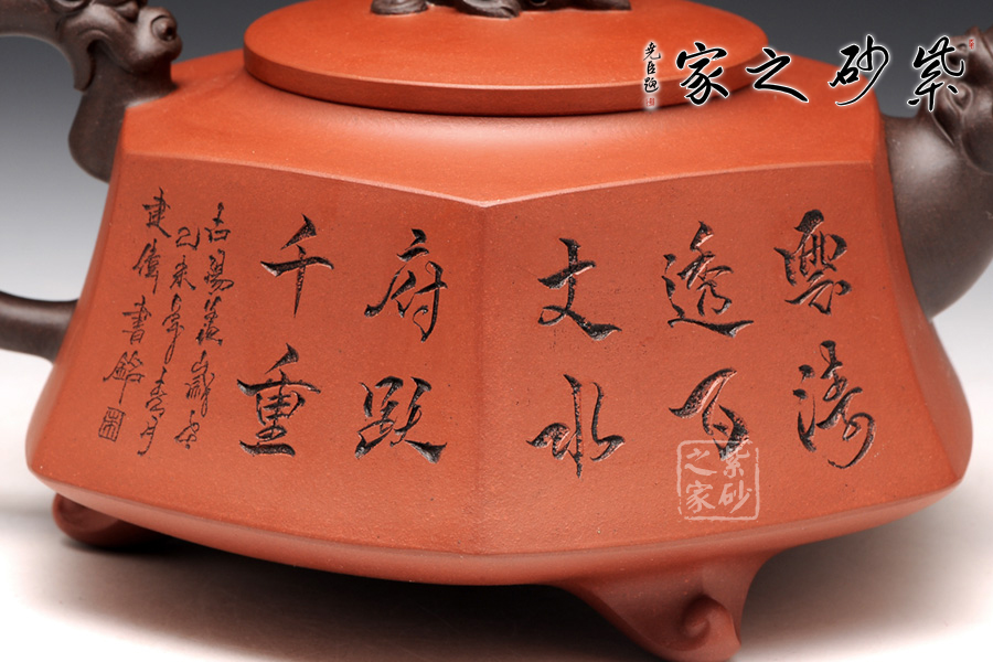 壺身被分為六面,切面平滑,棱角分明。肩部用斜角過渡,壓蓋對接嚴(yán)密,整體簡潔。壺鈕、壺嘴和把皆以龍形為素,刻畫生動形象,相互交映。外觀用切面裝飾,于圓潤里透著工整和老味,意味獨(dú)特。壺底三足而立,更顯沉穩(wěn)古樸!