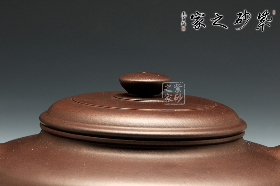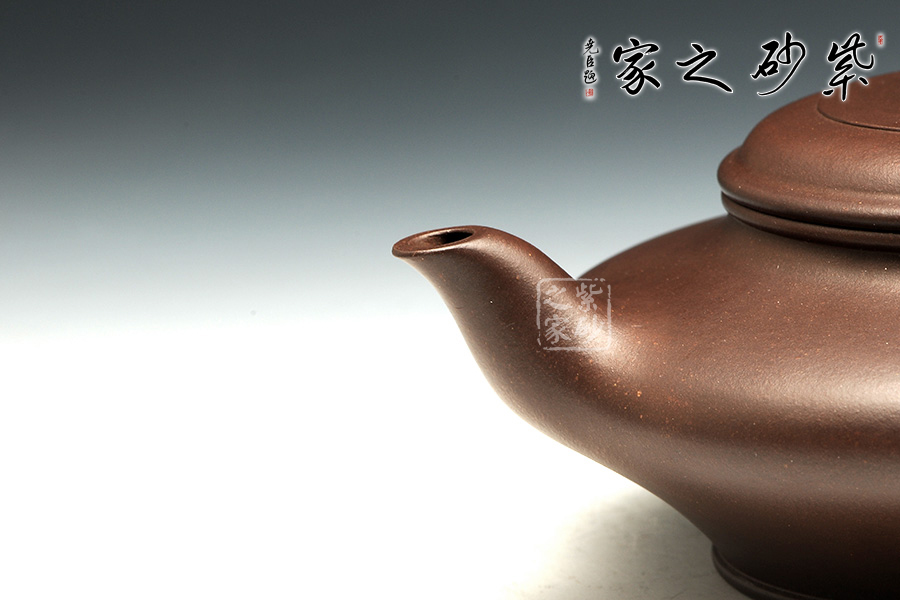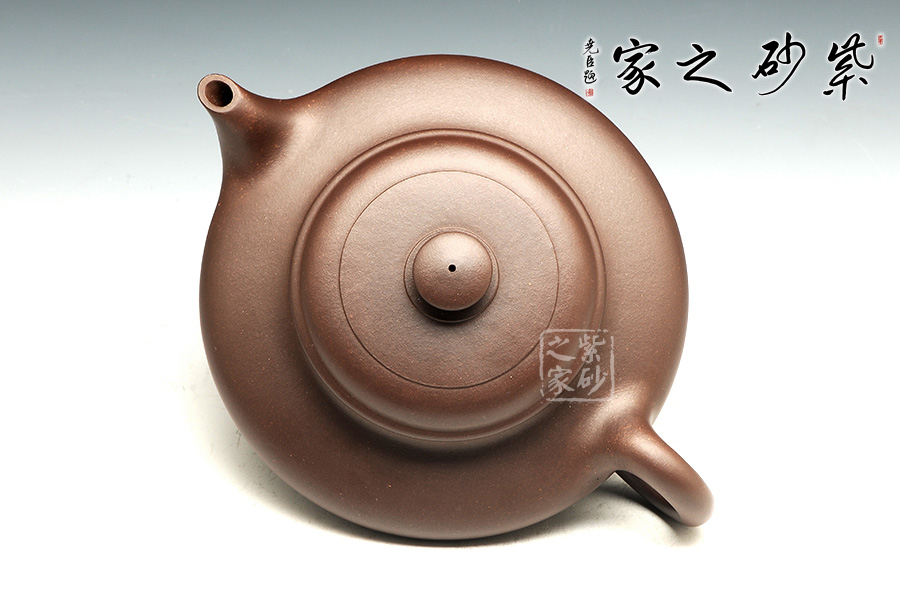 壺身極扁而有力度,長(zhǎng)流的轉(zhuǎn)折呼應(yīng)重心略向上的環(huán)型把,使扁腹向左右延伸,而蓋鈕巧妙地凸起令壺的重心上移,腹似虛實(shí)有通壺顯得精實(shí)有神,不致扁塌??陬i與壺底外輪廓呈反彈弧線構(gòu)成,其制作難度為手工成型技法中最難,此壺外表造型質(zhì)樸無瑕而又生動(dòng),為壺中佳品。