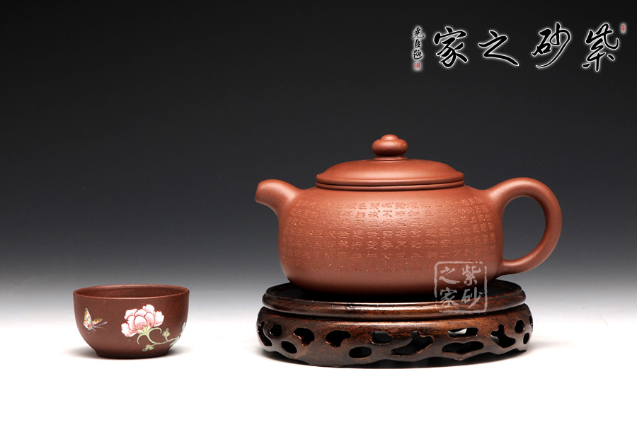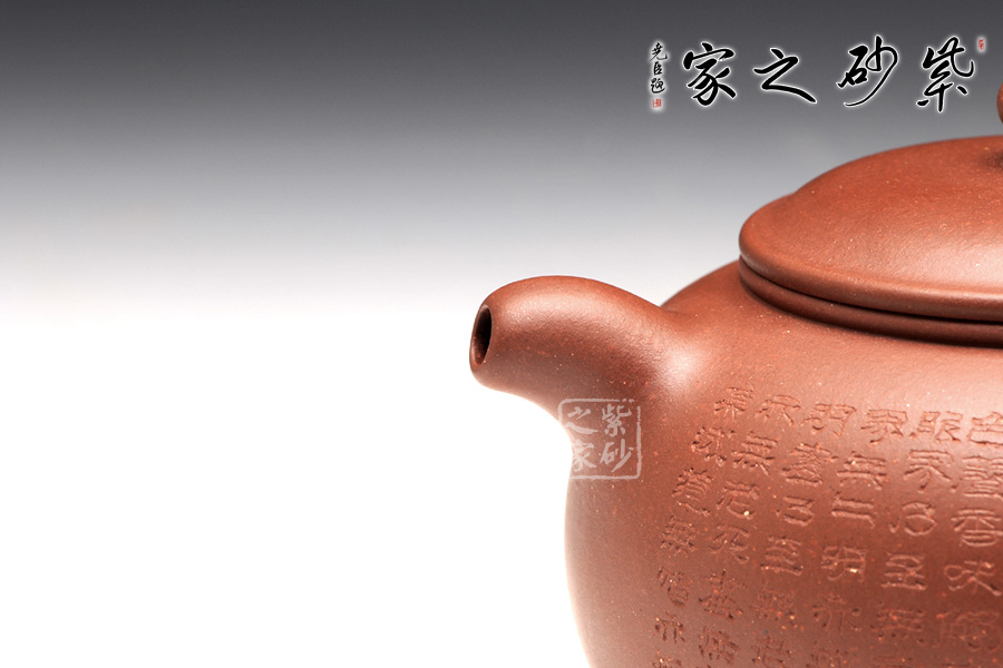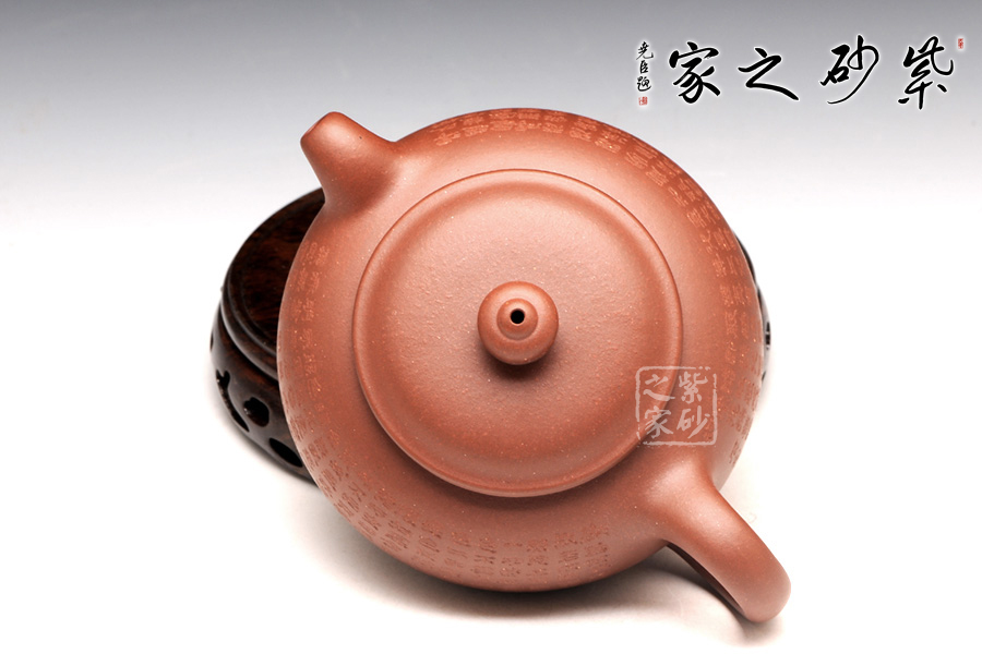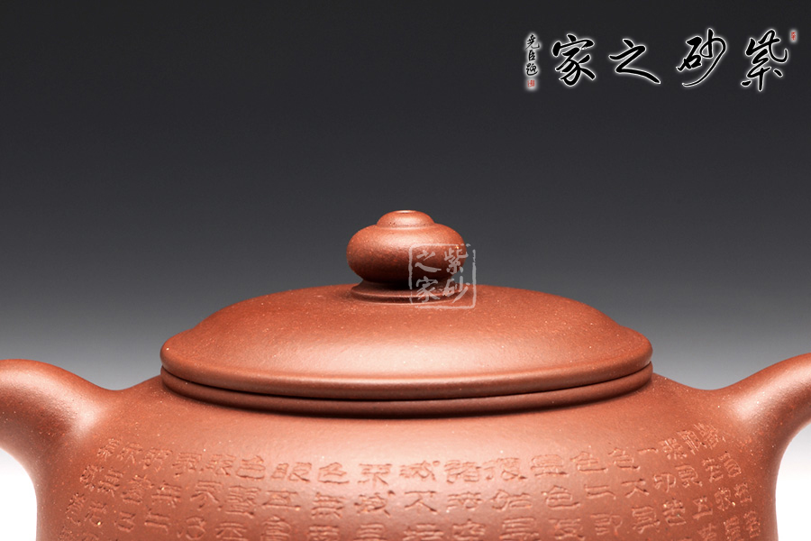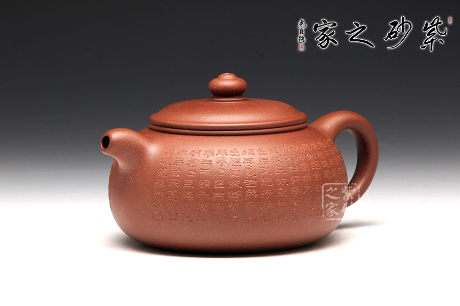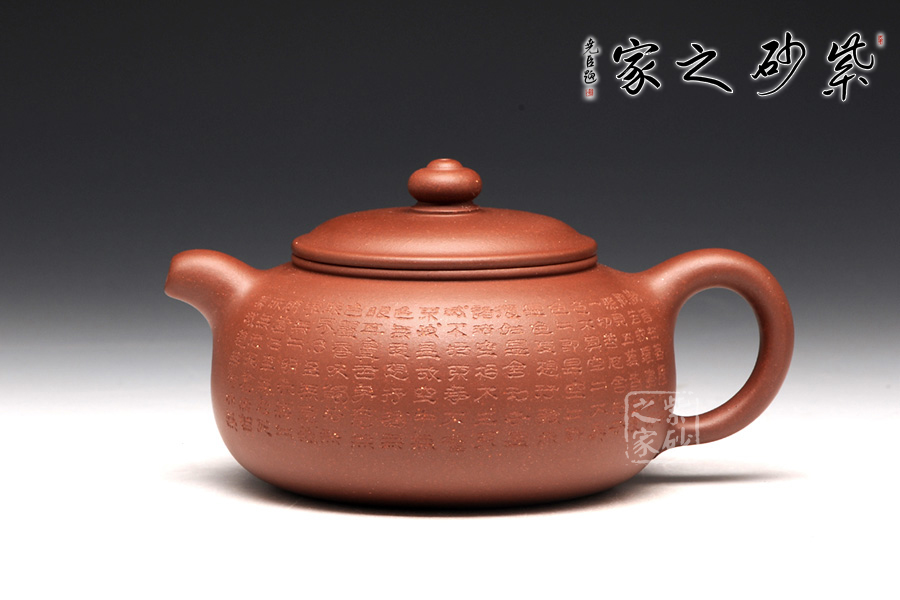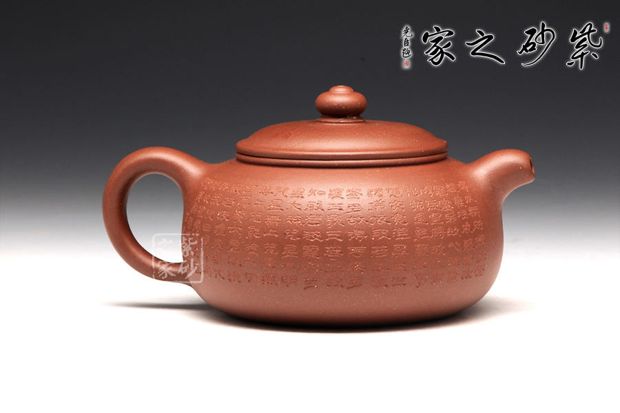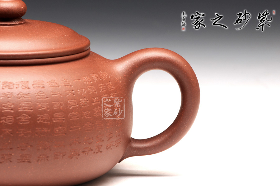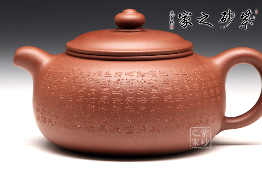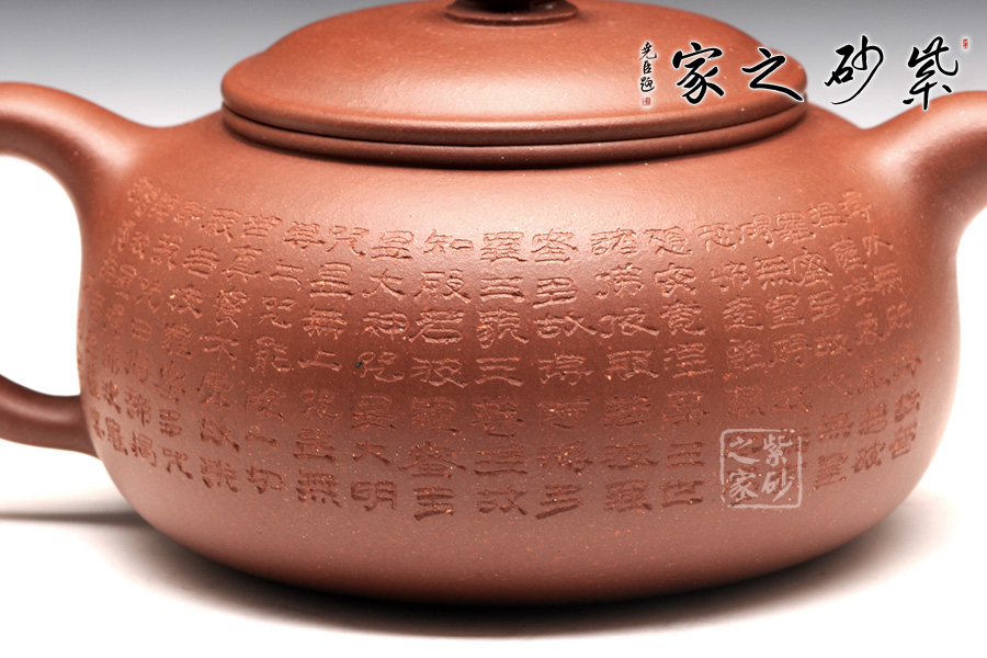 此壺壺身極為飽滿柔和,壺底平和,壺肩圓潤,簡約而不失古意;壺口開闊而平整,平蓋設計同樣呈圓鼓之形,蓋面飽滿上凸,壺鈕亦如晶瑩的露珠一般;壺嘴暗接彎流,壺基豐厚,銜福而至;耳形端把寬和大氣,持握舒適。壺身刻繪心經,大有凝神靜氣之感!