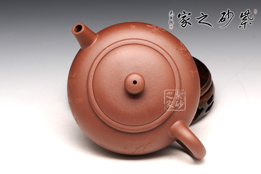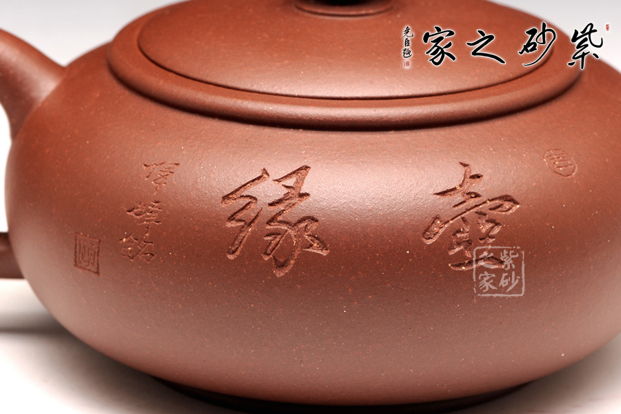 此壺扁圓的壺身,似珍珠一顆,又像是渾圓果實,名為圓珠,實至名歸。嵌蓋與壺身不可分割,點線之間見出魅力,骨肉亭勻,簡練大方,制作頗見功力;彎流嘴胥出,精巧胥出,玲瓏可愛,柔美之姿明顯,壺柄略微上抬之后優(yōu)雅滑落而下,形成一條圓潤飽滿的耳形弧線,樸雅大方。壺鈕簡化為一個半環(huán),小巧而精妙。