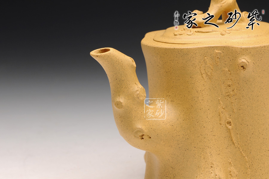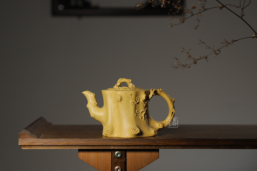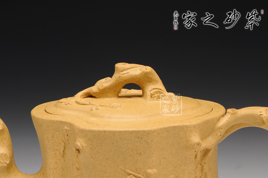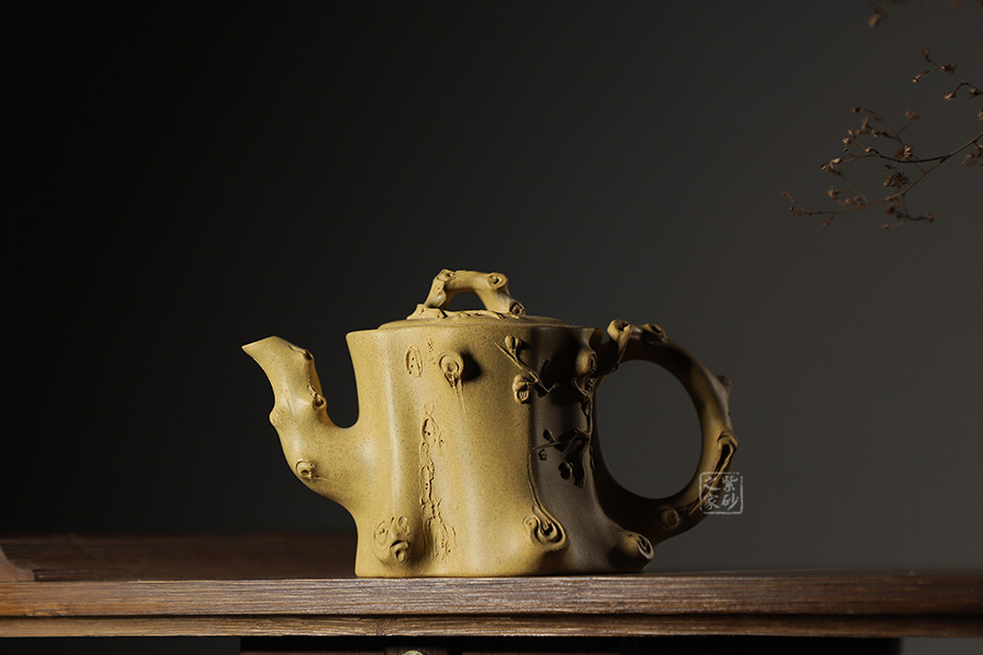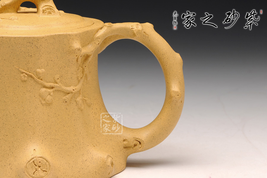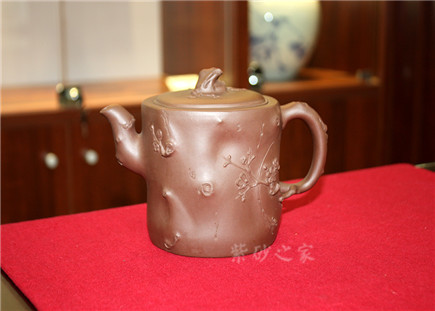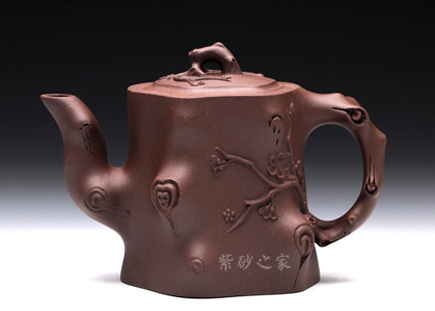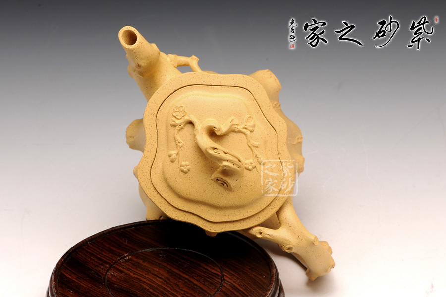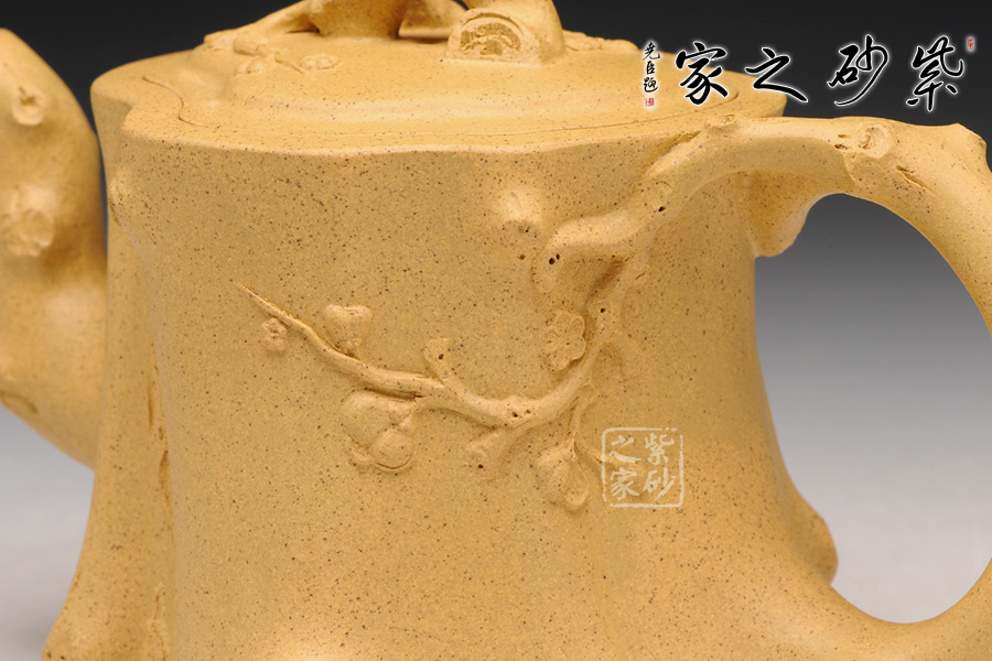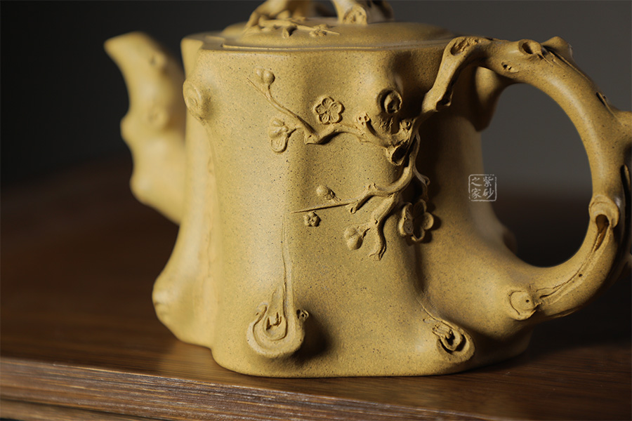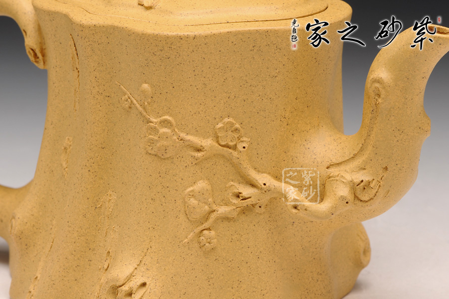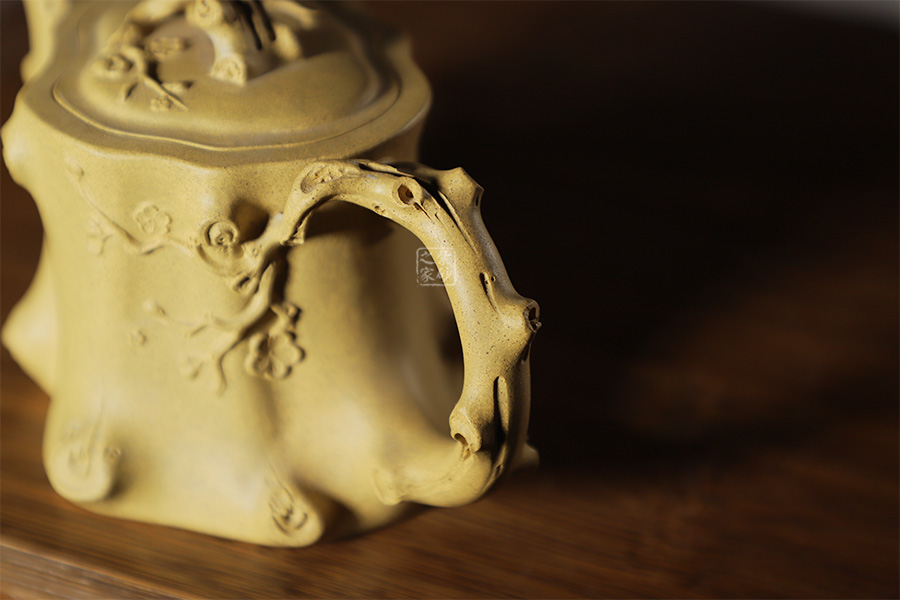 此壺以梅花燦爛綻放表現(xiàn)報(bào)春的主題,從壺身造型到創(chuàng)作原意都洋溢著無(wú)比的朝氣,讓人感到了春天來(lái)到的勃勃生機(jī);壺身、流、把、蓋全部是用極富生態(tài)的梅樁、樹皮及纏枝組成,形態(tài)自然而富含力度;壺嘴壺把為梅樁衍生出的枝干,伸展自然,有如自然長(zhǎng)成,仿生性極強(qiáng),充滿了生命的活力;壺把和壺鈕處胥出梅花,疏影橫斜、暗香動(dòng)人;整體制作到位,此壺做工精細(xì),氣度非凡,實(shí)用性觀賞性都很好,是把玩收藏之佳作!