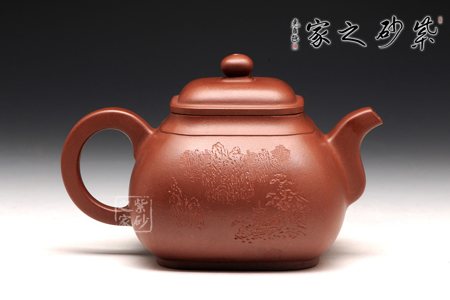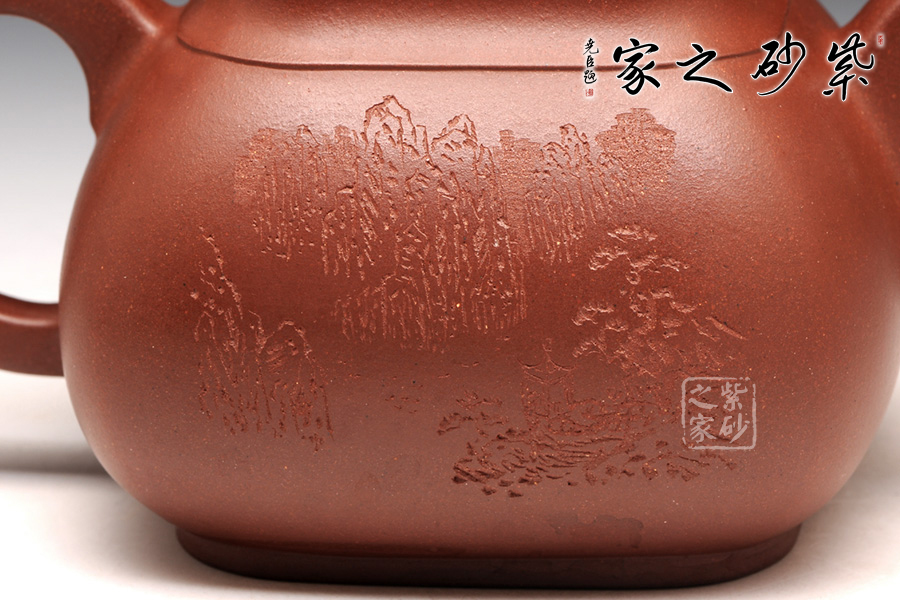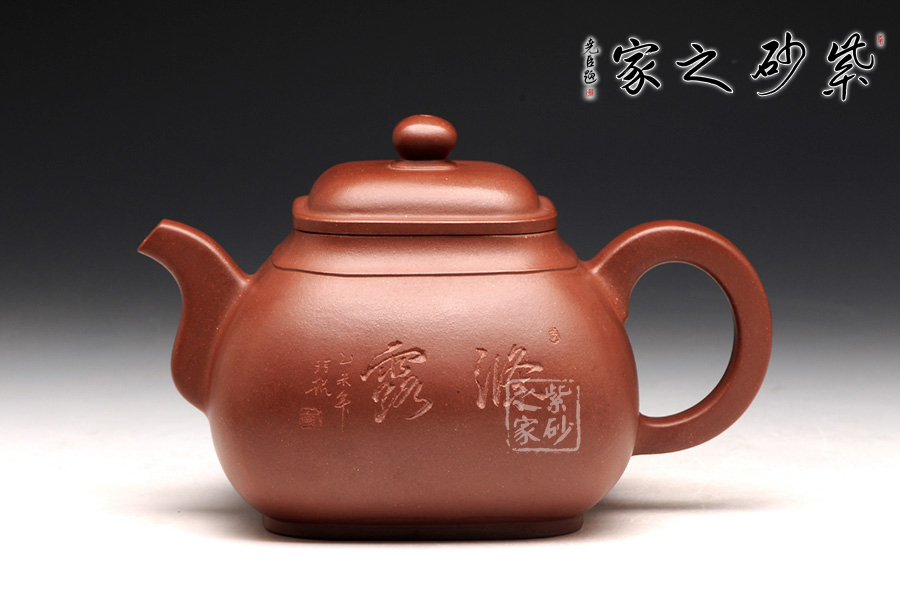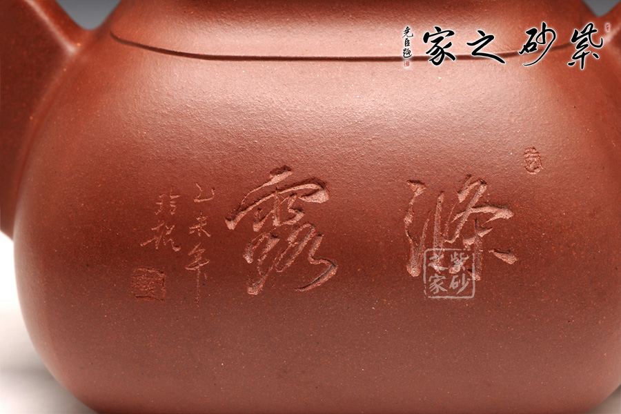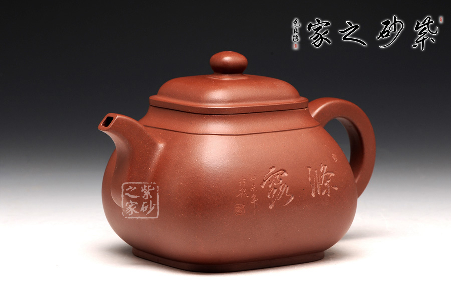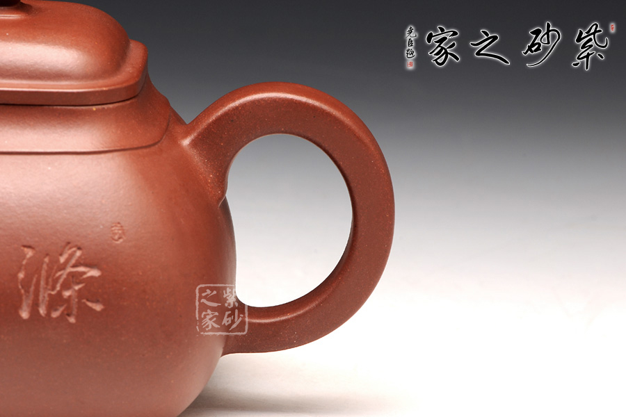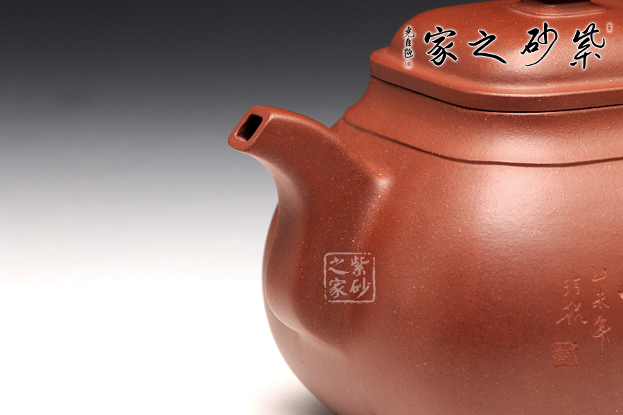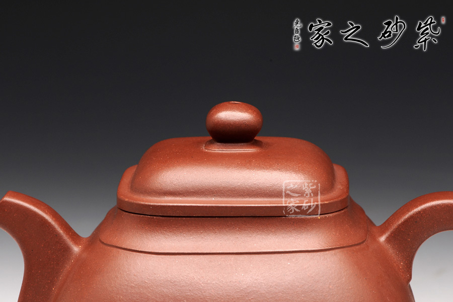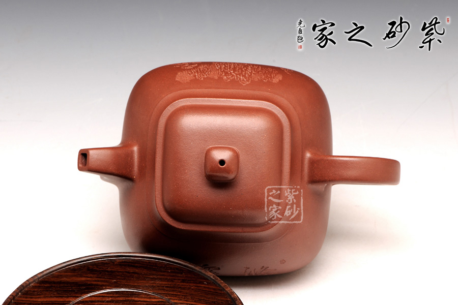 整體造型近似傳統(tǒng)的傳爐壺,四方器型方圓結(jié)合,剛中帶柔,雖呈四方形,轉(zhuǎn)角處卻珠圓玉潤,為人所喜愛;壺口及壺底的四方造型更加規(guī)整,壺腹呈方鼓形,平蓋好似截蓋一般,吻合極為完美,蓋面鼓起,弧度適中,圓形鈕極盡圓潤,四方壺底,迅速收緊,使壺身亭亭玉立,精湛暗接的彎流特別有精神,壺基下垂大顯福相,耳形端把纖細(xì)輕盈,角度適宜,端握極為稱手。