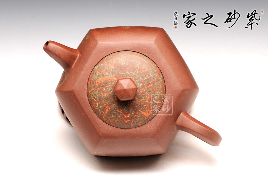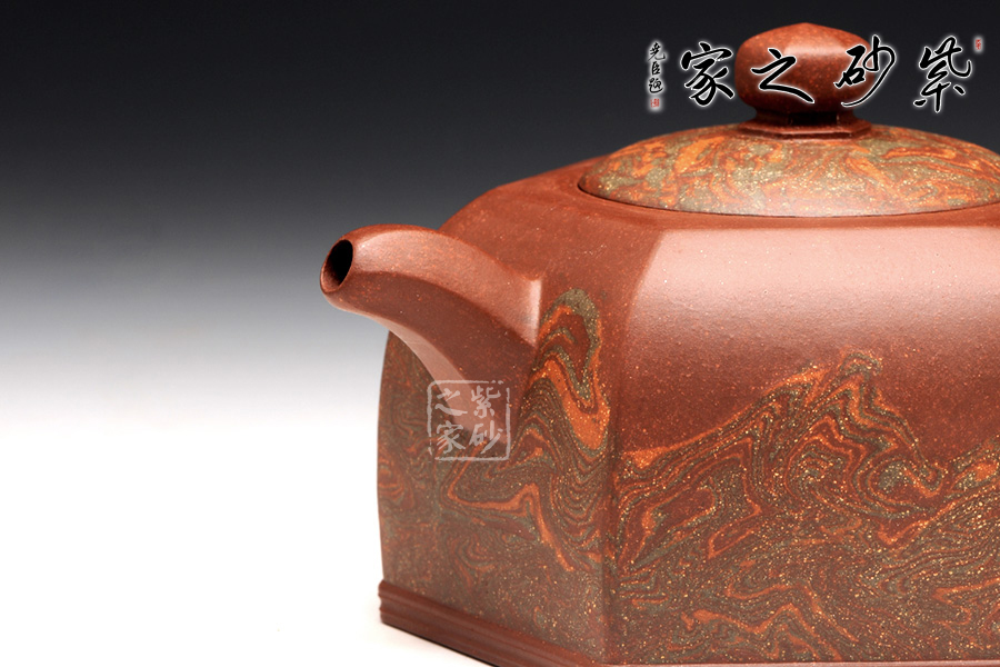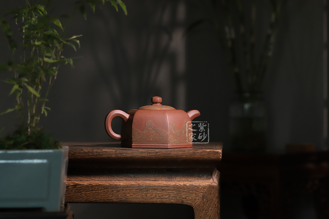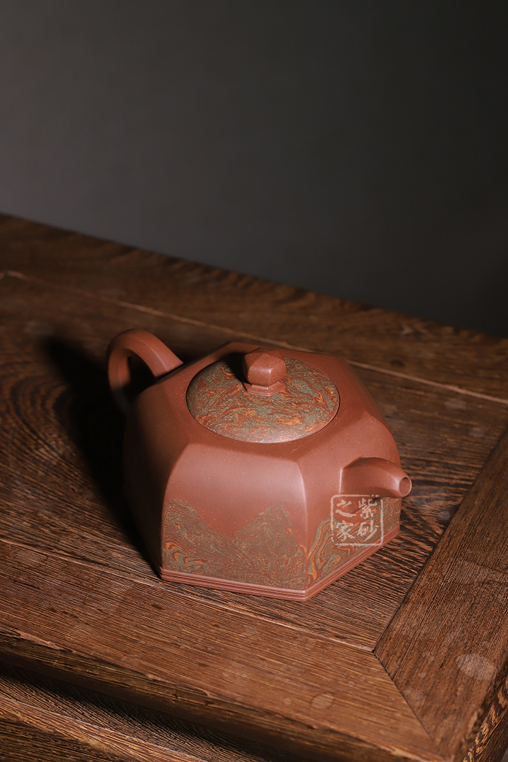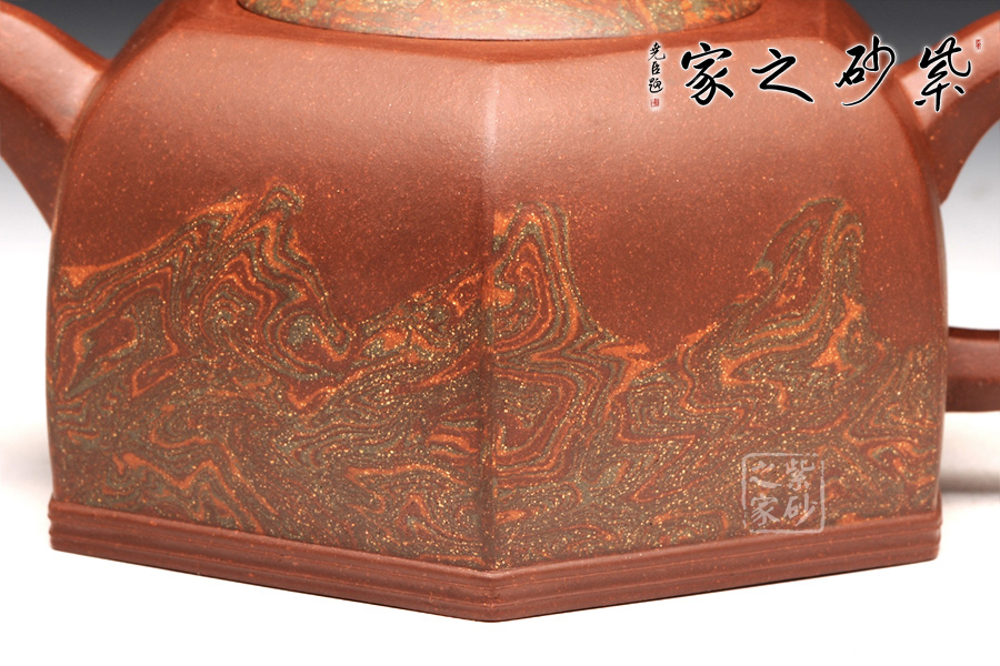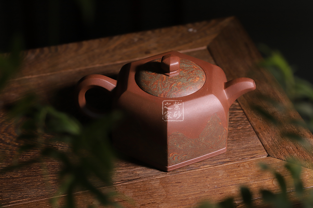 六方井欄于傳統(tǒng)器型之上加以改良制作,有方器的挺括剛勁,又不失柔和之美。壺身被六線條分成六面,直線線條轉(zhuǎn)折處理細(xì)膩,鈕、流、把皆以方器展現(xiàn),與壺身相呼應(yīng),整體協(xié)調(diào)有致,真正做到了線條流暢,輪廓分明,平穩(wěn)莊重的境界,壺蓋有別于整體以圓形展示,不但不顯得突兀,反而于方中見圓更顯柔美。