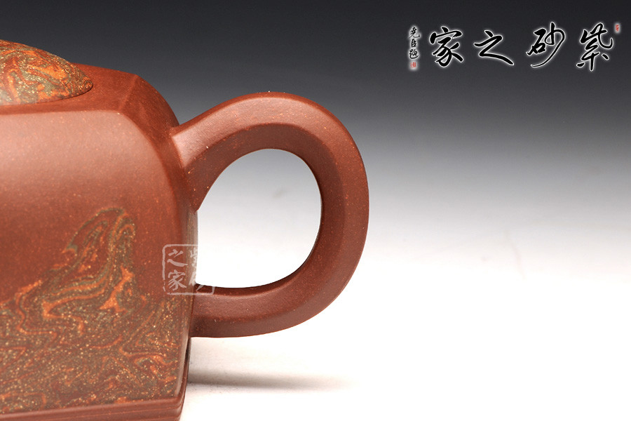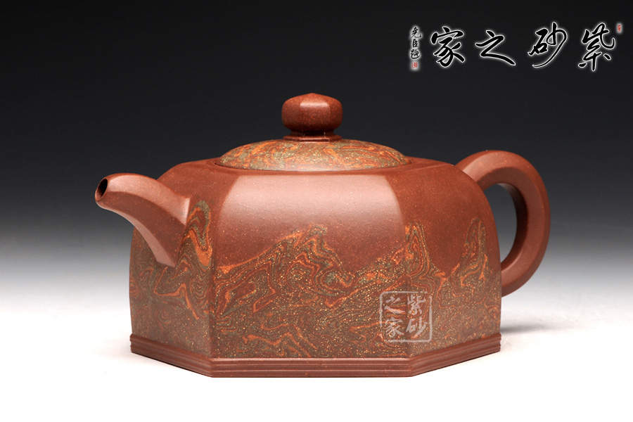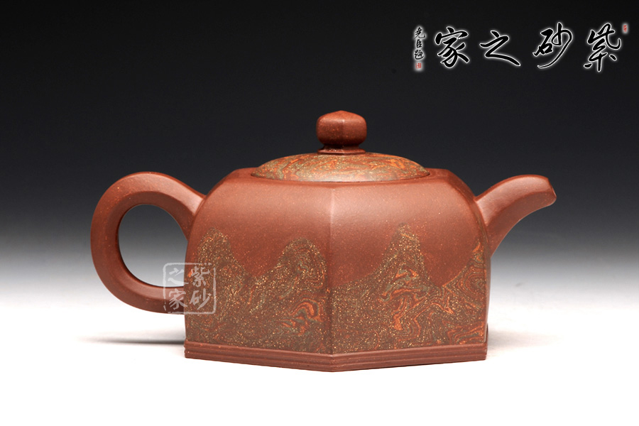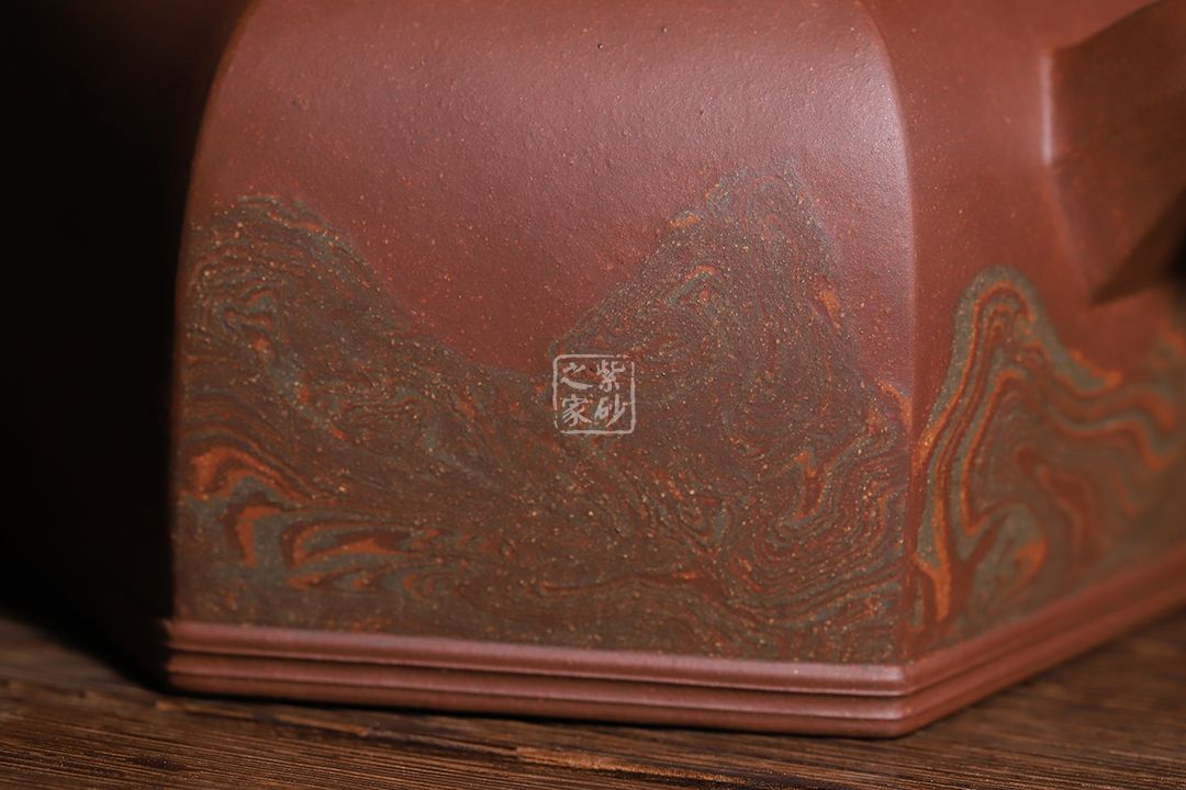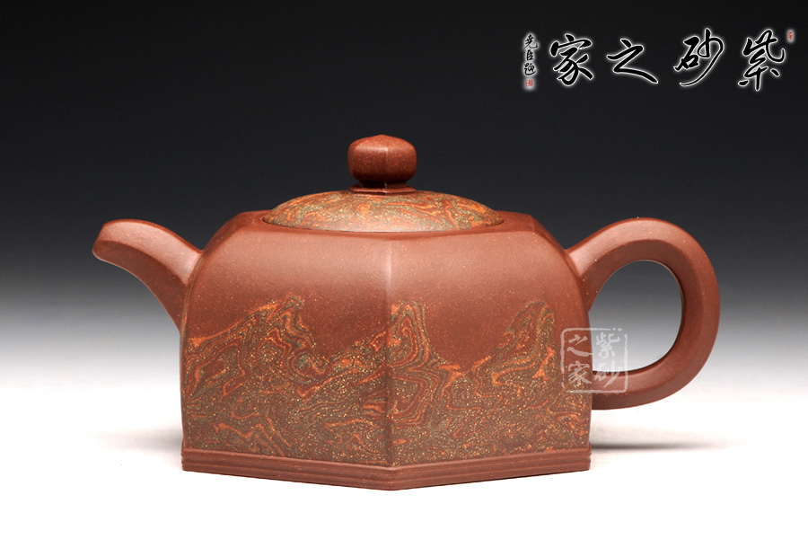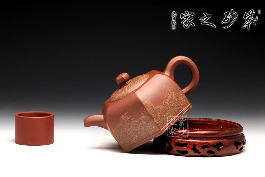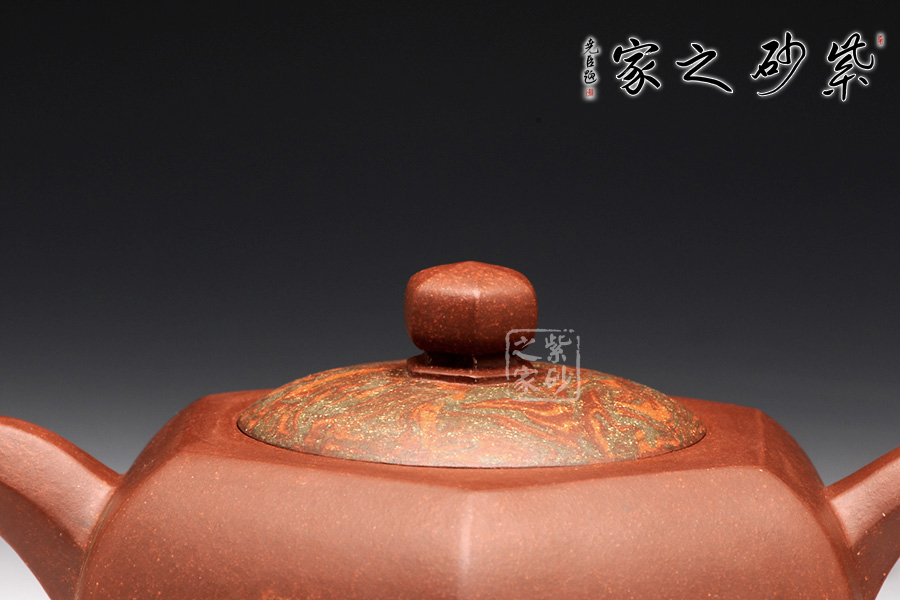 六方井欄于傳統(tǒng)器型之上加以改良制作,有方器的挺括剛勁,又不失柔和之美。壺身被六線條分成六面,直線線條轉(zhuǎn)折處理細(xì)膩,鈕、流、把皆以方器展現(xiàn),與壺身相呼應(yīng),整體協(xié)調(diào)有致,真正做到了線條流暢,輪廓分明,平穩(wěn)莊重的境界,壺蓋有別于整體以圓形展示,不但不顯得突兀,反而于方中見圓更顯柔美。