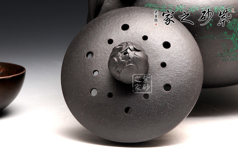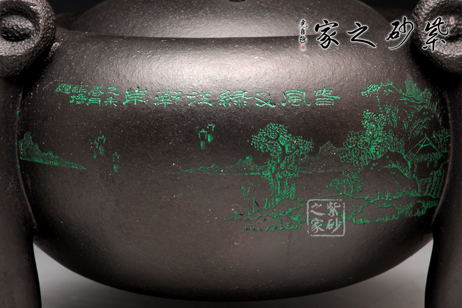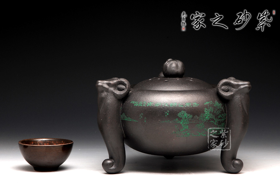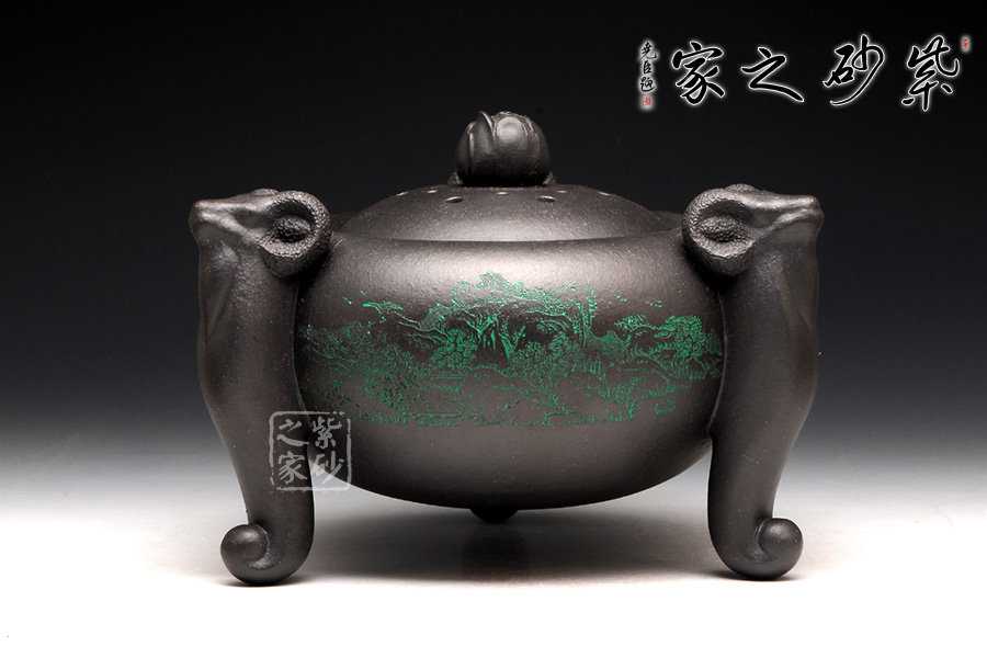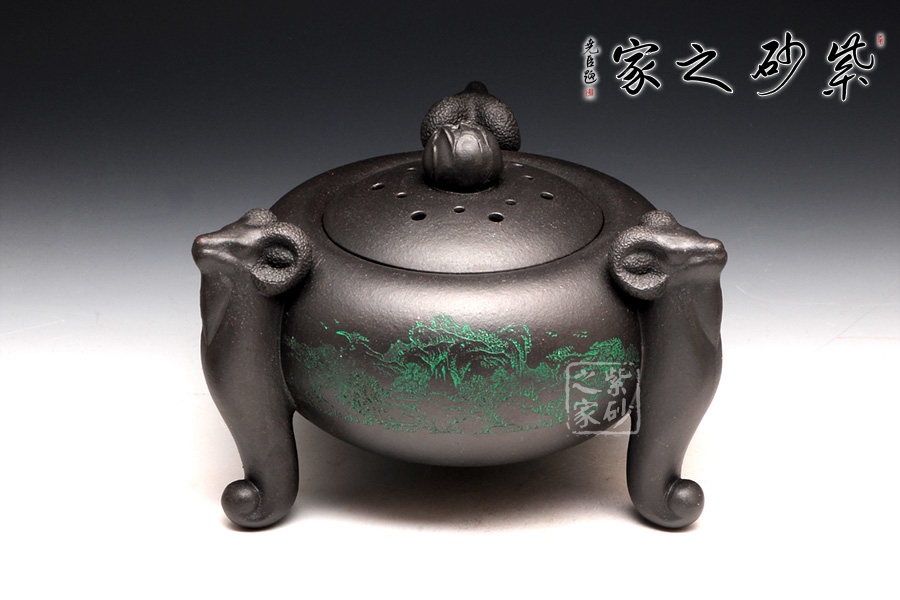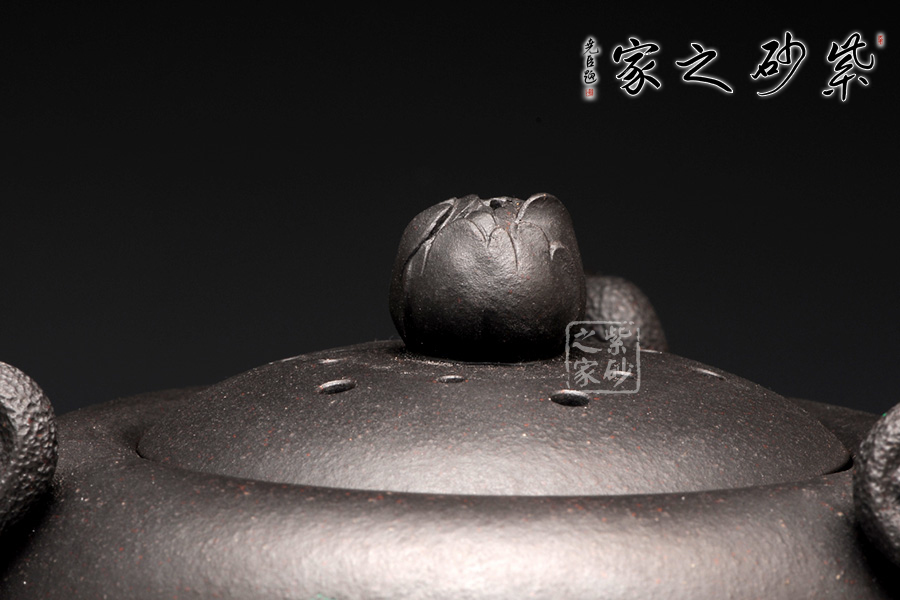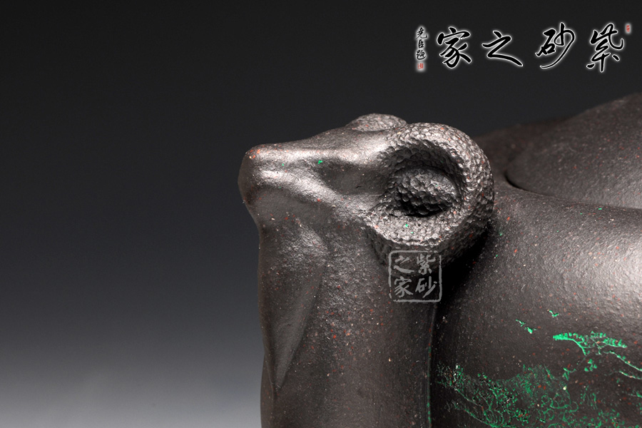 此器三足鼎勢(shì)而為,祥瑞羊頭吉祥如制足,烘托整器,沉穩(wěn)內(nèi)斂。飽滿圓潤的器身,恰到好處,線條過度謙和藝美,壺蓋似蓮花座臺(tái),一含苞待蕾的壺鈕欲羞而上,給沉木內(nèi)斂中帶來一絲委婉,剛?cè)岵⑦M(jìn),更顯真意,給以祝福!