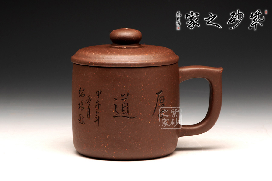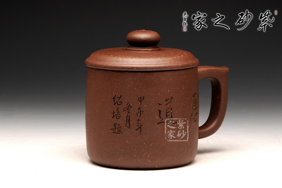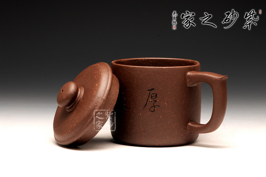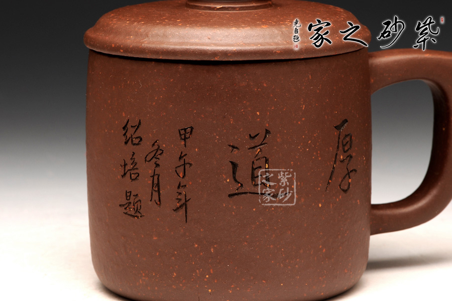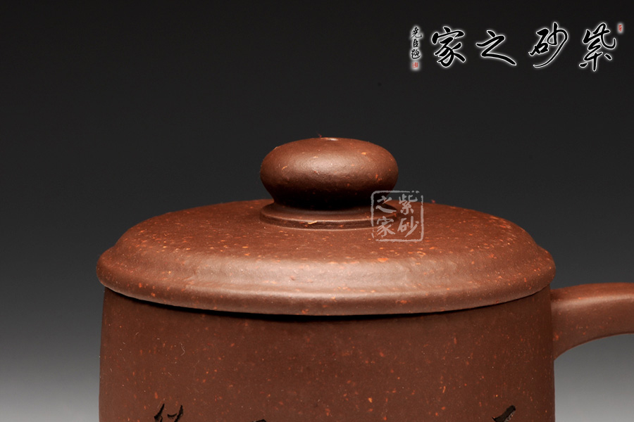此蓋杯造型簡練自然,清韻裊裊。杯身上下呈圓筒型,整體通直,緩和有度,方能變中得趣。杯蓋簡單實用,蓋上微凸,大扁圓鈕,鈕如金珠,又含金石味,既有趣,又好用。杯用飛把,形狀簡單有變,利于把握。