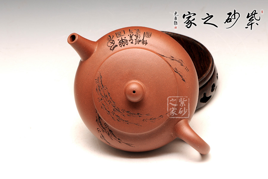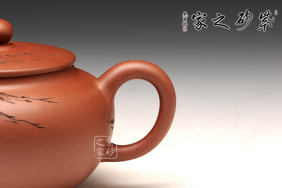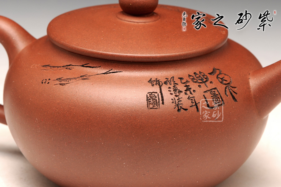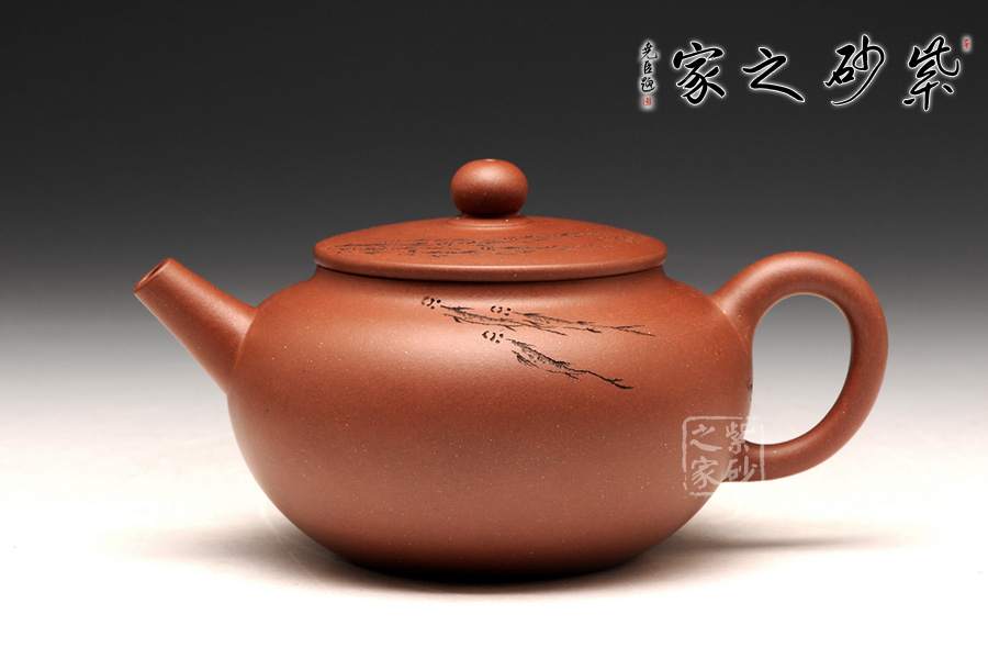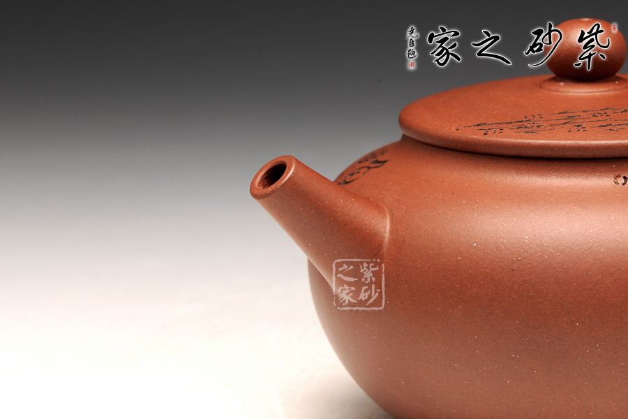 這款圓潤是一款較為經(jīng)典傳統(tǒng)的壺型,且此壺型較為多變,這款作品線條流暢飽滿,古樸大 方,有珠圓玉潤之感;壺身上松下緊,過度流暢,明接直流嘴干脆直挺,出水迅猛有力。壺身通體裝飾,裝飾手法隨意,一群游魚橫貫壺身,如一彎彩虹一般;其創(chuàng)作在傳統(tǒng)上探求實用,將紫砂的工藝、材質(zhì)、藝術(shù)作了有機的結(jié)合,頗受藏家的親睞。