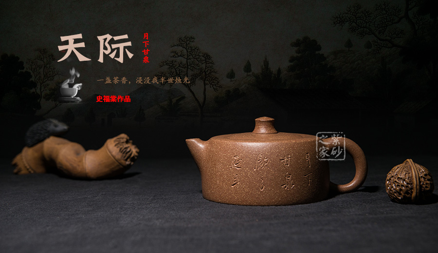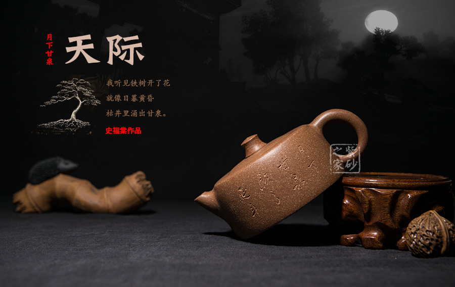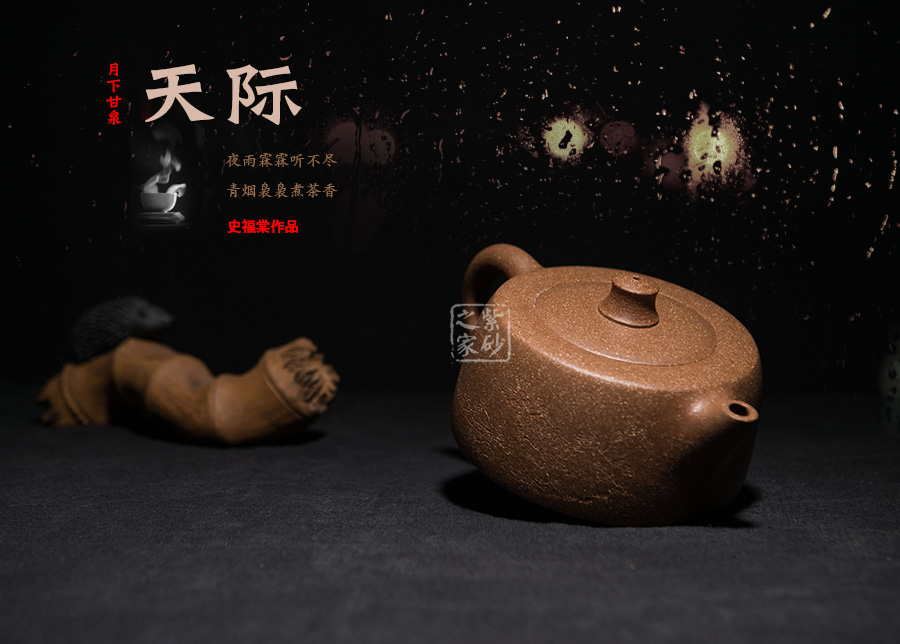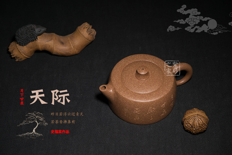 天際,經(jīng)典壺型井欄演變而來,造型澎湃蒼茫,格外大氣;此壺制作精巧,獨(dú)具匠心,壺身渾圓,威武大氣;壺把從壺身肩部向上伸出,再巧妙收于壺腹之處,線條飄逸優(yōu)美,壺身飽滿;壺嘴、把手等輪廓線既照應(yīng)又和諧,生動自然,宛若生成;天際壺總能讓人第一時(shí)間想到李白的《黃鶴樓送孟浩然之廣陵》中“孤帆遠(yuǎn)影碧空盡,唯見長江天際流”兩句話,老師將對友人的無限依戀的感情融入到紫砂藝術(shù)當(dāng)中。