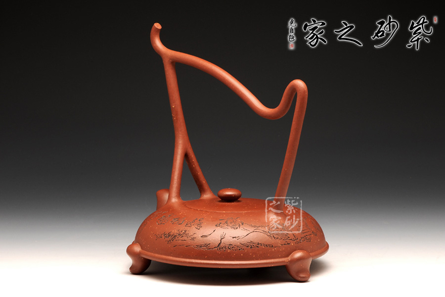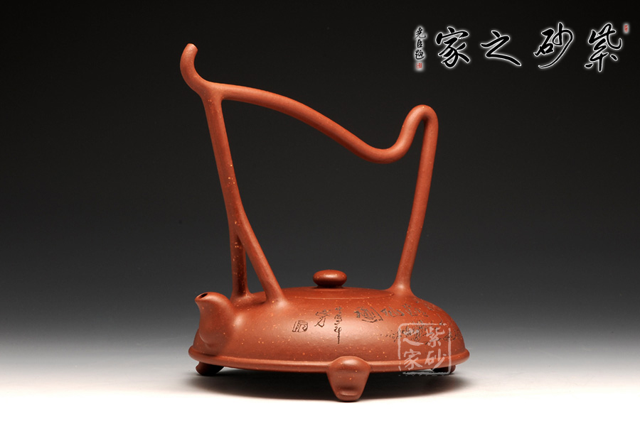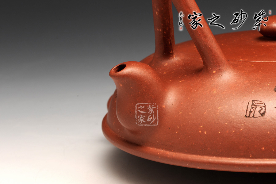 此壺半圓扁瑞,是老師對常規(guī)的一種突破,一種創(chuàng)新。在整個壺上,消除了直線這個概念,以曲線構(gòu)成全壺,不能不說是非常大膽的。壺身嵌蓋兩者柔合,一如整體,給點線之間的空間留出獨白,使得提梁把飛線橫流,蹉跎有致,拉伸了整體的藝美之感。在壺盤底部,周身線圈,三足分置,顯得沉穩(wěn)而又內(nèi)斂,配合彎流嘴,似有一種擬人之態(tài)。