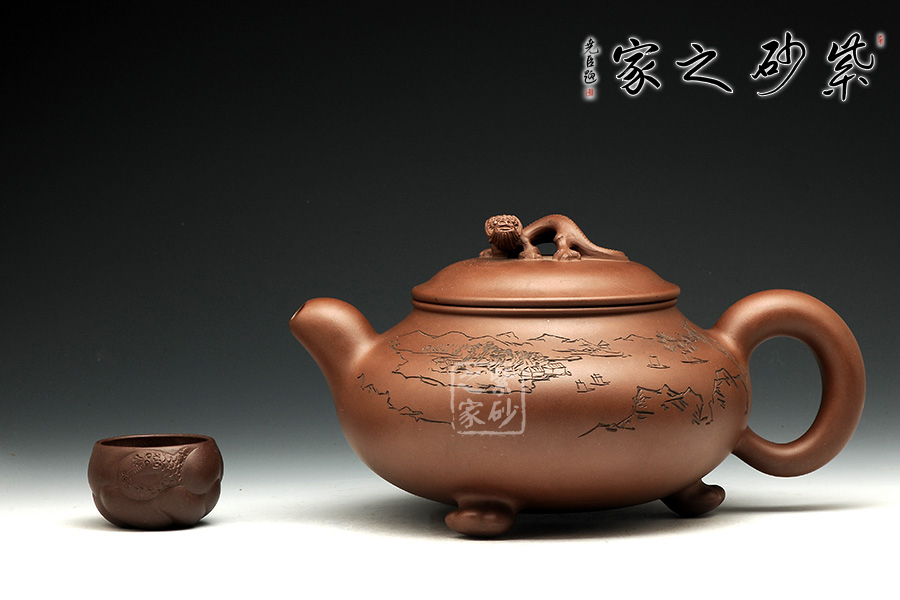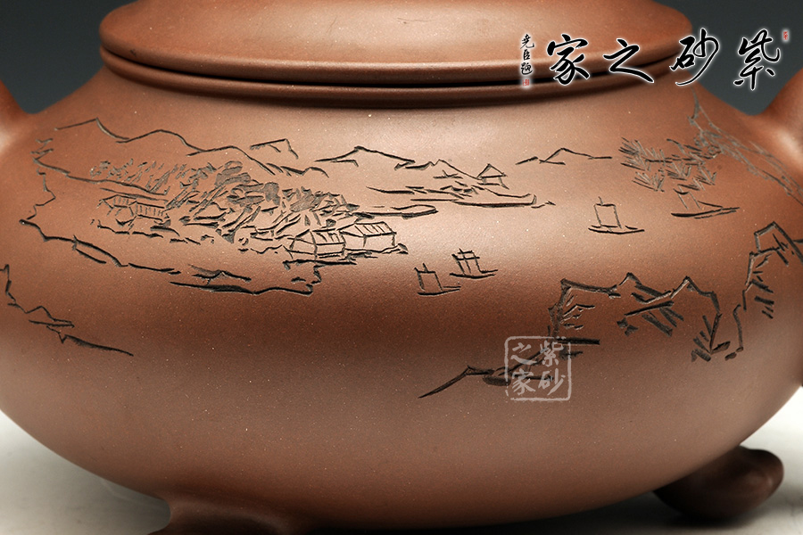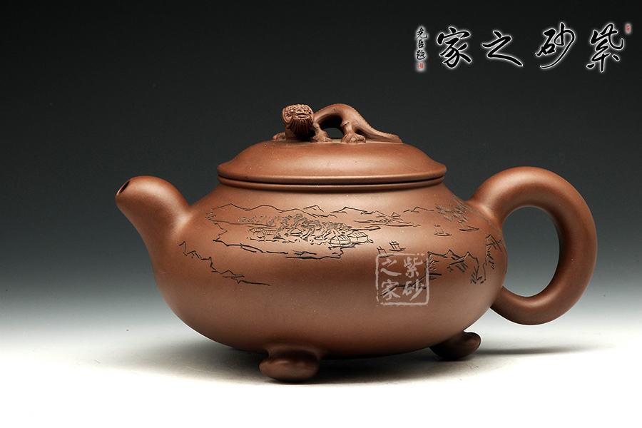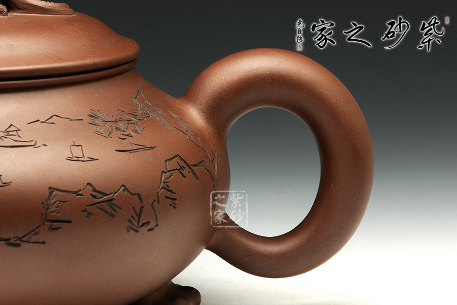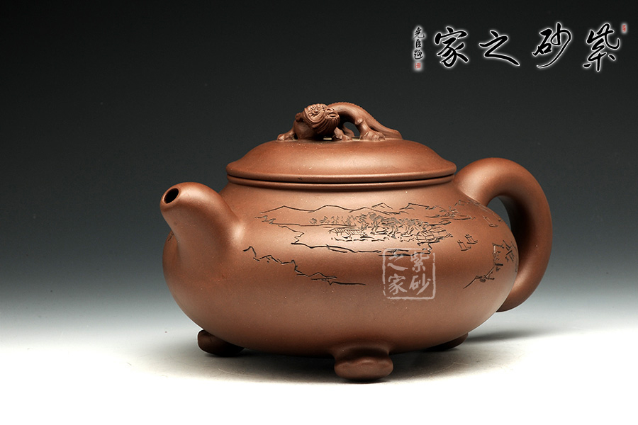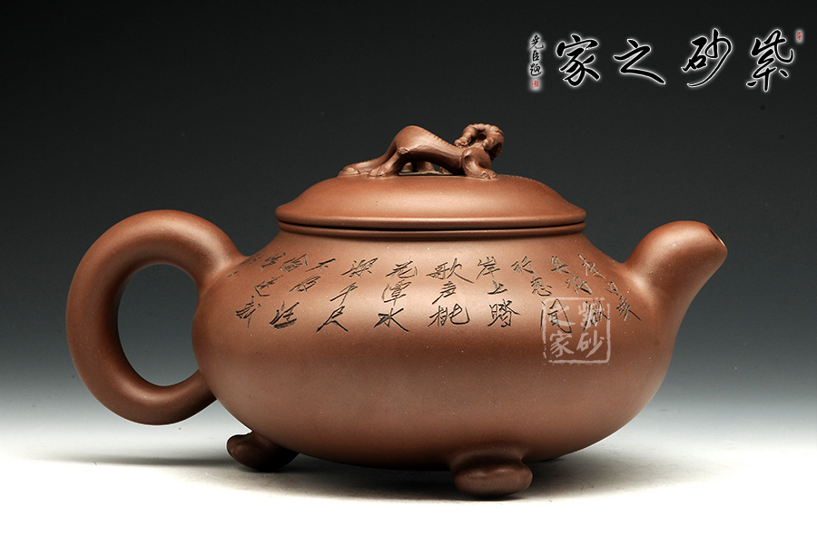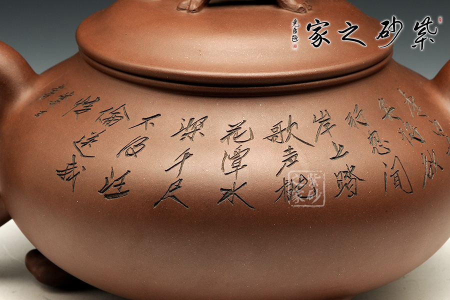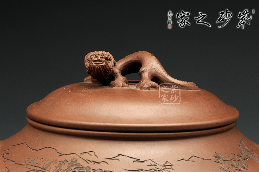 此壺造型古樸渾厚,非常特別。渾厚飽滿的壺身,在三個足底的支撐下,顯得氣韻挺拔,高健有力,好似瑞獸足腳。彎流壺嘴,圓潤可愛,出水爽利。端把渾厚呈圓形,和壺嘴完美呼應(yīng),更加強了壺的結(jié)構(gòu)之美 。壺蓋微微凸起,飽滿如帽子,生動可愛,子母線契合良好,與壺身融為一體。壺鈕瑞獸,造型別致,生動形象美好寓意。