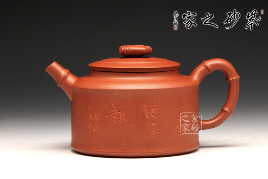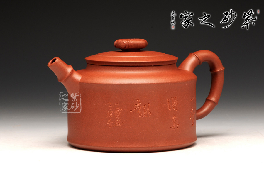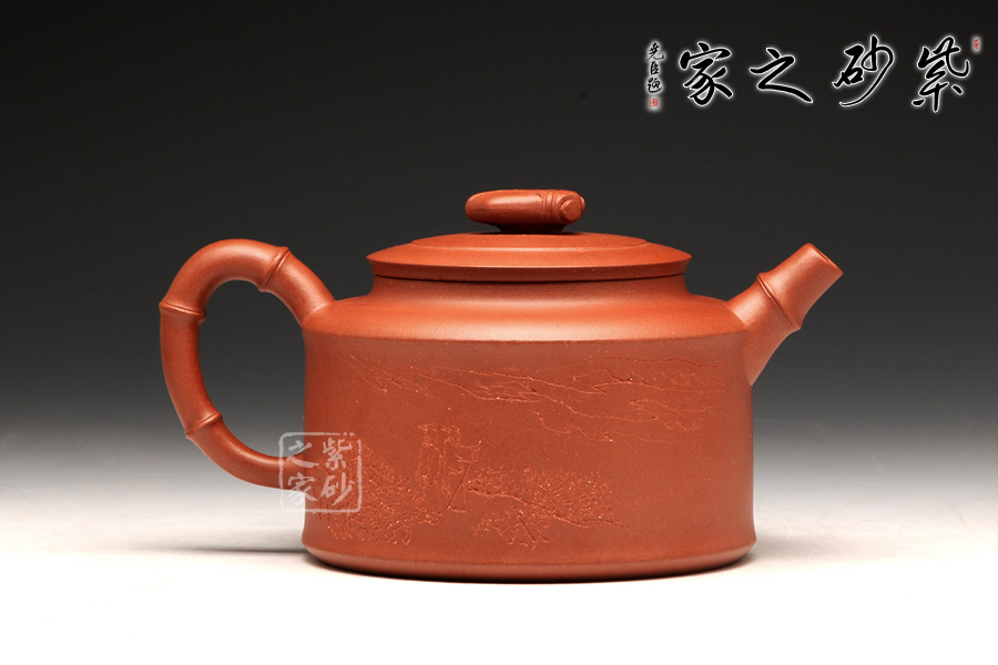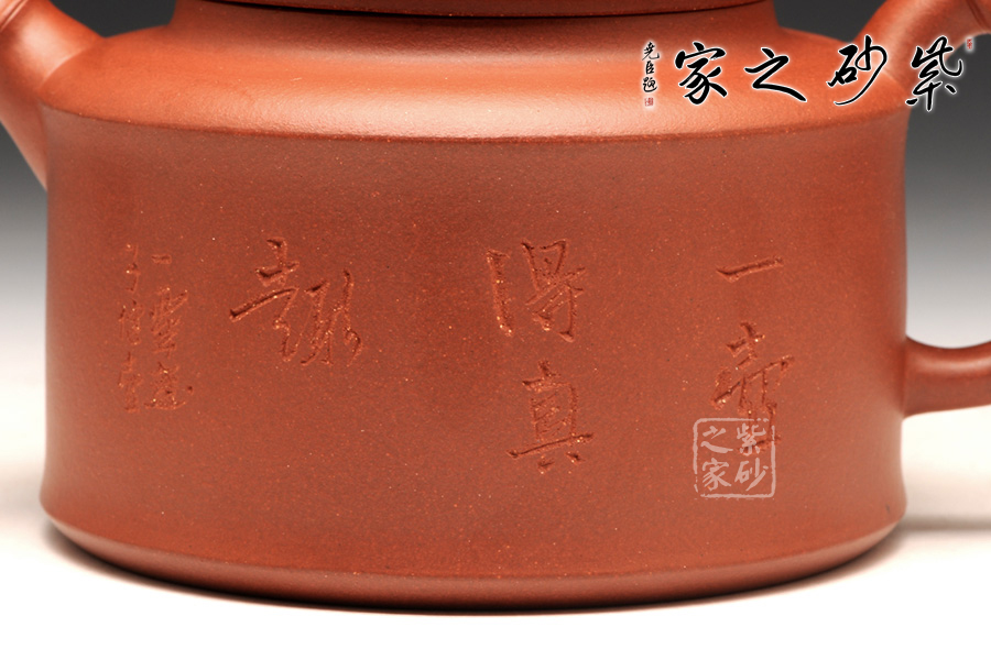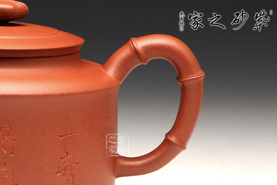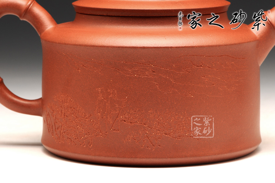 壺身是傳統(tǒng)的圓柱體,上下線條筆直,平整洗練。壺肩到頸部有圓滑過渡,蓋上分層設計,又用一只蟬來做壺鈕,雖然抽象,卻更加趣味逼真。直流壺嘴和耳形把為竹節(jié)外形,節(jié)點分明有力,足見工藝超凡。加之壺身上的刻繪沉穩(wěn)內(nèi)斂更顯無窮。