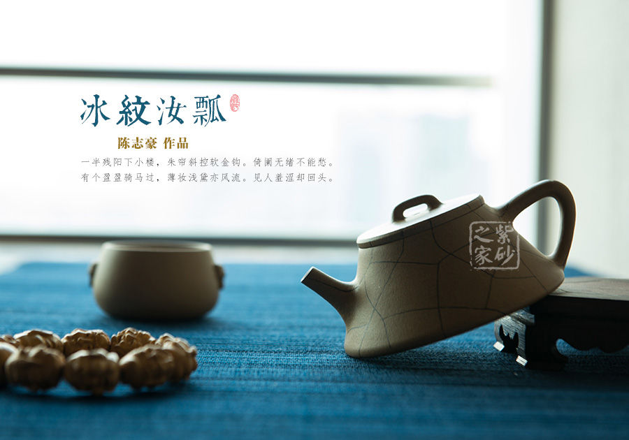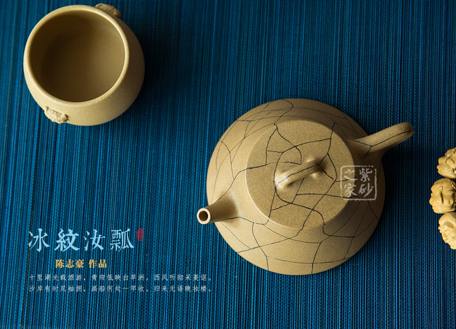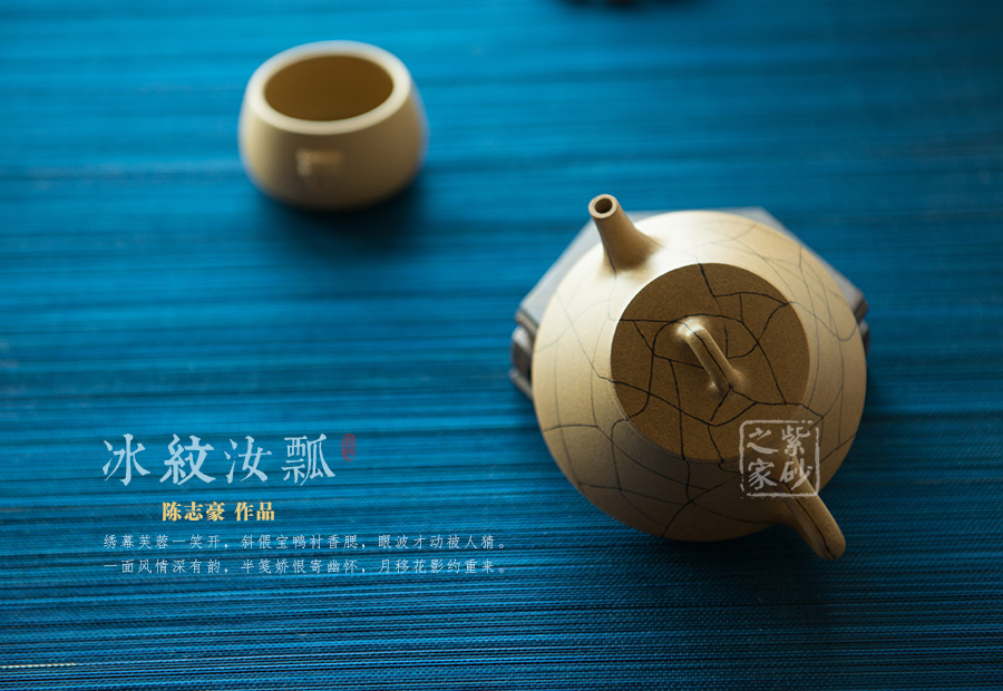 壺橋形壺鈕,中間略顯平整,整款壺更加穩(wěn)重。壺身較矮,梯形狀的壺身,線條緩和均勻至壺底。從整體來(lái)看,此壺的的流把均顯細(xì)膩,直流嘴挺峭而出,與壺把的三角形相應(yīng)和。同時(shí),也與壺鈕的形態(tài)形成對(duì)應(yīng)。冰紋裝飾讓此壺美感增強(qiáng),紋理獨(dú)到讓人神思無(wú)限,該壺值得珍藏和把玩。