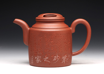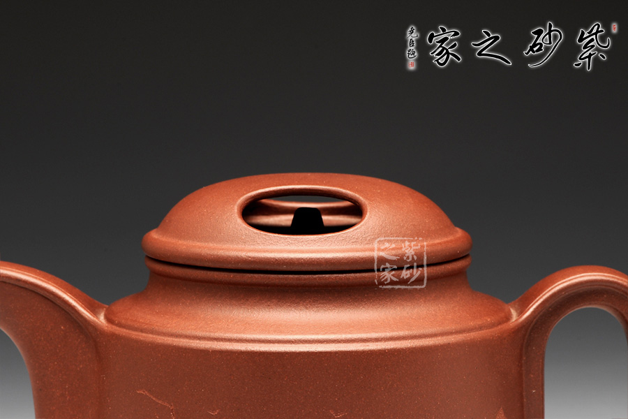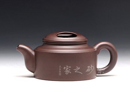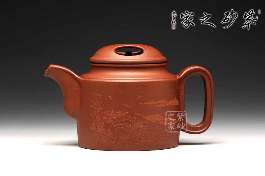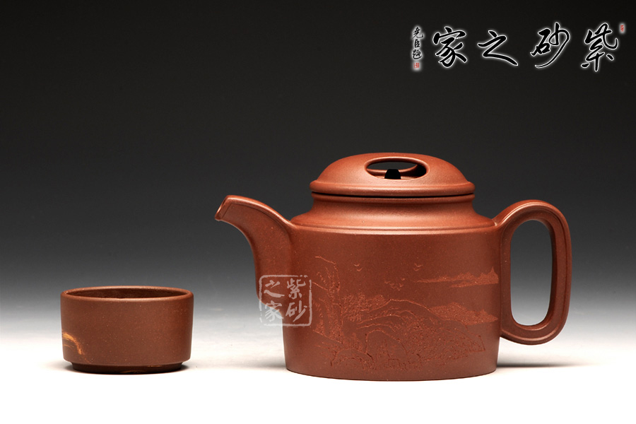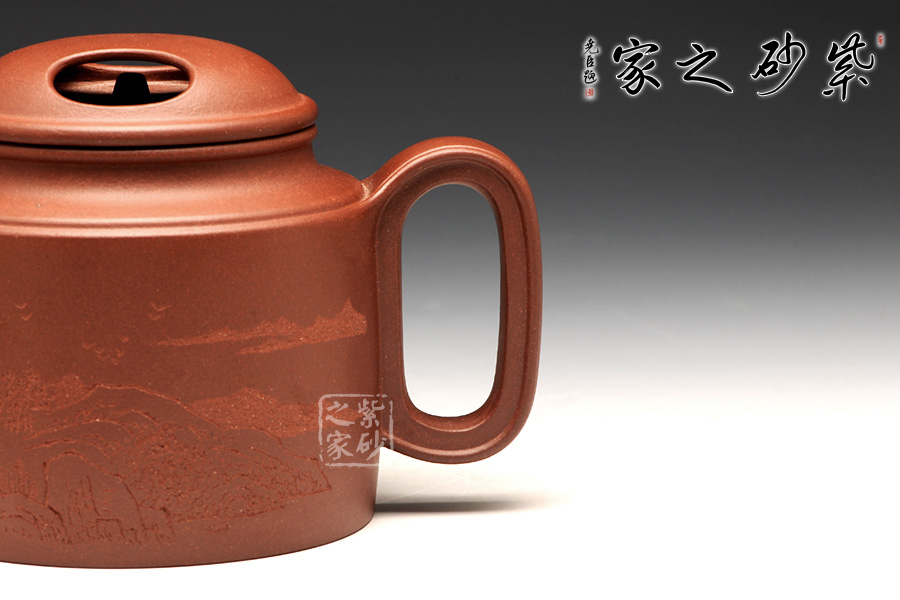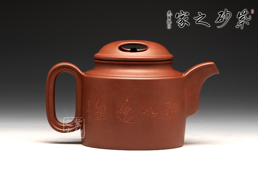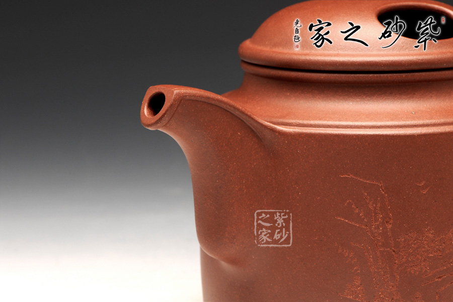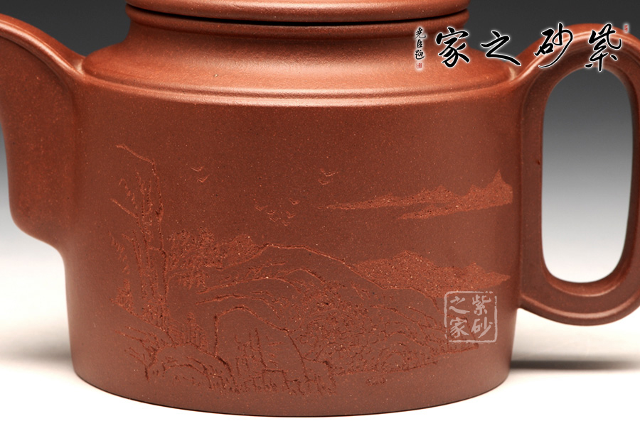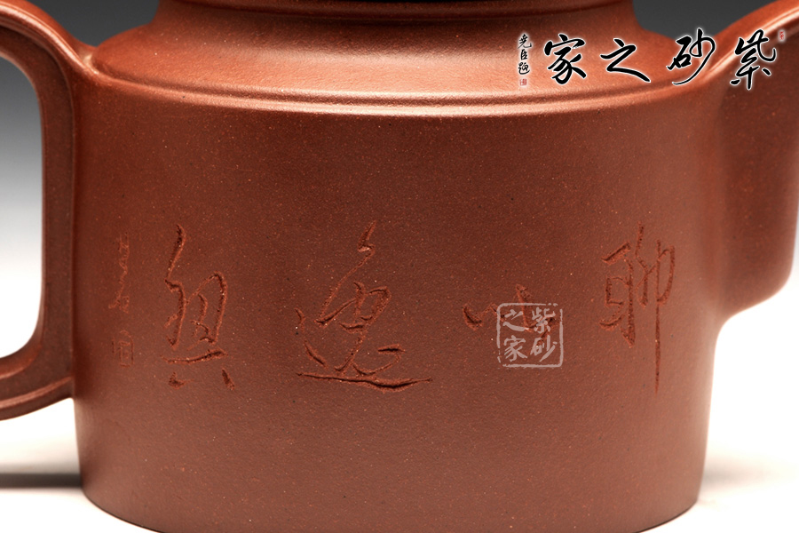 壺牛蓋的子藏于內(nèi),明暗結(jié)合,層次分明。壺嘴與壺把圓中有方,線條不再一味的細(xì)膩圓潤,更多了一份簡練,棱線分明,相互呼應(yīng)。壺身前繪刻,山水自在,給樸素的壺身增添了一份韻味。而壺背面刻繪“聊以逸興”更表達(dá)了一份紫砂的美好情調(diào)。