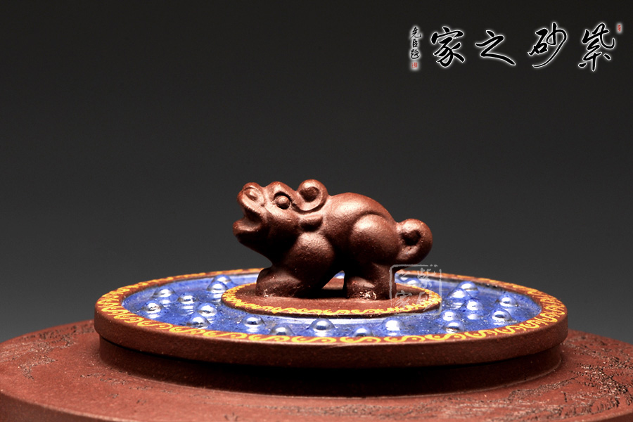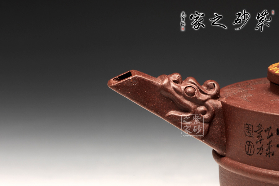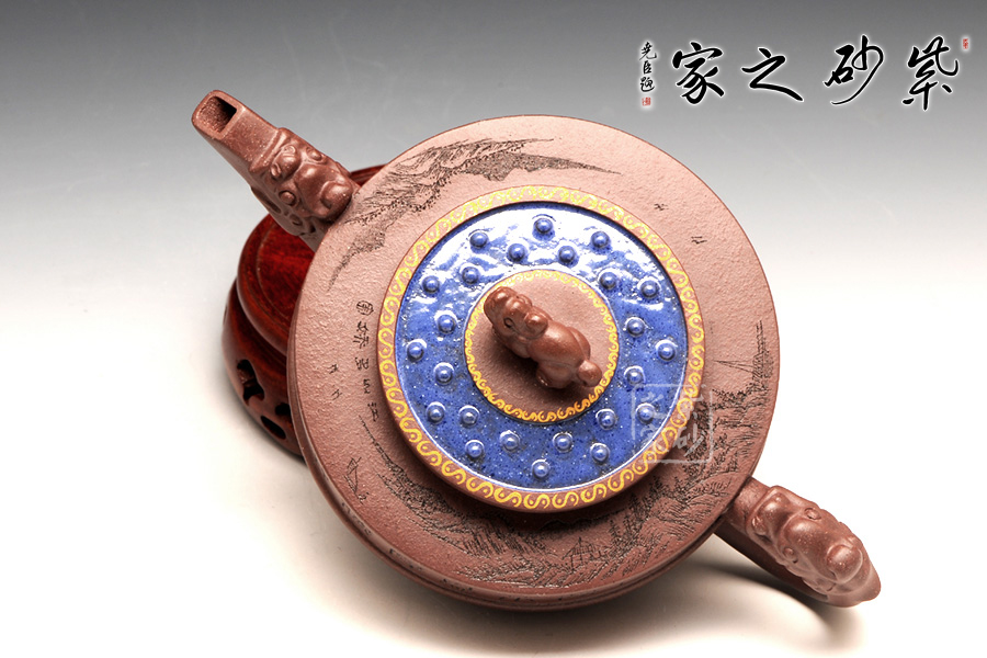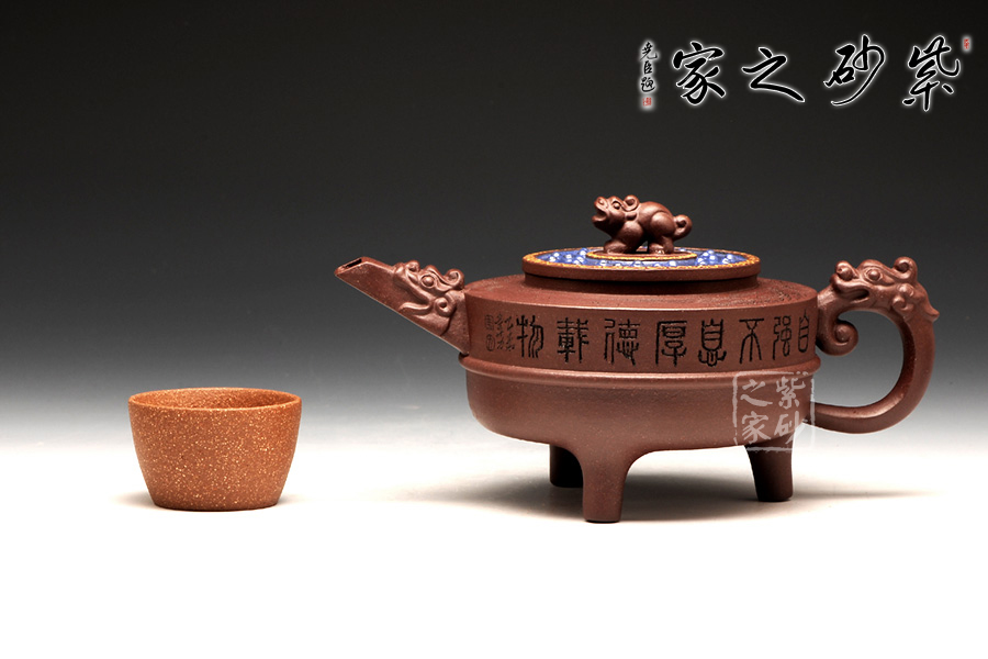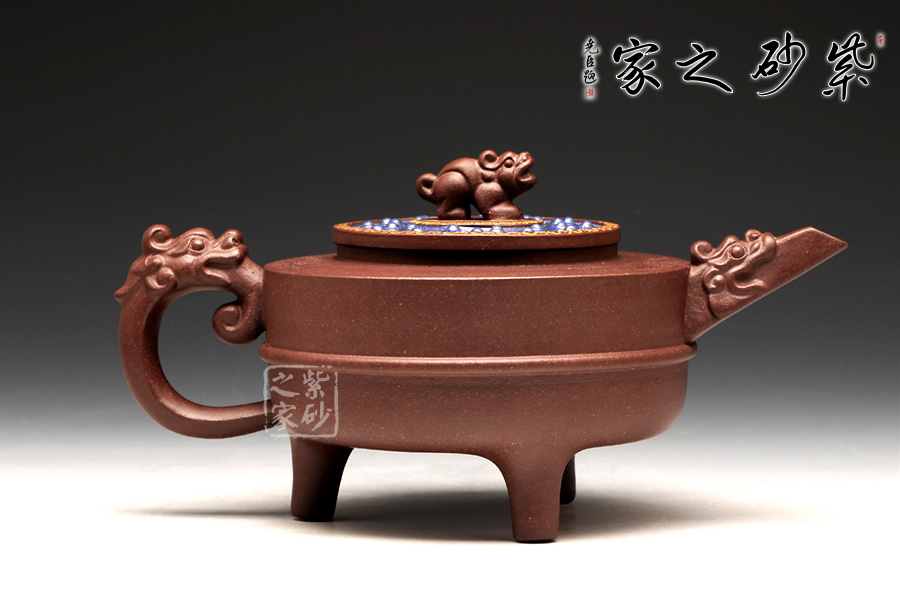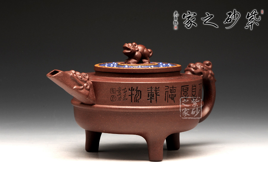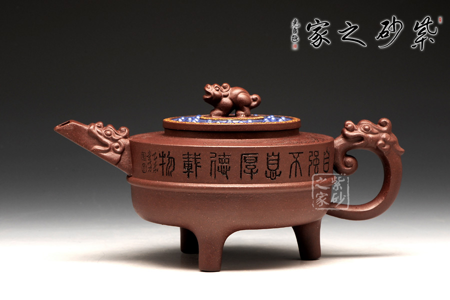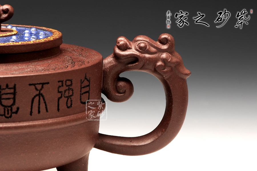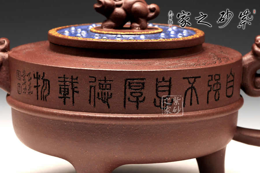 此壺以鼎為爐作為基調(diào),選用紫茄泥全手工制作,三足鼎力,圓盤大氣,好似孕育精華,低調(diào)而不失典雅。中華特有的龍為嘴及把,彰顯其文化特征,以瑞獸為鈕,精致的同時(shí)亦與中國(guó)古老禮儀有關(guān),壺蓋藍(lán)色璀璨,一彎流趁勢(shì)而出,壺的刻繪“自強(qiáng)不息,厚德載物。”,表達(dá)中華民族的氣節(jié)。作品以優(yōu)雅的形態(tài)以及典雅的氣質(zhì),將紫砂藝術(shù)與古老文明表現(xiàn)得淋離盡致,實(shí)為一款難得的佳作。