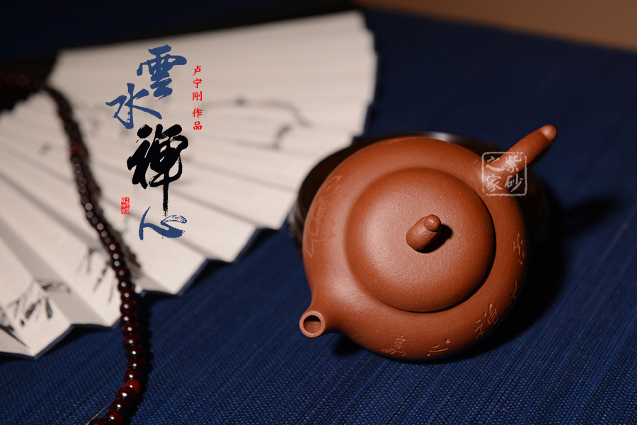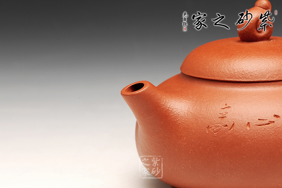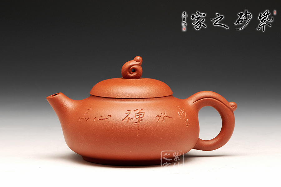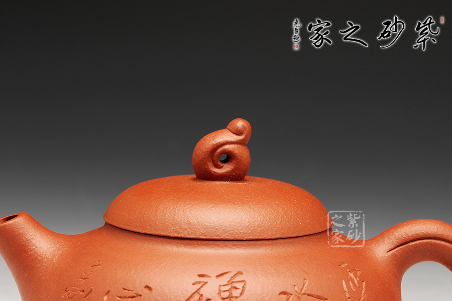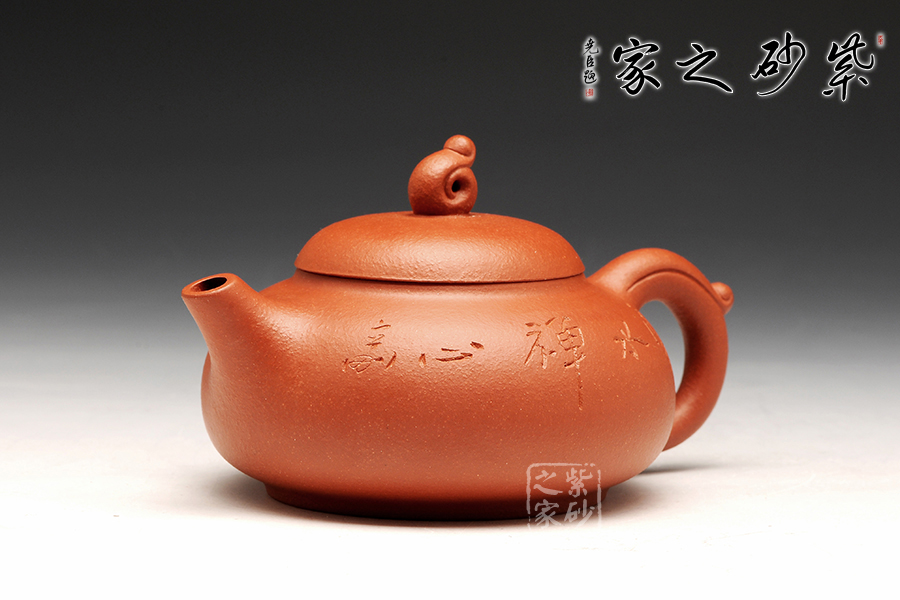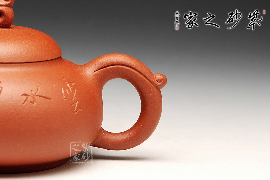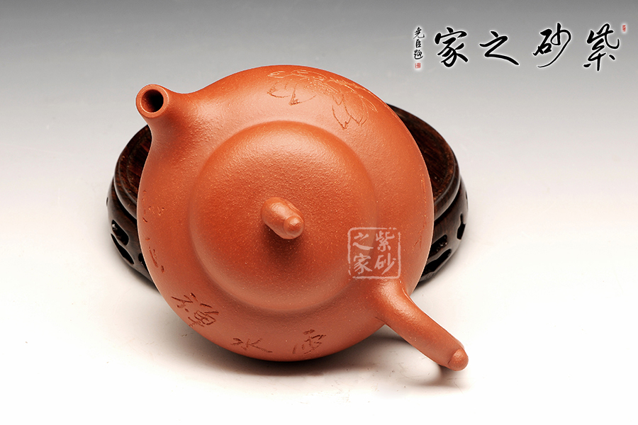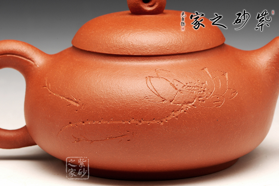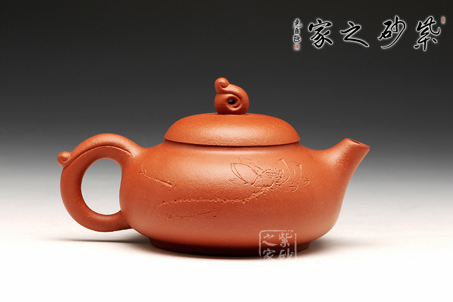 壺型扁圓而潤,圓滑精致。球型外觀極度對稱,壺鈕中心位置,似祥云和浪花,似云似水,有上善若水、祥云飄動之態(tài);壺嘴小巧短促,收尾有力。壺把則是起伏過渡,線條謙和而出,似水浪而生,韻味不絕。并陶刻荷花,一花一世界,有禪意之態(tài);動靜結合,茶禪一味,有佛家之意;又具天人合一、道法之然,體現(xiàn)道家精神!