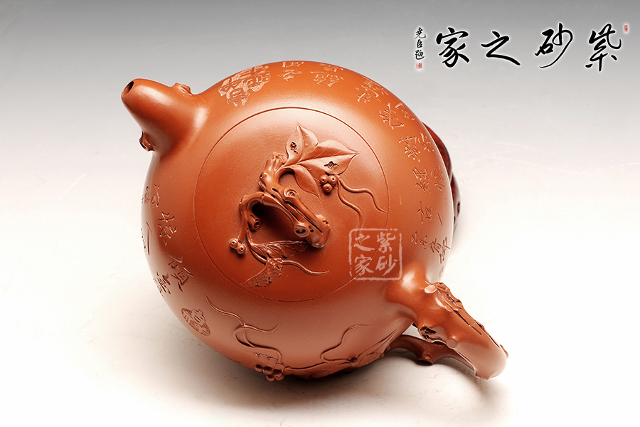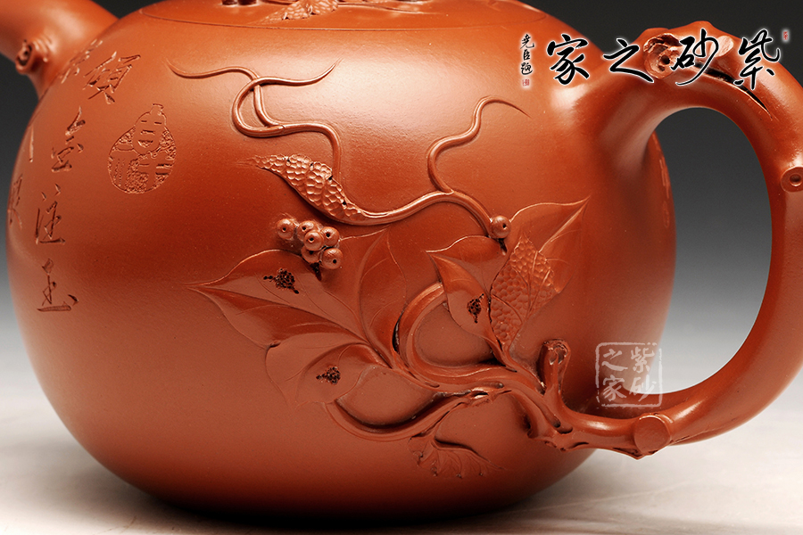 此款葡萄花貨,壺型較傳統(tǒng)樣式略高,更加飽滿(mǎn)。壺身正面葡萄藤裝飾為主,葉子自然舒展,極為的形象而逼真,仿佛真有一葡萄藤蔓延其上。整器為飽滿(mǎn)的圓器,嵌蓋設(shè)計(jì)與壺身渾然一體,壺鈕為虬曲的葡萄藤,周時(shí)讓人感覺(jué)此壺充滿(mǎn)大自然的氣息。