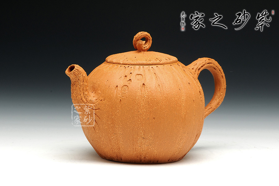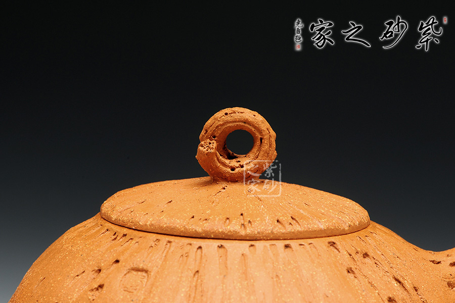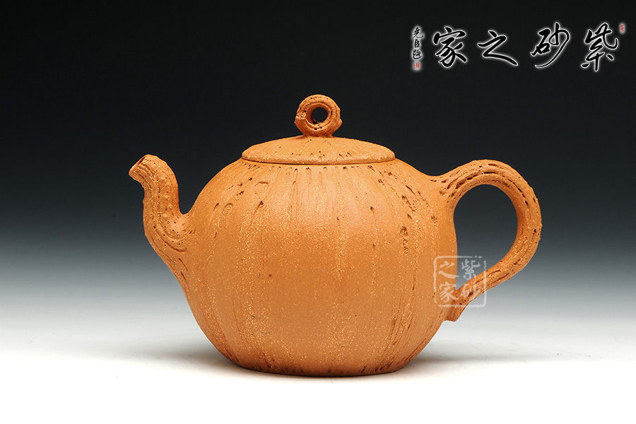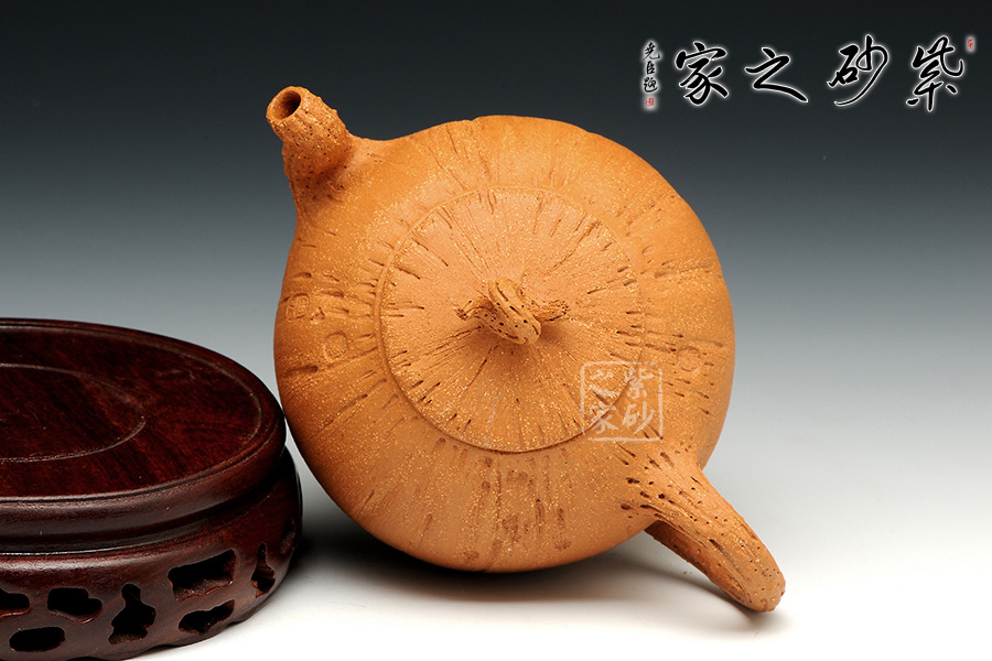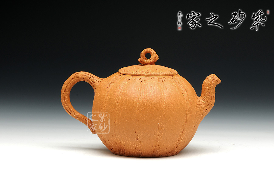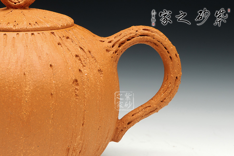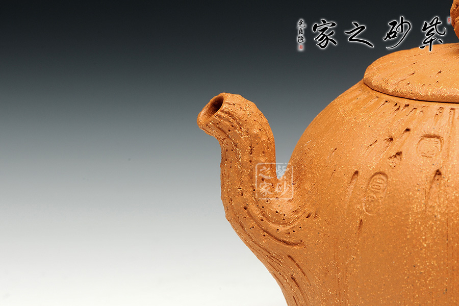 金秋季節(jié),碩果豐碩,原礦黃金段泥料的黃瑞,似秋天的暖風(fēng),吹起金燦燦的一片田野之景,似有收獲。此壺飽滿的壺身圓潤,如同果實一般,豐收之意。壺身似南瓜表面紋理坑洼,層次有感,壺鈕似古藤彌漫,老樹昏鴉,壺把與壺嘴節(jié)點攀枝明顯,刻畫生動,結(jié)藤而出整壺的意蘊,使人親于自然,輕語有感。