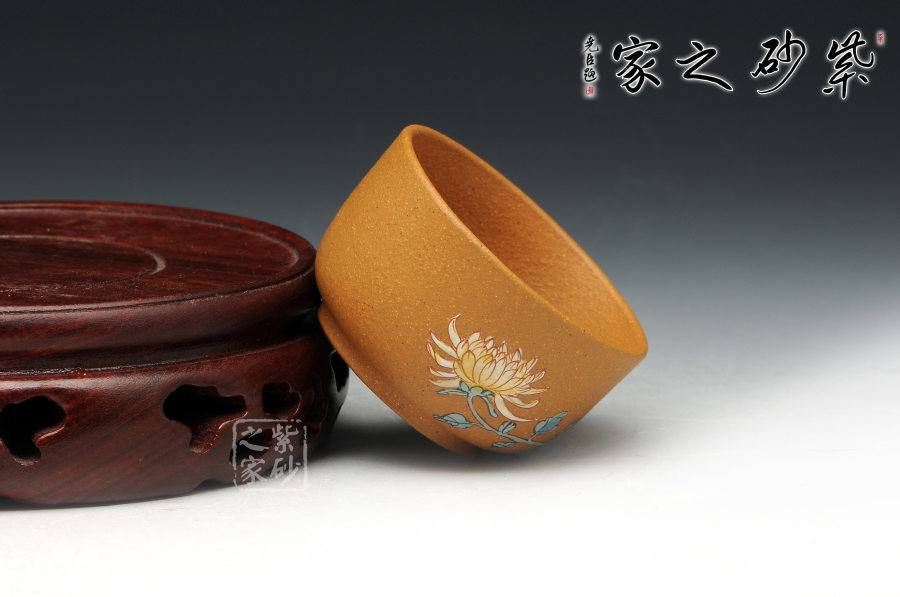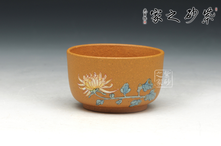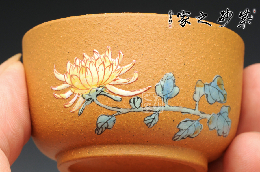 此杯精致美觀,是品茗的佳作。杯子小巧可愛,寓方于圓??诖蠖懵哉?,上下圓筒型線條變化均勻和緩,至底部收尾利落自然。以紫砂泥精制,加之釉水點彩菊花,顯得古樸典雅,值得玩味。