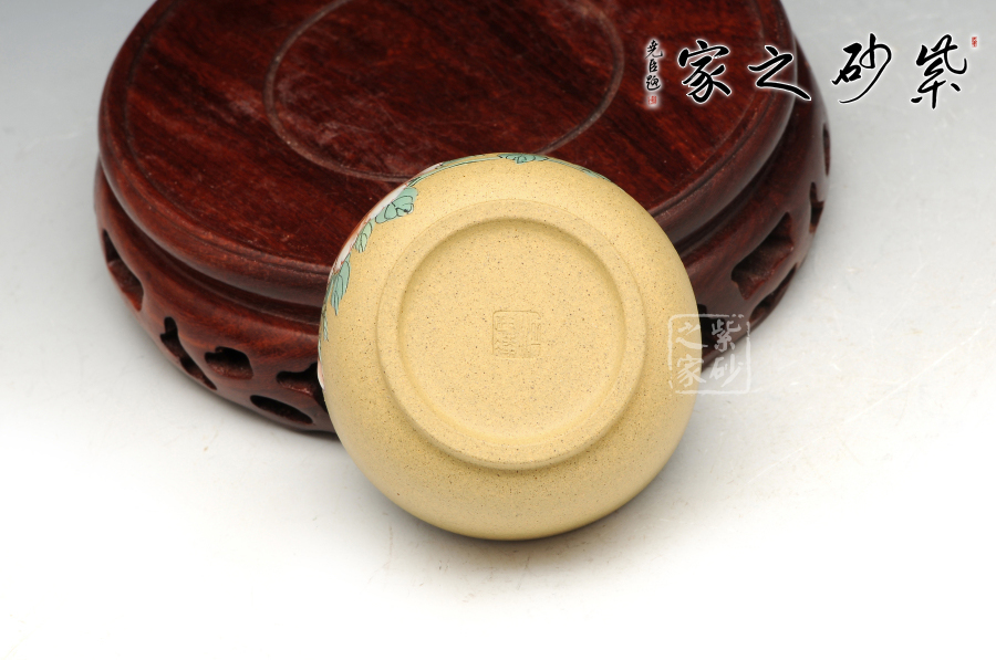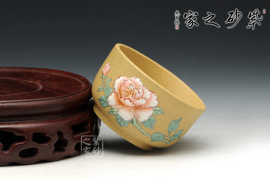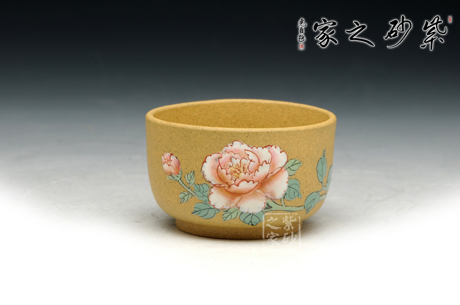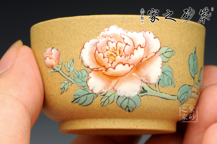 此杯精致美觀,是品茗的佳作。杯子小巧可愛(ài),寓方于圓。口大而足略窄,上下圓筒型線條變化均勻和緩,至底部收尾利落自然。以紫砂泥精制,加之釉水點(diǎn)彩牡丹,顯得古樸典雅,值得玩味。