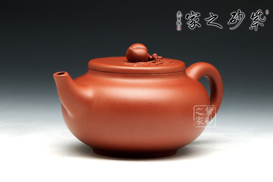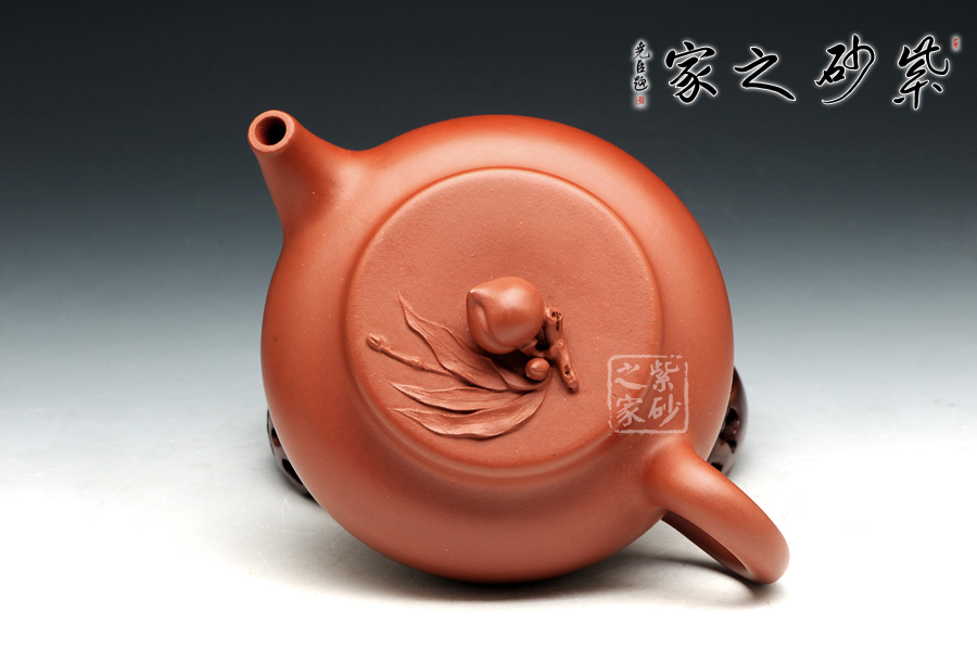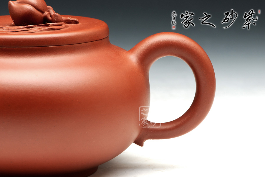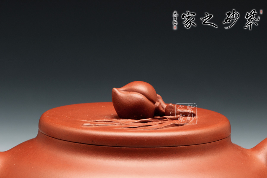 壺身整體飽滿,外觀的細(xì)膩和圓潤讓人愛不釋手。壺蓋設(shè)計簡單直敘,平整好似玉盤,頭戴一顆小壽桃作壺鈕,圓潤的形態(tài)讓人喜歡。彎流壺嘴小巧可愛,出水爽氣。壺把厚實耳型,拿捏方便。整器以型喻意,實為難得!