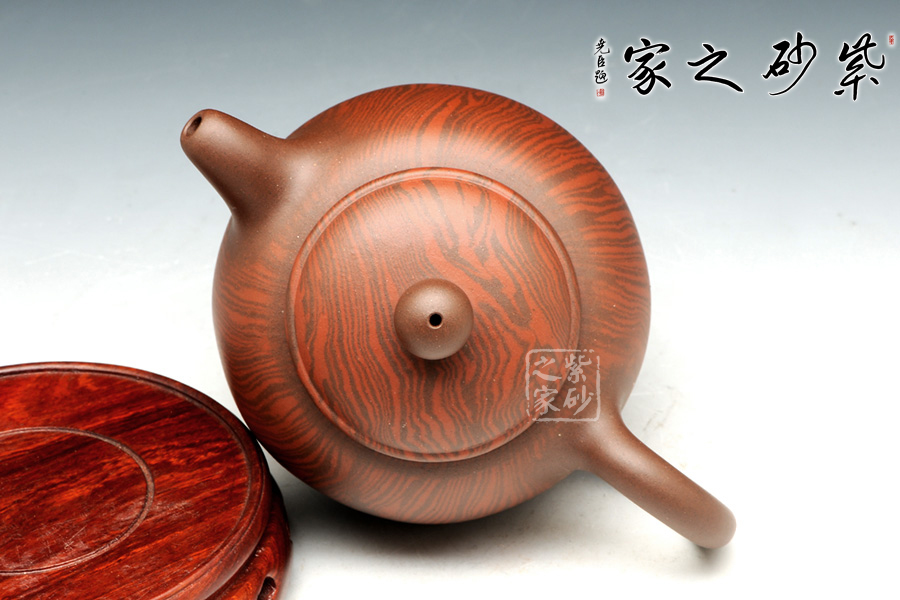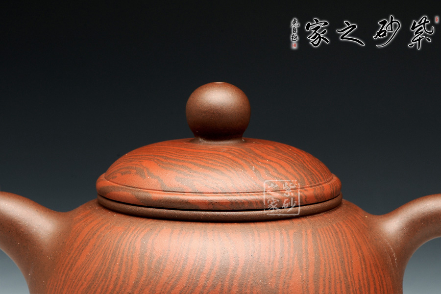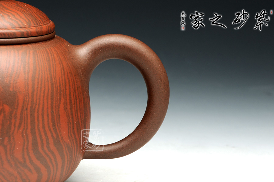 此壺壺身圓而略長之形,扁圓頂壓蓋。壺鈕為一圓珠點綴于壺蓋之上,靈動而有生氣。耳形壺柄上大下小,在整壺比例中大小適中,易于持握,有一種舒心的隨意之感。器型周正,飽滿的曲線上延便是嘴微曲的短流,短流與壺體的結(jié)合十分協(xié)調(diào)。