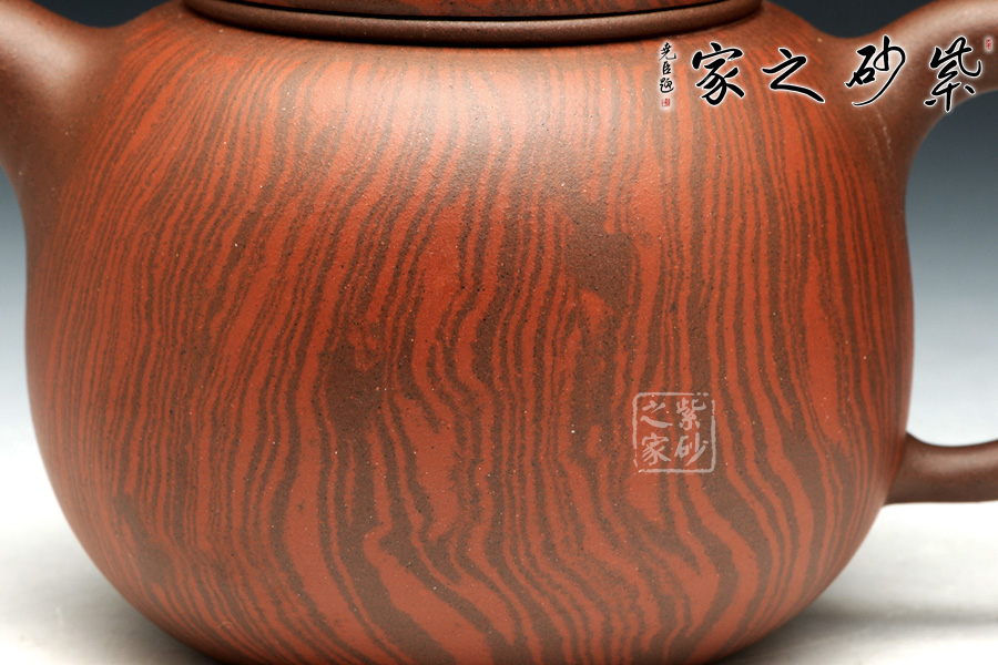 紫砂絞泥是采用兩種或兩種以上不同顏色的紫砂泥,經(jīng)人工揉合、按壓、層疊、鑲嵌等多種手法絞和而成,再通過拍打泥片,并按要求切割泥片、鑲接泥片, 直至打 好身筒,這樣便在壺身上形成不規(guī)則卻十分自然和諧的紋飾圖案,如天際流云、似雨后彩虹;如湖光山色、似大漠原野等等,這些雖在小小的壺面上呈現(xiàn)出虛虛實實的圖象,卻能以小見大地營造出亦真亦幻、自然天成的意境,這正是紫砂絞泥具有的裝飾性。