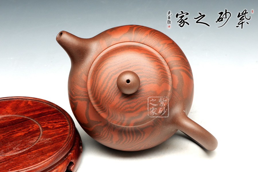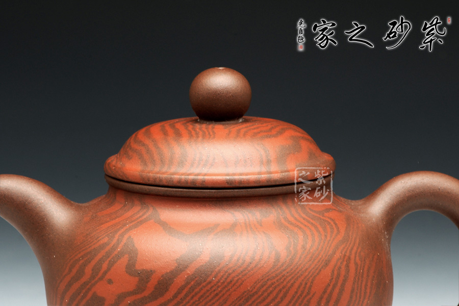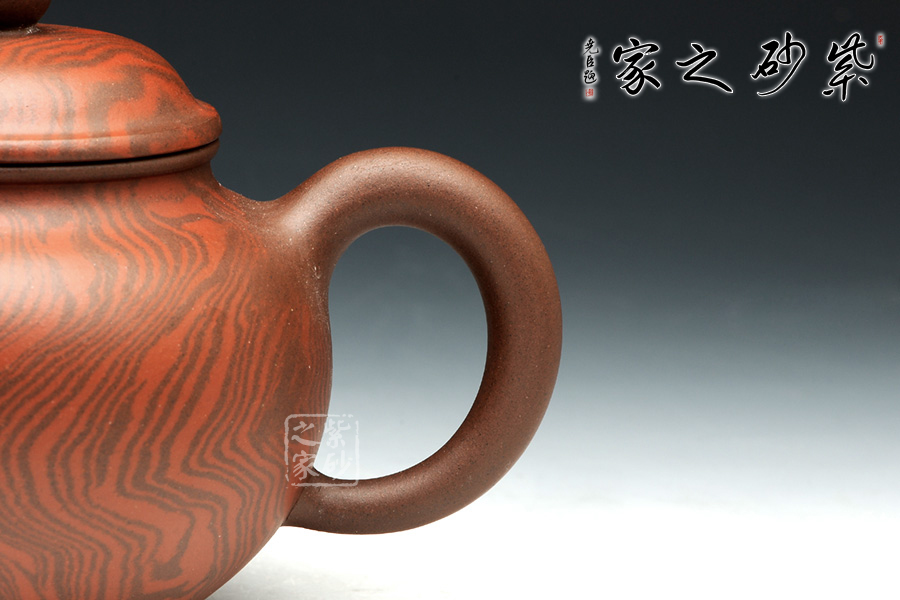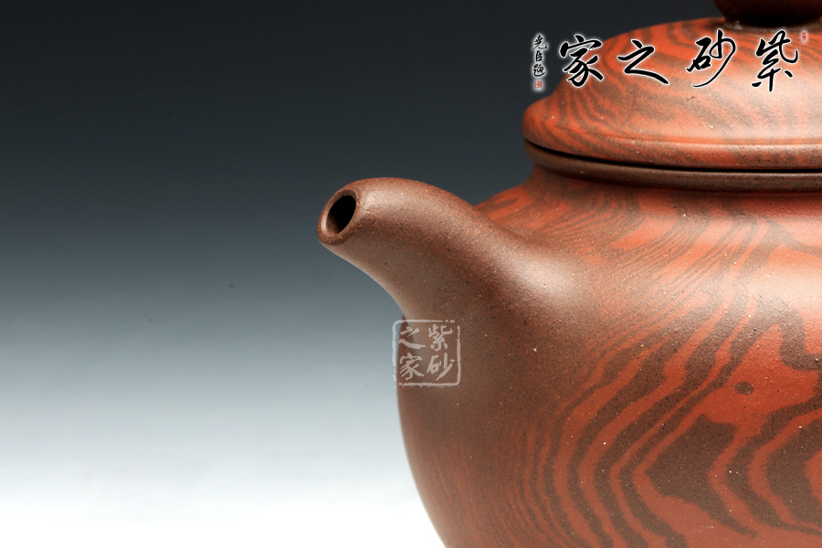 此壺為絞泥掇只,頗顯難得。半圓的壺蓋,圓鈕,線條流暢,比例得當(dāng),壓蓋略微渾厚,點線之間見出魅力,子母線口蓋溫和嚴密,骨肉亭勻,簡練大方,制作頗見功力;彎流嘴胥出,在端頭下壓,柔美之姿明顯,壺柄略微上抬之后優(yōu)雅滑落而下,形成一條圓潤飽滿的弧線,樸雅大方。