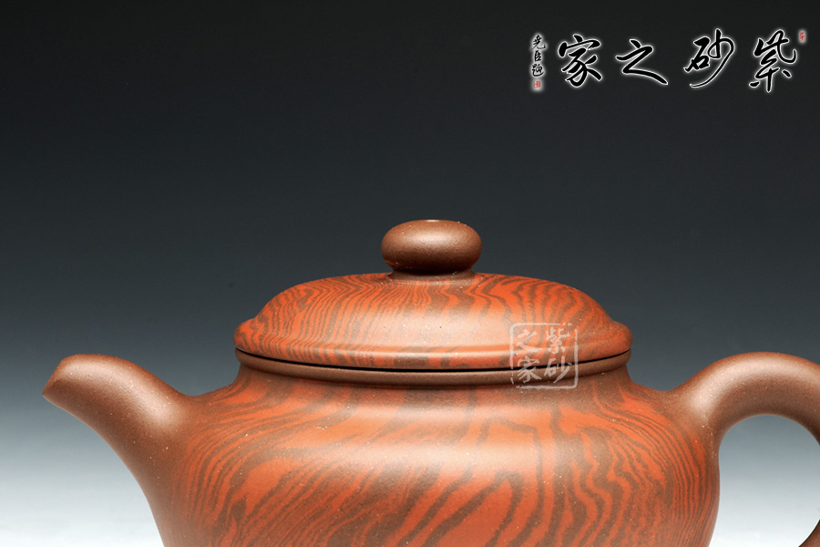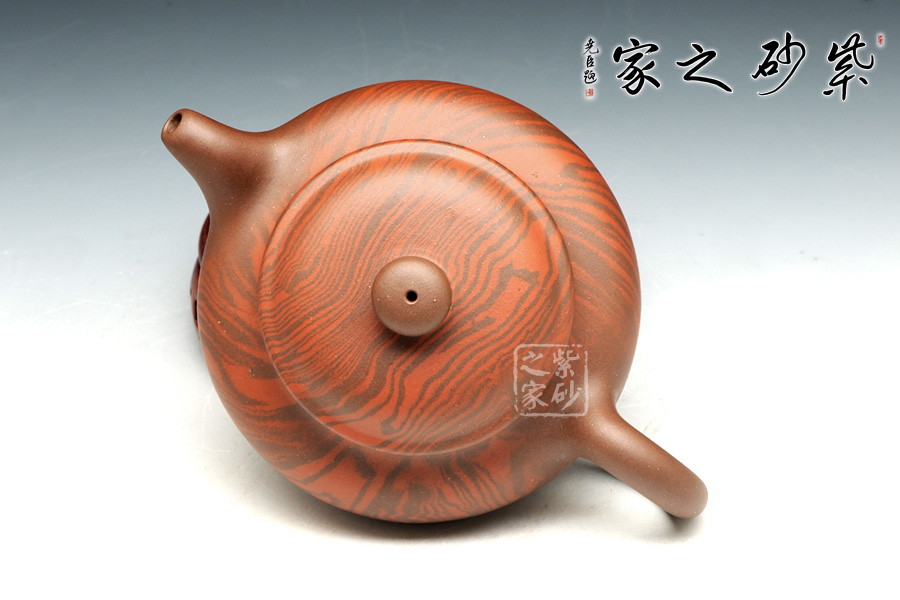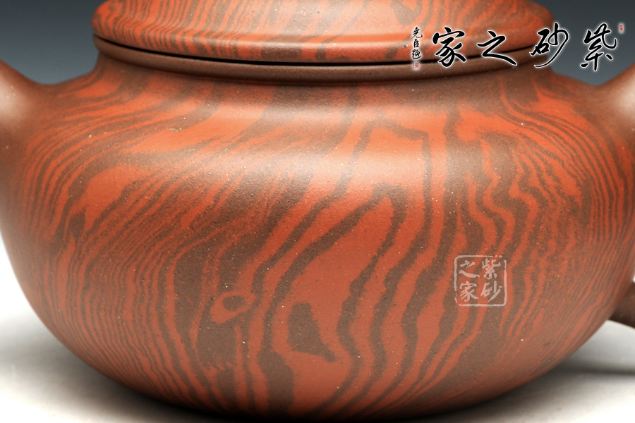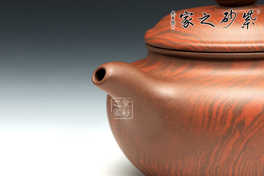 這款仿古壺大致輪廓上與傳統(tǒng)壺毫無(wú)二致:卵圓形壺鈕、圓潤(rùn)壺身、一變嘴、換把隨身勢(shì),然而細(xì)心的壺友可以發(fā)現(xiàn)此壺壺鈕的立體感極強(qiáng),同時(shí)壺頸顯得修長(zhǎng),概括而言,整款壺雖然器縱橫比例到位,但空間感極為明顯,給人一種疏密有致的感覺(jué),足見(jiàn)老師在壺形制作商的獨(dú)特之處。加之,絞泥的工藝手法,使得此壺更具古樸藝美。