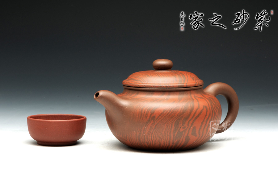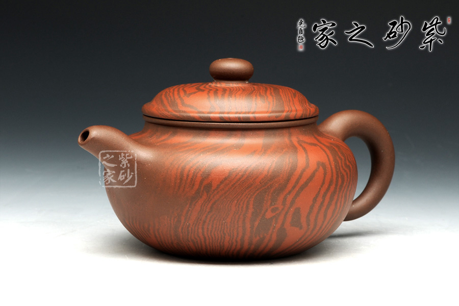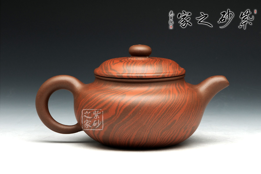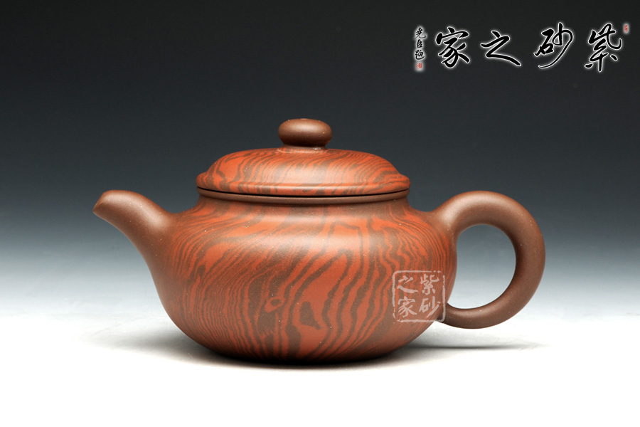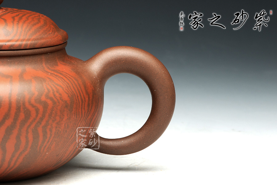紫砂絞泥是采用兩種或兩種以上不同顏色的紫砂泥,經(jīng)人工揉合、按壓、層疊、鑲嵌等多種手法絞和而成,再通過(guò)拍打泥片,并按要求切割泥片、鑲接泥片, 直至打 好身筒,這樣便在壺身上形成不規(guī)則卻十分自然和諧的紋飾圖案,如天際流云、似雨后彩虹;如湖光山色、似大漠原野等等,這些雖在小小的壺面上呈現(xiàn)出虛虛實(shí)實(shí)的圖象,卻能以小見(jiàn)大地營(yíng)造出亦真亦幻、自然天成的意境,這正是紫砂絞泥具有的裝飾性。