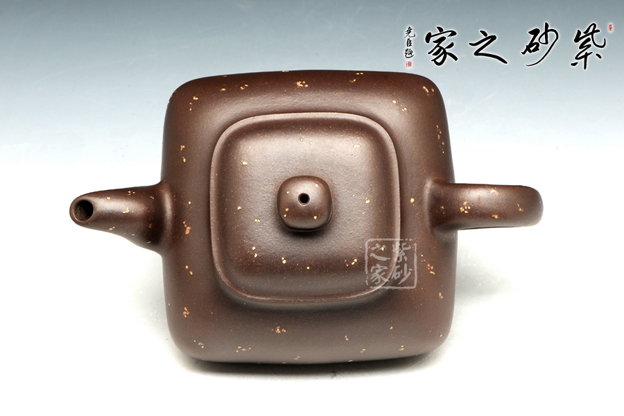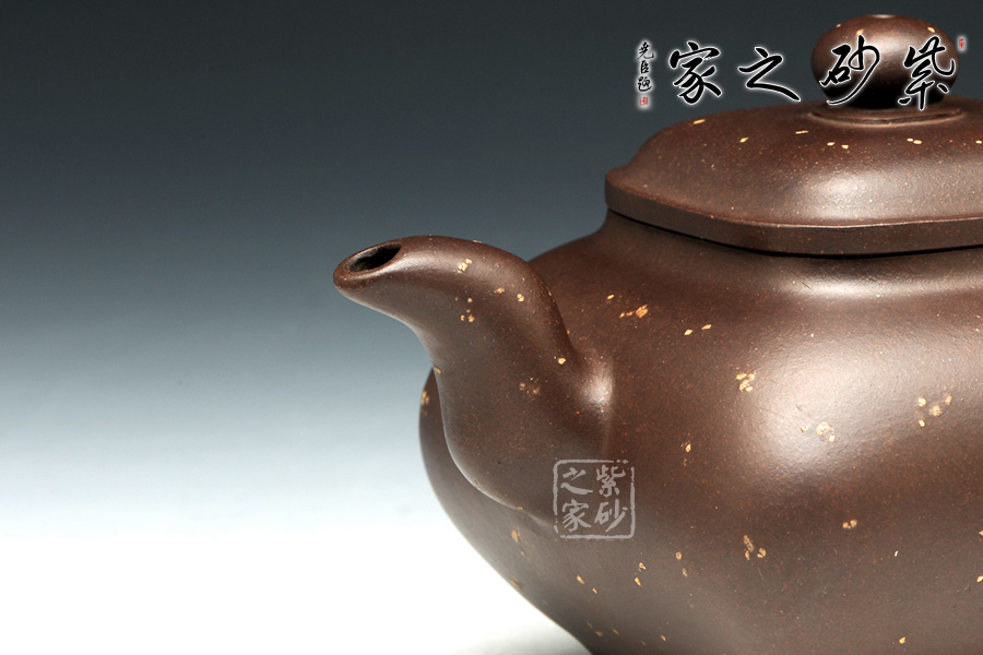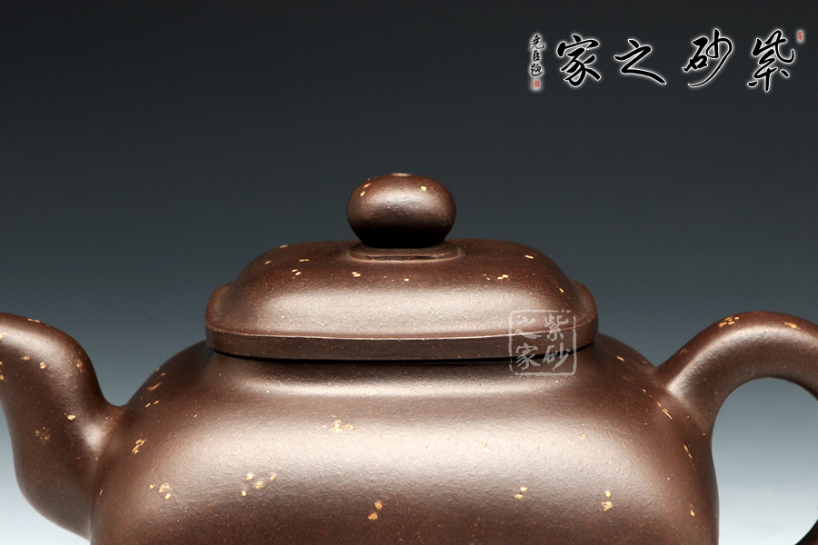 傳爐是紫砂壺的一個(gè)經(jīng)典器形,其制造型取材于青銅器,而原礦紫泥的色調(diào)則將這種歷史感無限放大,覆蓋點(diǎn)砂星辰,仿佛有更多的神秘和細(xì)膩。器身形狀以方器為基本形,但方中寓圓,比一般方器多了一份圓潤之美。壺嘴的造型難度亦高,方中帶圓, 圓里寓方,三彎流式曲折有致,出水流暢;壺蓋延續(xù)了全器造型特微,方型圓角,壓蓋形式,制作精良的壺蓋要能四面通轉(zhuǎn)無礙,且面面俱到,能接續(xù)全壺氣韻。底足皆采用四顆“釘足”形式,且多屬短柱型,精巧別致,落地穩(wěn)重。