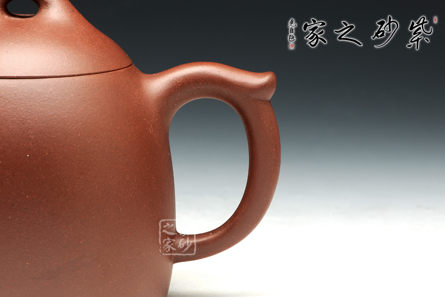 此壺為傳統(tǒng)經(jīng)典器型,作者將中國古代的秦權(quán)錢與紫砂壺巧妙地結(jié)合在一起,整體造型設(shè)計為秦代貨幣秤砣的樣式,構(gòu)思精巧,器型大氣。一彎嘴短而爽利,大耳形壺飛把,拿捏得手。整款壺以全截面接地,器型穩(wěn)重,截蓋,弧鈕鈕,整體器形完整,線條簡潔流暢。