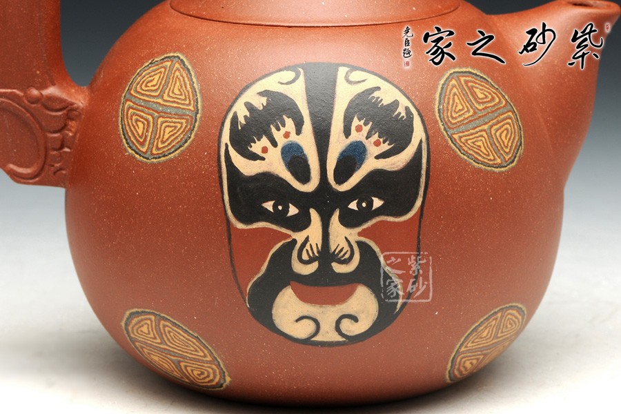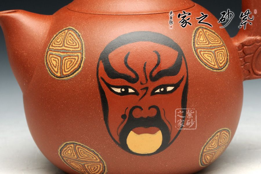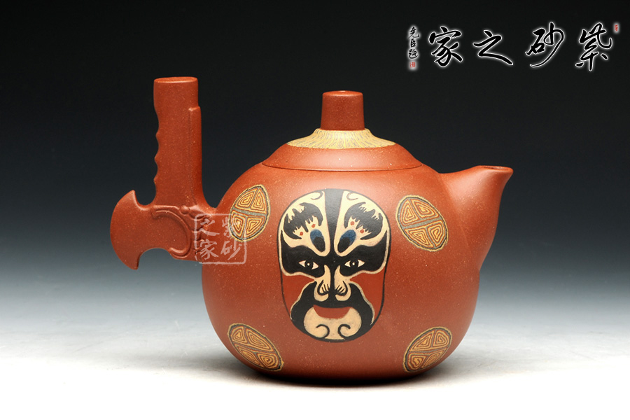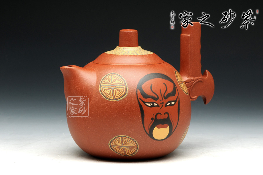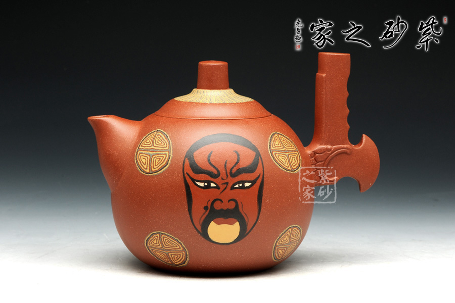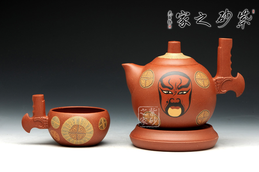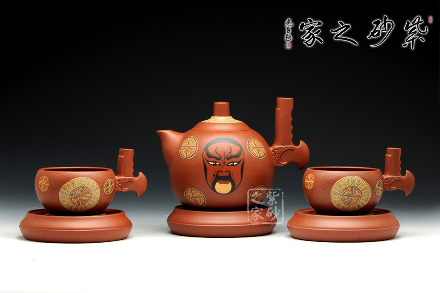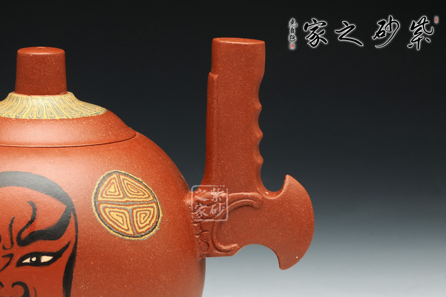 此套壺設(shè)計新穎,壺身圓潤,以絞泥紋飾裝飾壺身,并采用鑲泥手法,鑲泥京劇臉譜關(guān)羽、張飛,壺嘴短小,出水流暢。壺把的設(shè)計為斧形,斧頭紋理清晰,刻畫細(xì)致。此款作品,將中國傳統(tǒng)文化的精髓“神韻”融入到設(shè)計中,運(yùn)用現(xiàn)代設(shè)計的表現(xiàn)元素,體現(xiàn)傳統(tǒng)文化的意蘊(yùn)。此款作品,實(shí)為罕見,實(shí)為收藏之佳作。